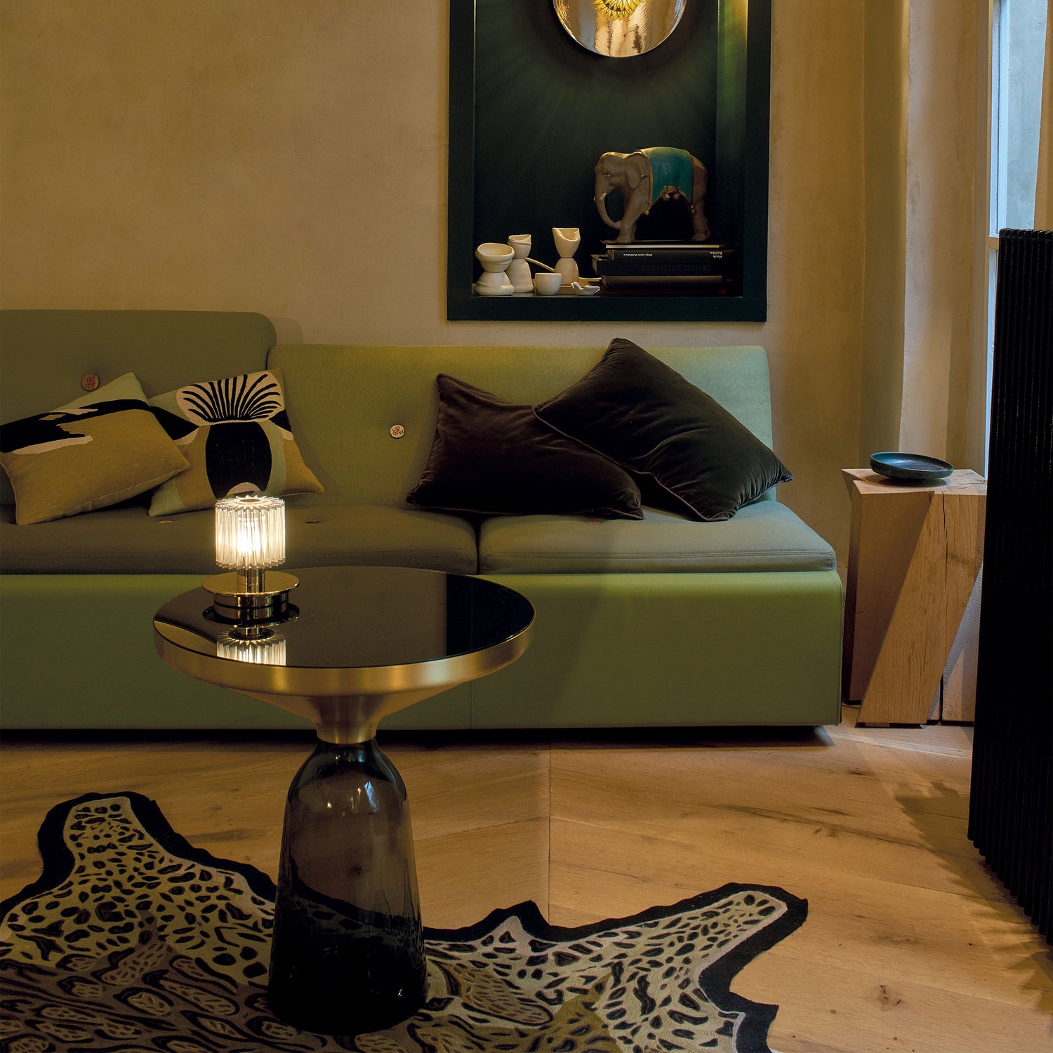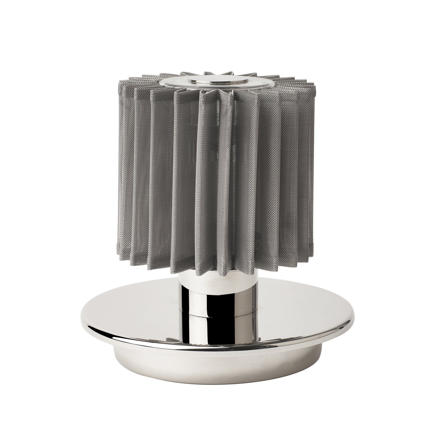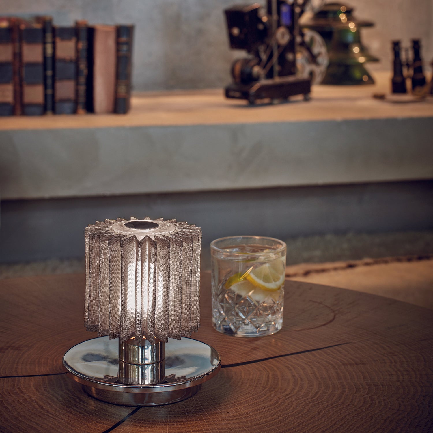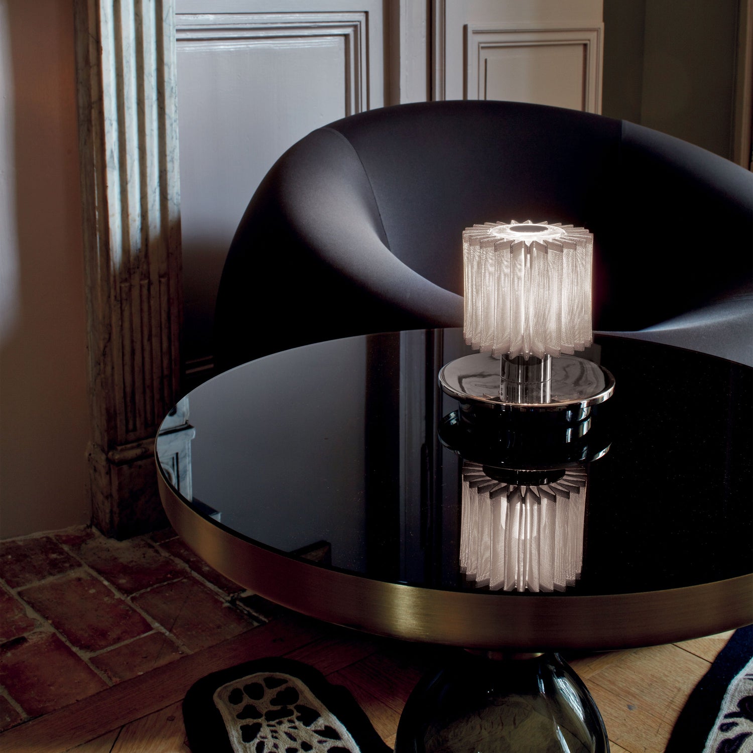 Cordless table lamp powered by a rechargeable battery. The In The Sun collection designed by Dominique Perrault and Galle Lauriot-Pr¨¦vost pays homage to the Sun King. Its 5-position switch lets you vary the light intensity, and bathes the table that hosts it with its joyful lights and festive shadows. This table lamp, a real jewel candle, is part of the Cordless Collection.