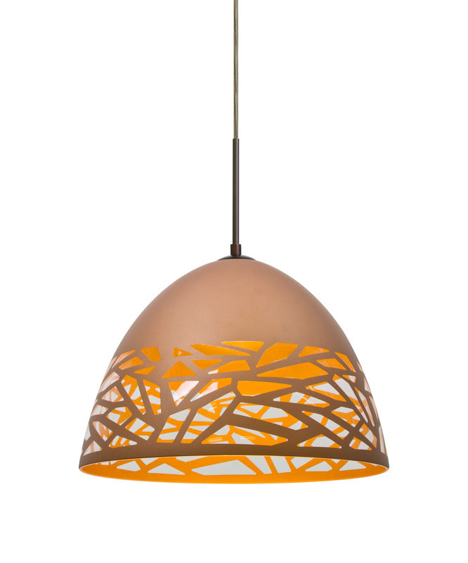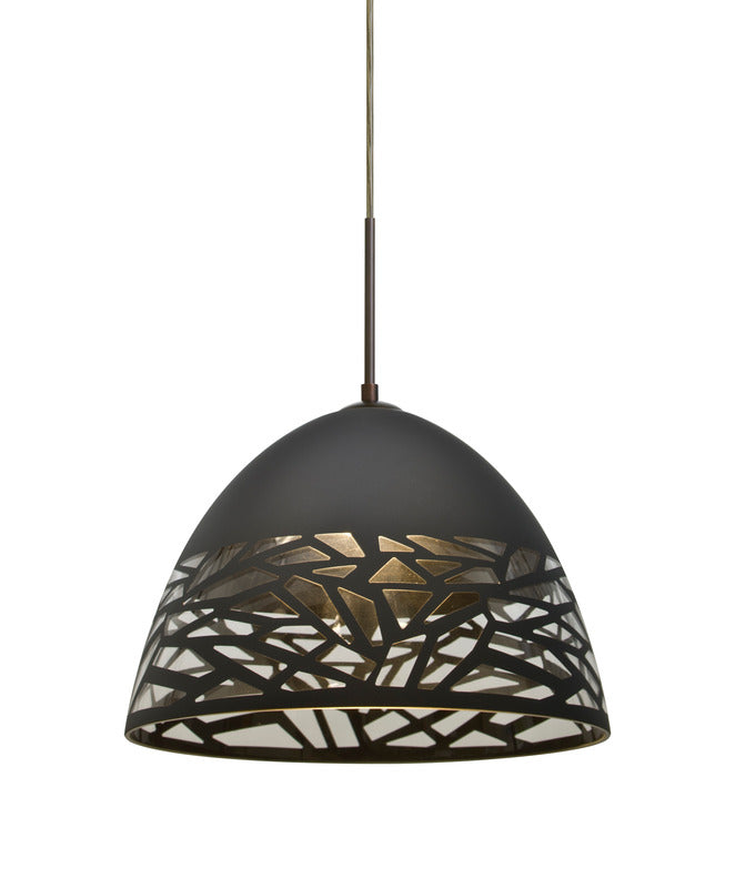 The Kiev Pendant features a unique shade that melds the beauty of shimmering glass with the visual advantages of cut metal, which results in a compelling optical display in a smartly modern design. With random stenciled openings placed throughout the bottom portion of this pendant, the concealed light source focuses the eye through the multi-dimensional sightlines while allowing for a eye-catching sparkle from the exposed glass and dramatic play of light through the accents and onto adjacent surfaces. The cord pendant fixture is equipped with a 10 feet cordset and an low profile flat monopolist canopy. These stylish and functional luminaries are offered in a beautiful Satin Nickel or Bronze finish.