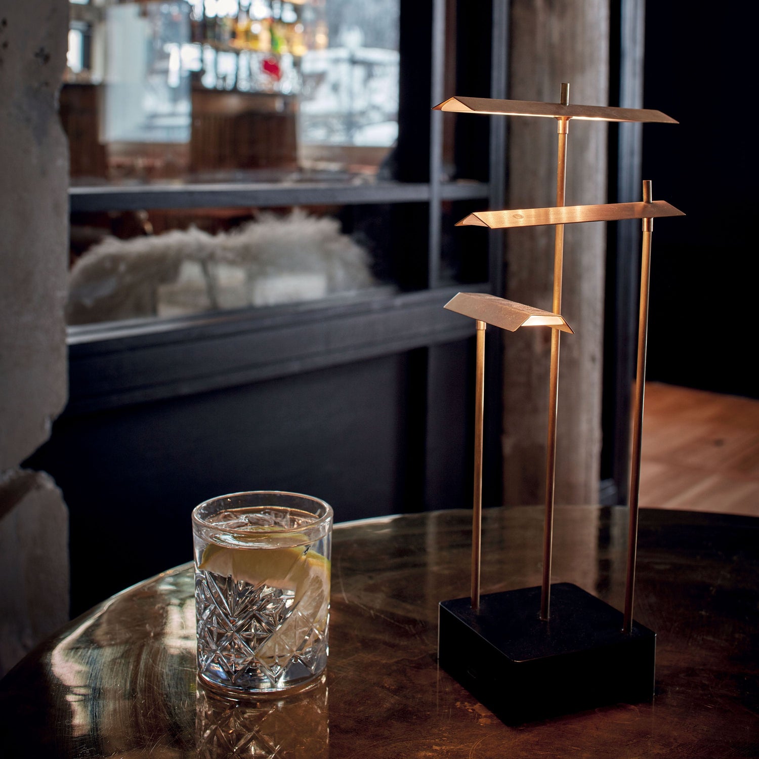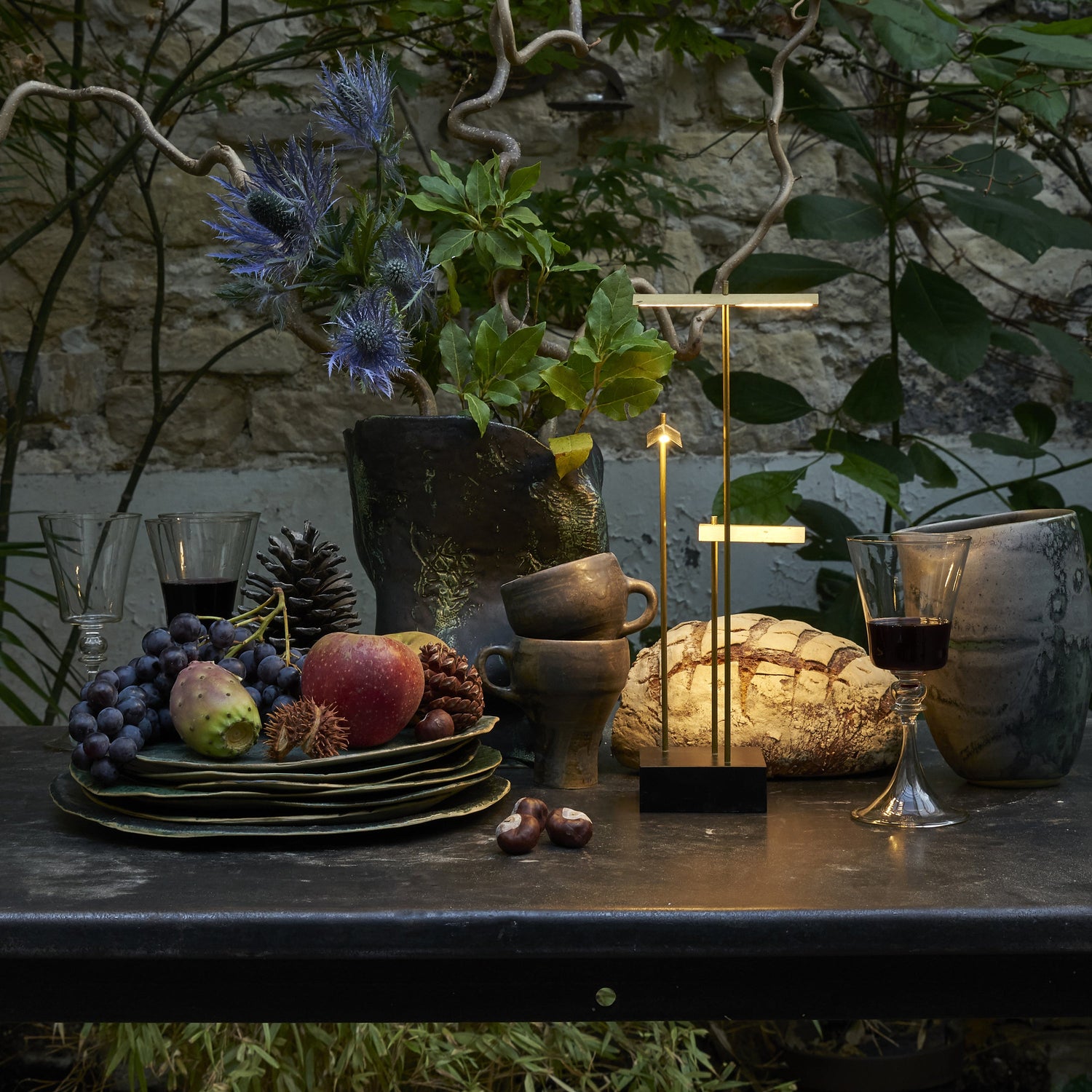 Cordless table lamp in steel and brass. Eric de Dormael, artist and sculptor, invites sharing, confidence and delicacy through a magical light, a chiaroscuro typical of candles. This jewel of light placed on a coffee table, bookcase or arbor opens up to the joy of meeting and lends the moment a sacred character.