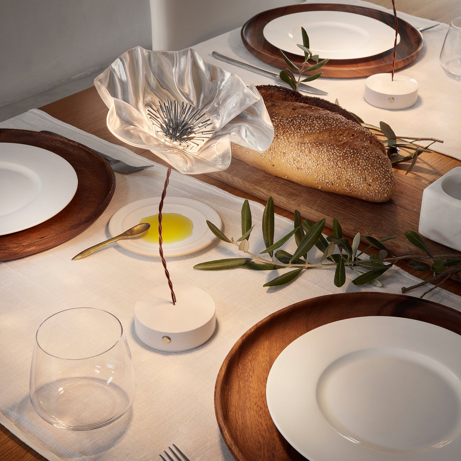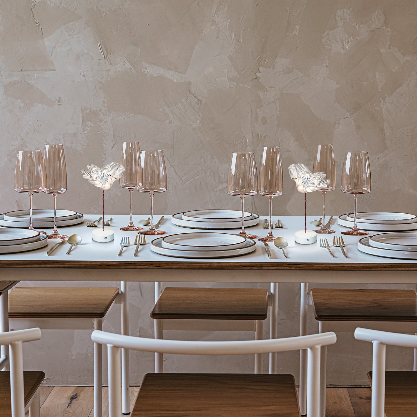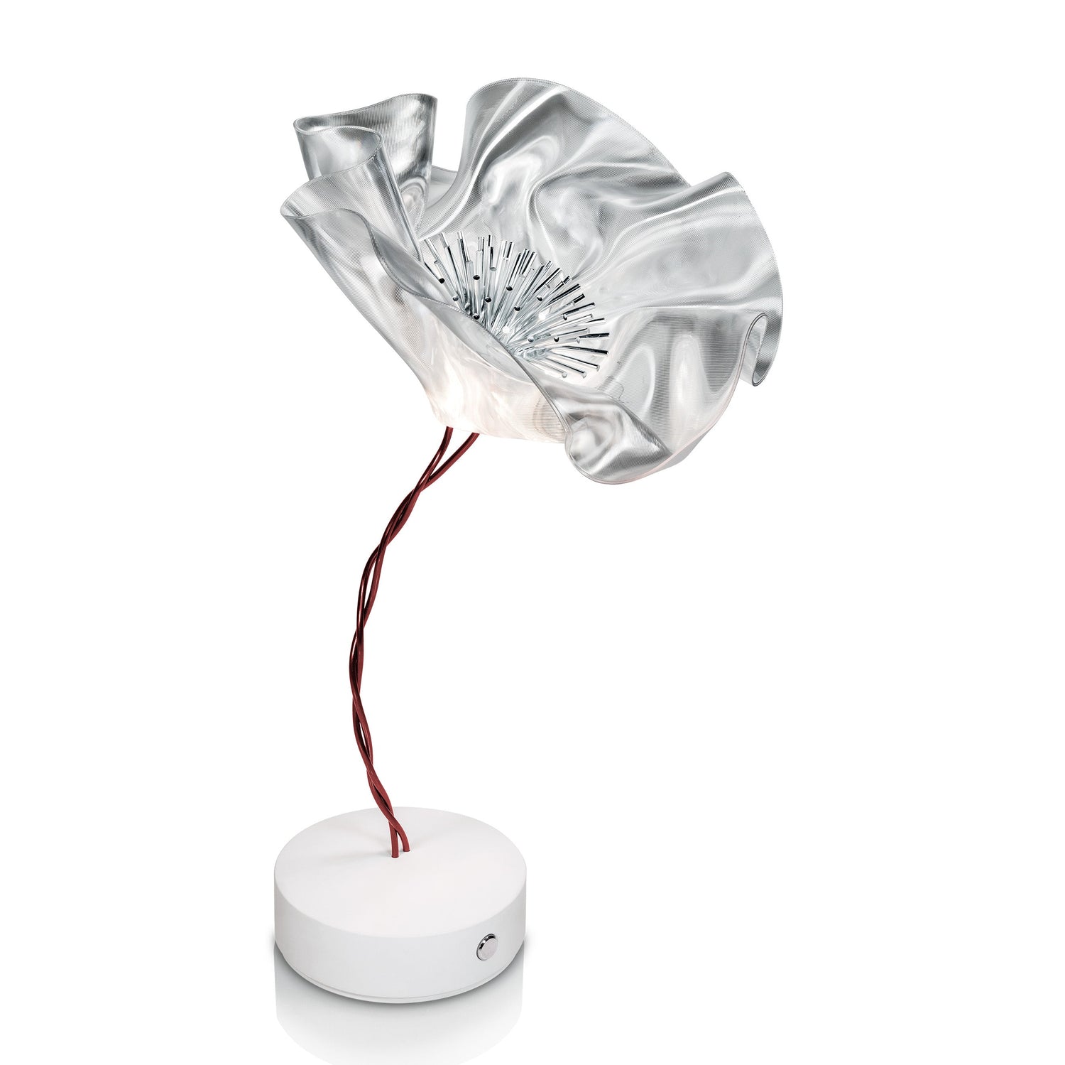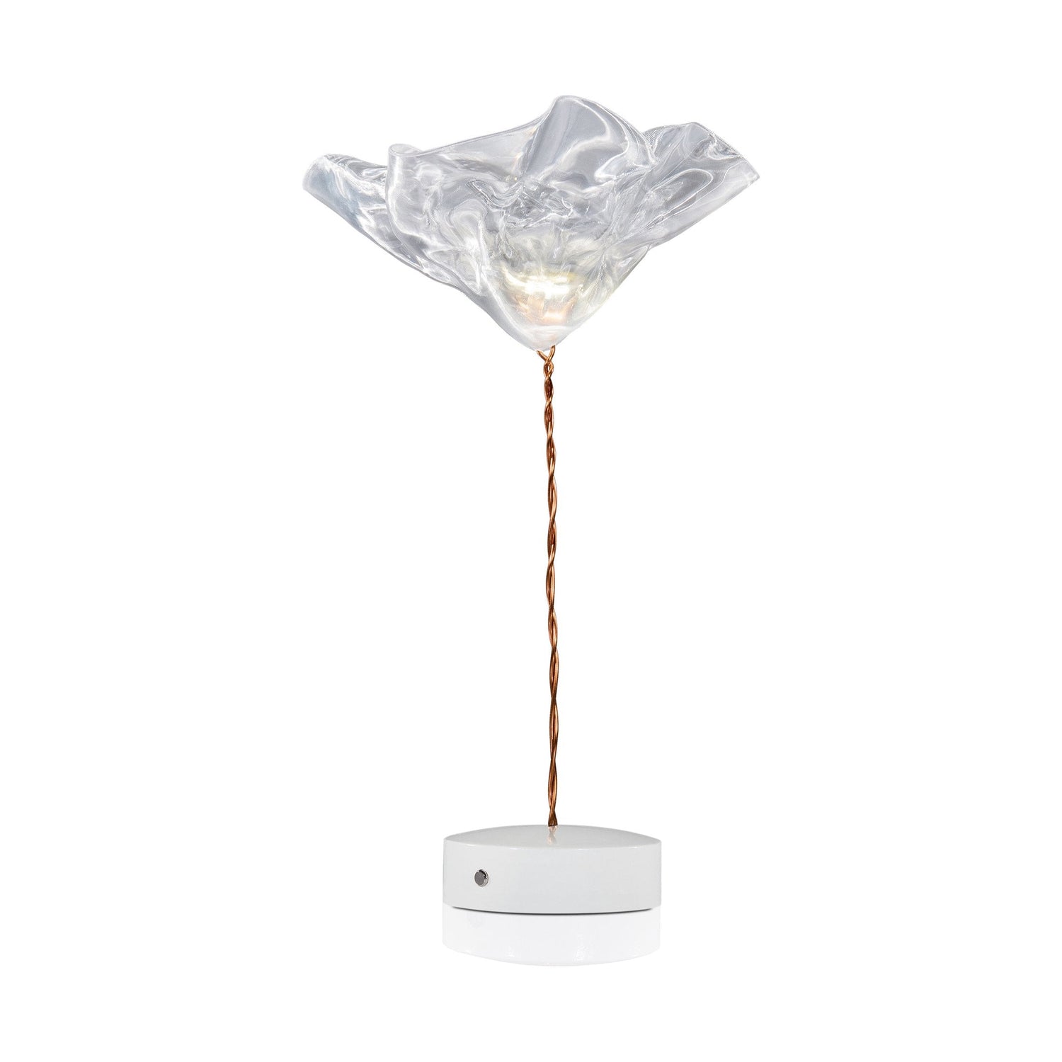 Marc Sadler was driven by the desire to move beyond the known and find a new compositional language while shaping Slamp's technopolymers. The delicate, delectable, and rechargeable Lafleur battery-powered table lamp is formed by heating Lentiflex at a controlled temperature and then hand-molding it to create the blossom. The lamp has a magnetic base and comes with a complimentary metal anchor, fit to go under a tablecloth for a whimsical mise-en-place, or screwed into the wall, turning Lafleur into an applique.