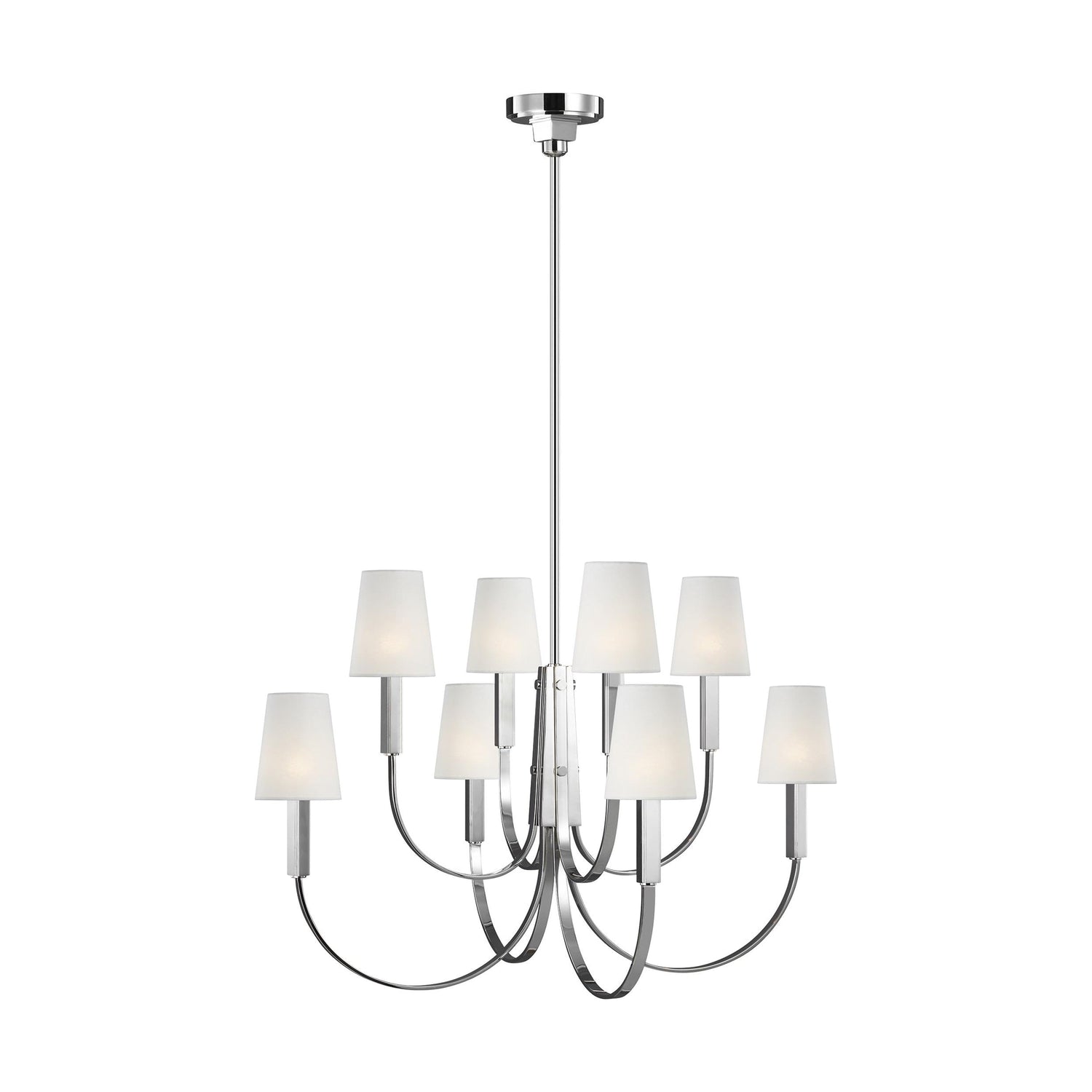 The Thomas O'Brien Logan Chandelier has graceful, arc-shaped arms stemming from a square-shaped center. Square-shaped candles are topped with tapered linen shades. Available with four lights (single tier) or eight lights (multi tier) and finished in Aged Iron or Polished Nickel. The Logan family of products from TOB Thomas O'Brien for Generation Lighting mirrors Thomas' masterful design aesthetic of bridging traditional and modern styles.