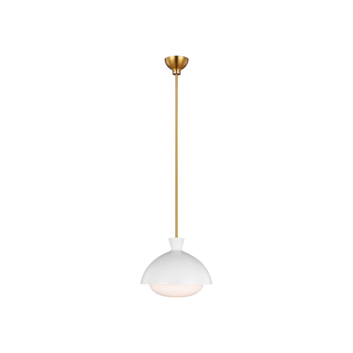 The Aerin Lucerne one light indoor pendant in burnished brass is a minimalist light designed with an overhanging shade that eliminates glare, while the white glass casts a soft glow. This style is particularly suited to kitchens, hanging as a single or pair over a breakfast bar.