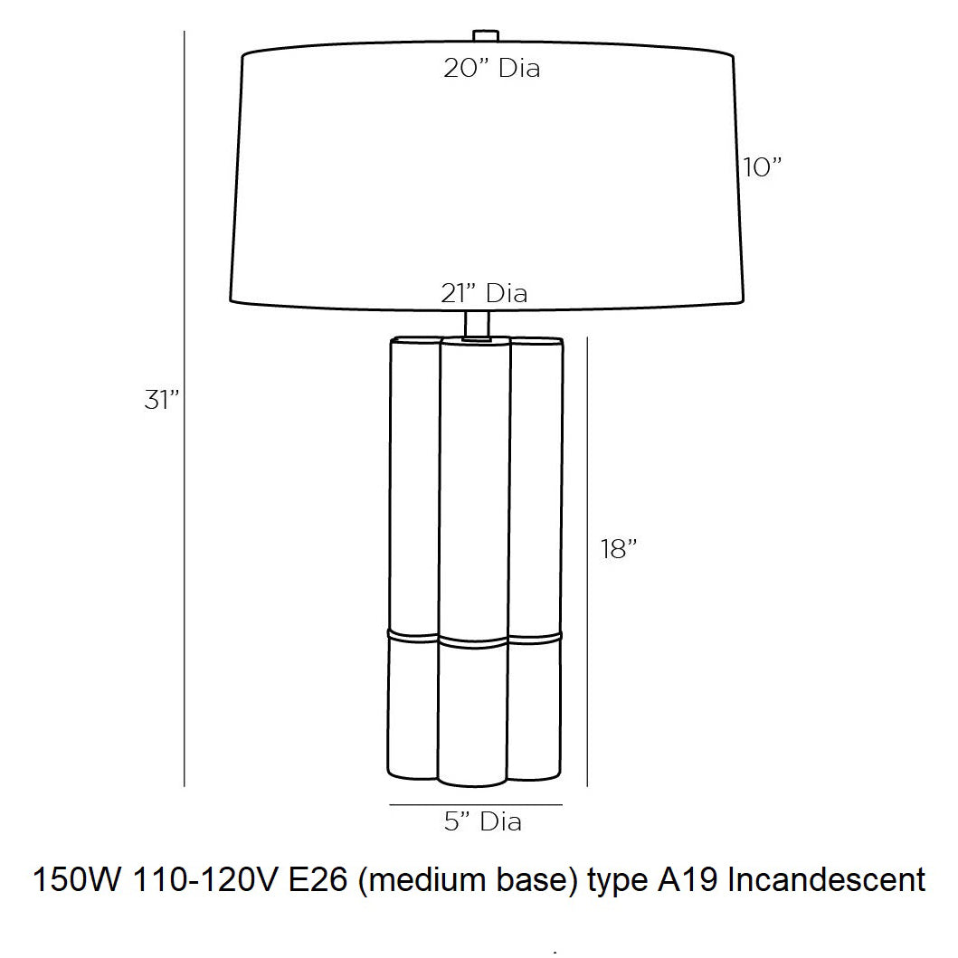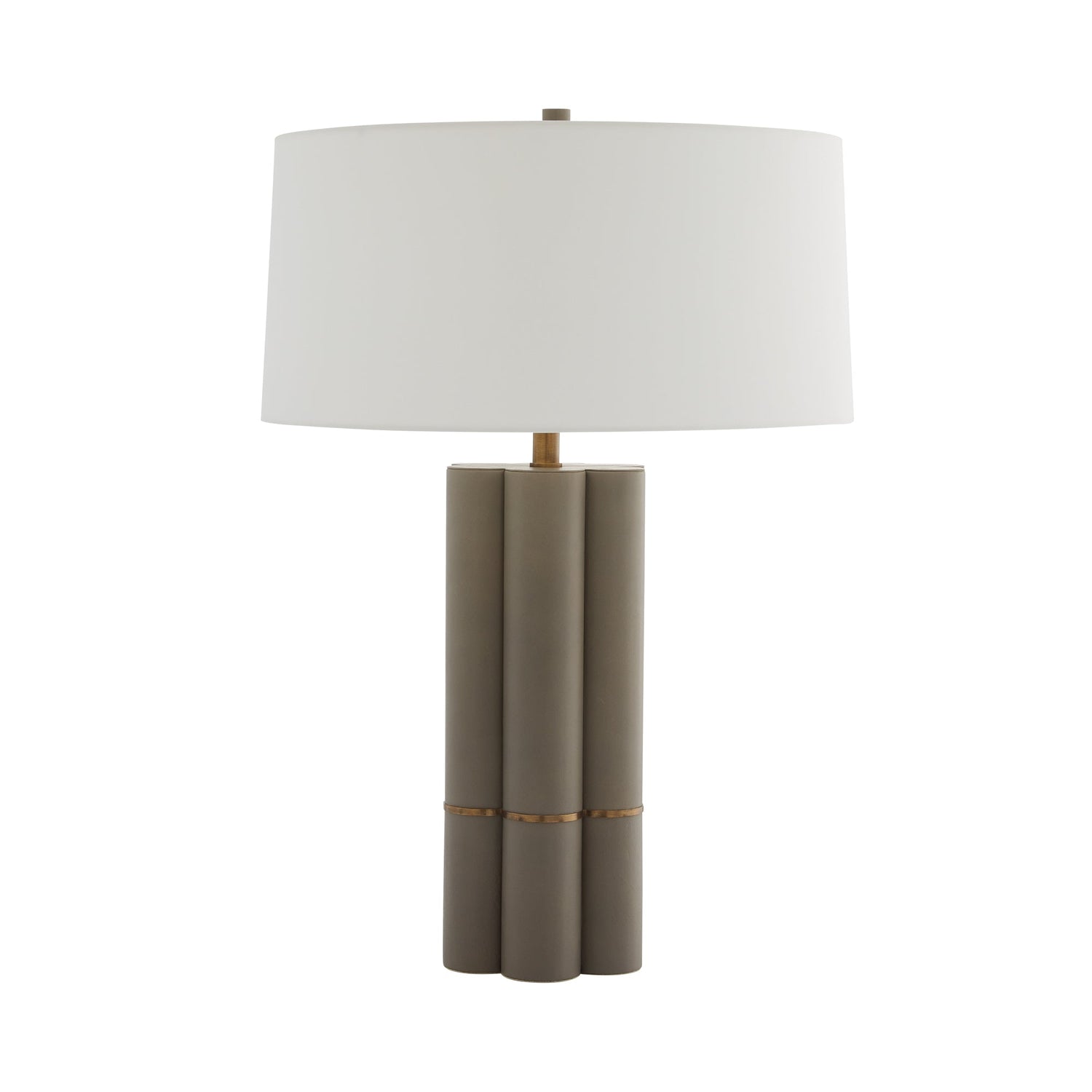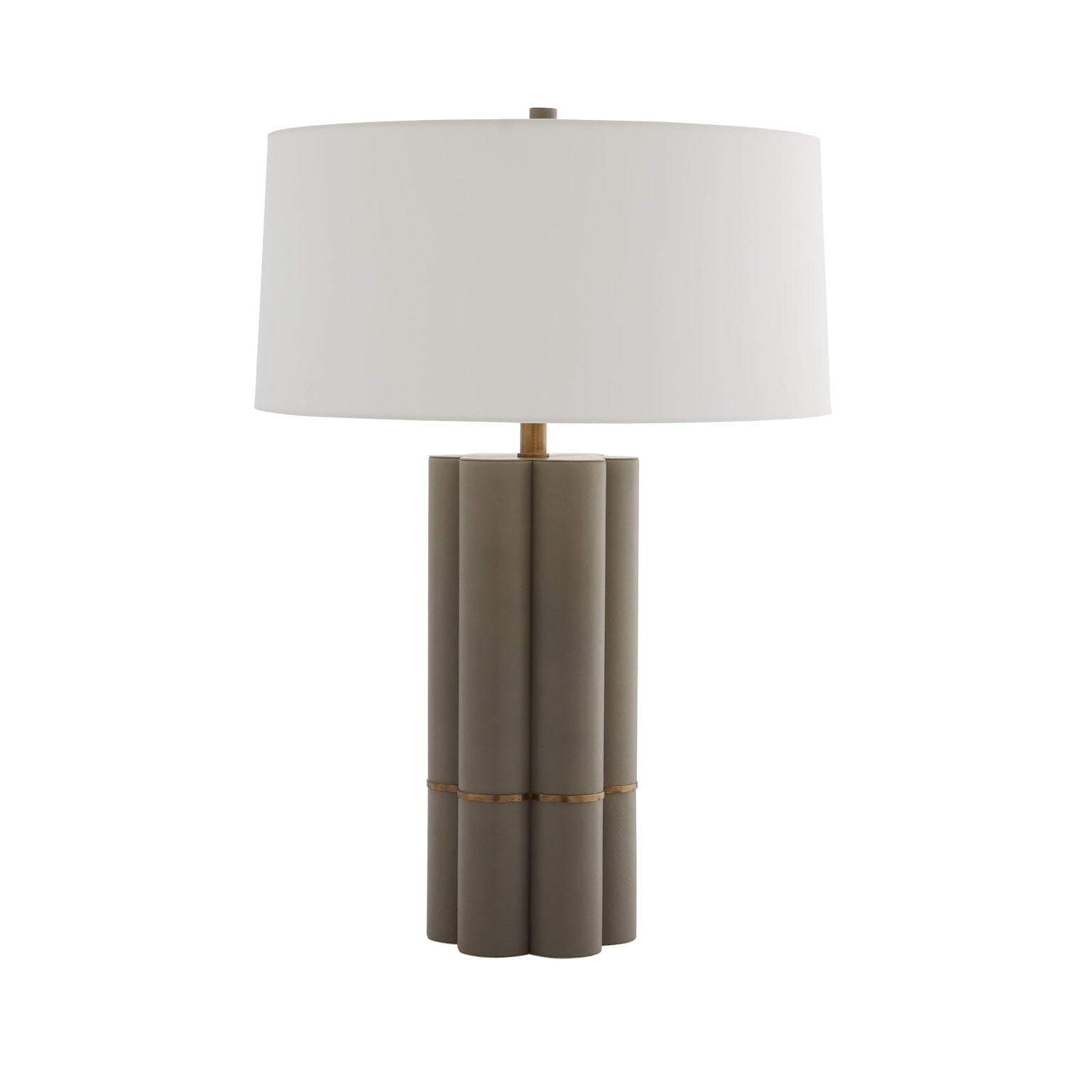The unique scalloped column shape of the Maddie finds inspiration in classic sculptural form. The dove leather construction is met with a thin antique brass band that accentuates and calls attention to its unconventional but refined form. Topped with an off-white microfiber drum shade with an off-white cotton lining and a matching leather cylinder finial. Finish will vary.