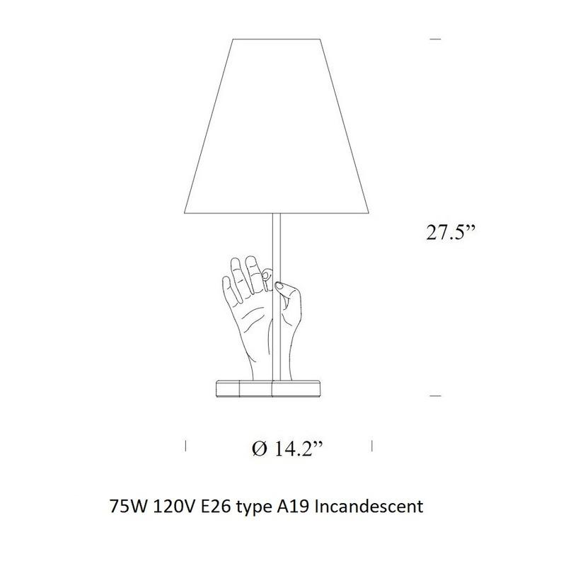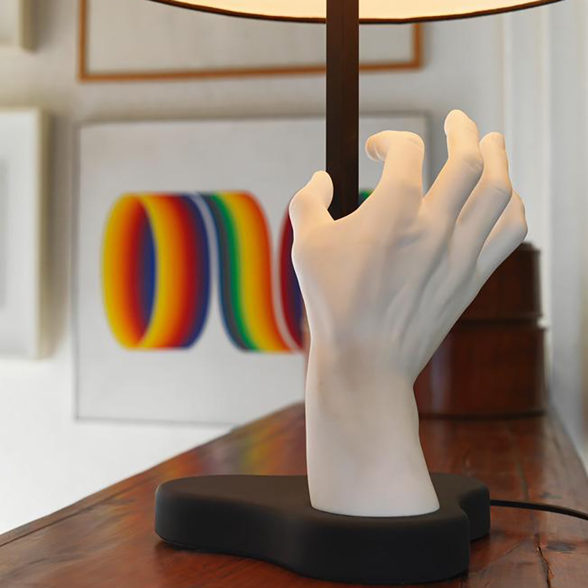 The Manon Table Lamp, a trendsetter thanks to its irony and elegance, comprises a base and hand in marble powder and resin and a square section stem in metal. The diffuser is in black fabric.