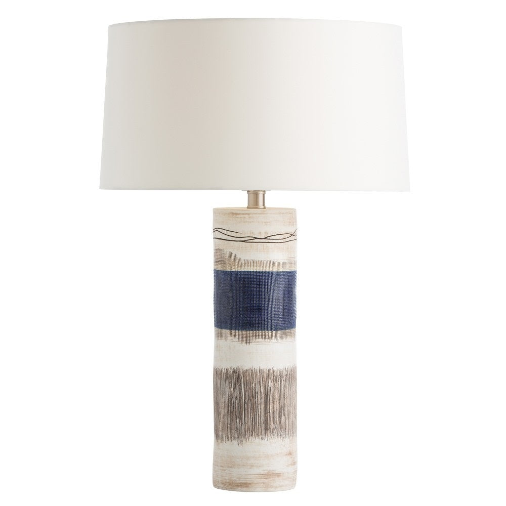 The Mariella Lamp showcases the best of Portuguese artistry to provide form and function. This porcelain piece features crosshatch detailing with brown and blue accents that accent each hand detail. Topped with a round drum ivory microfiber shade lined to match.