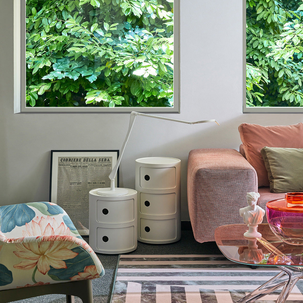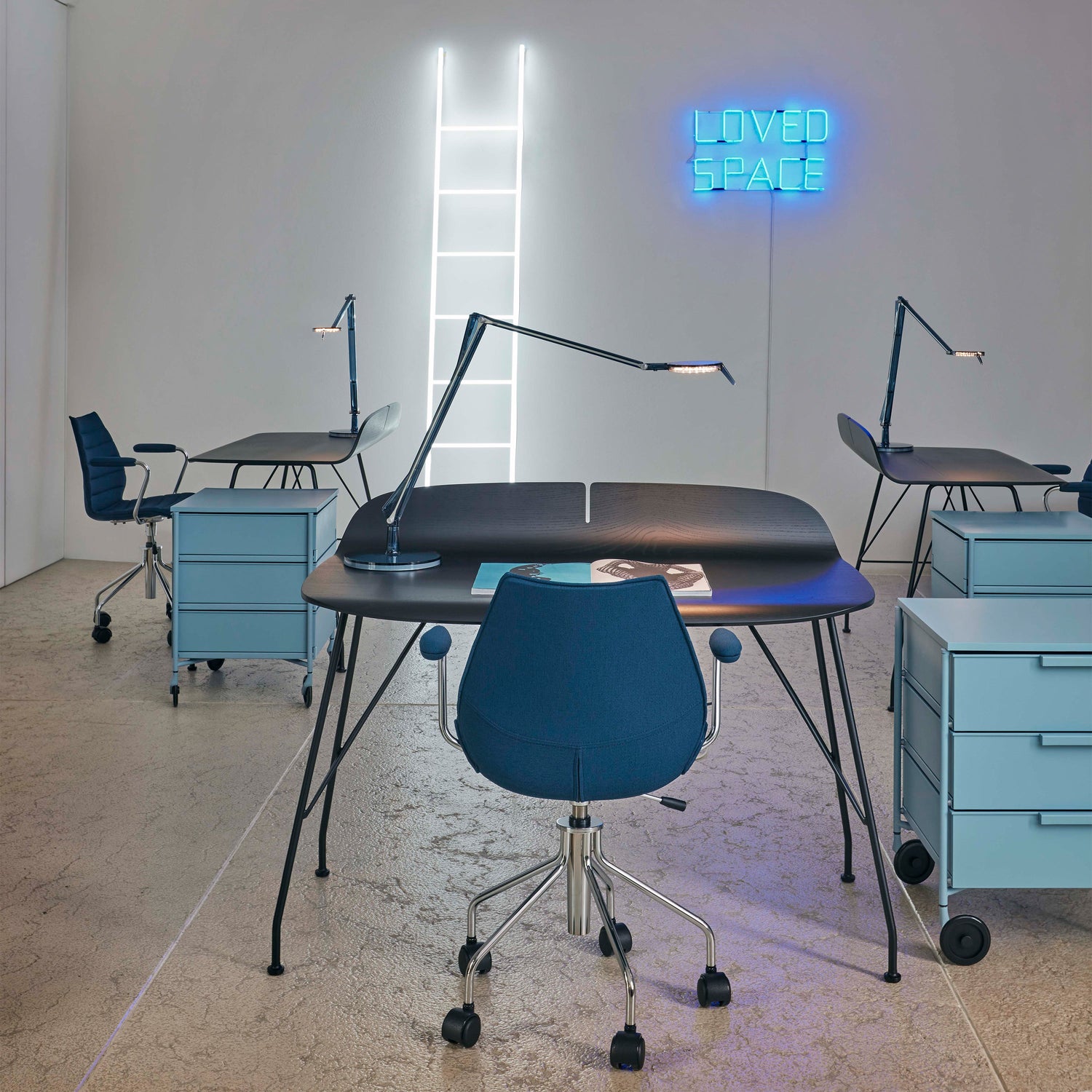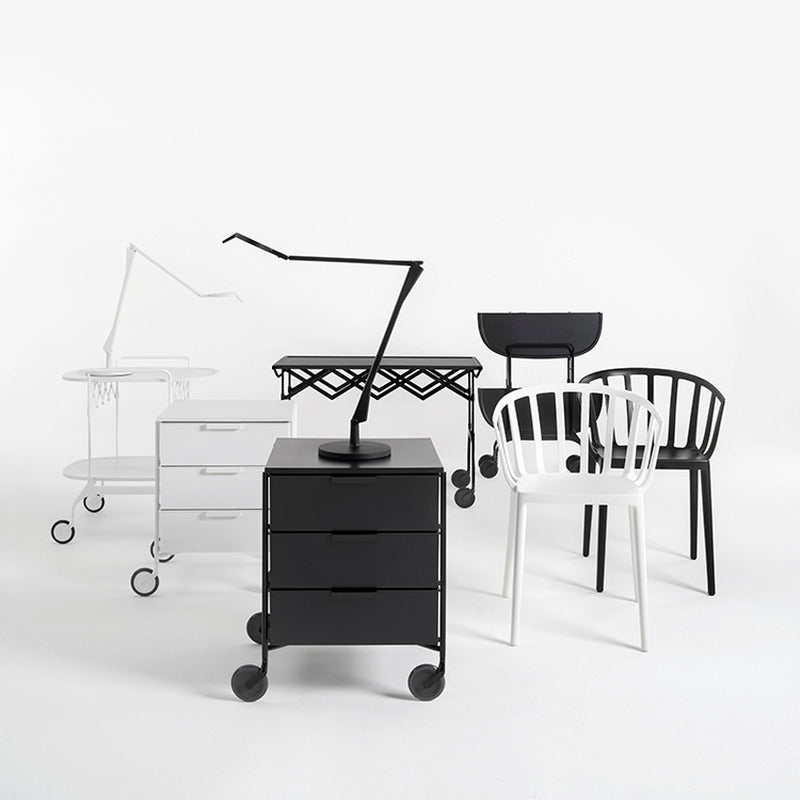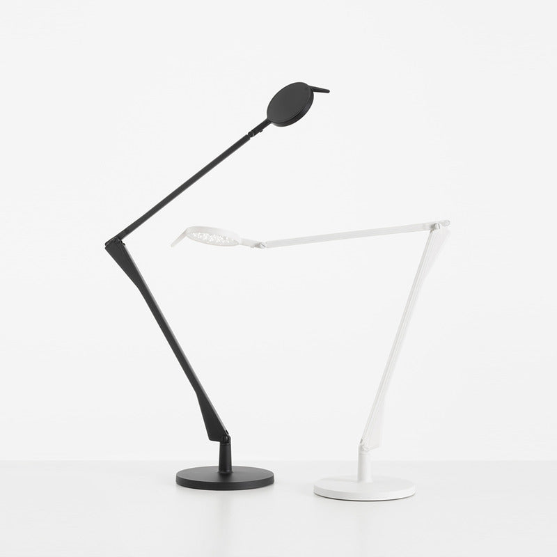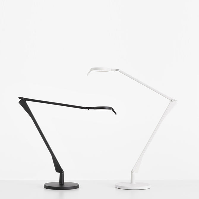 This led table lamp for office use, designed by Alberto and Francesco Meda, has a technological heart with aluminum rods performing the role of conductors in place of the traditional wire. The transparent variant of the Tec version is now joined by two new variants, in white and black.