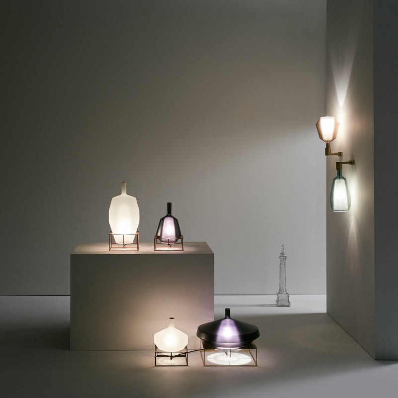 M.O.M. is a collection, made of borosilicate glass, where pendants can be put together freely. The smooth rounded corners, obtained by particular radius of curvature, remind to manufacturing of precious stones, while the coloring (made with a particular oxidizing process) and the matte finishing give back a soft and graceful surface.
