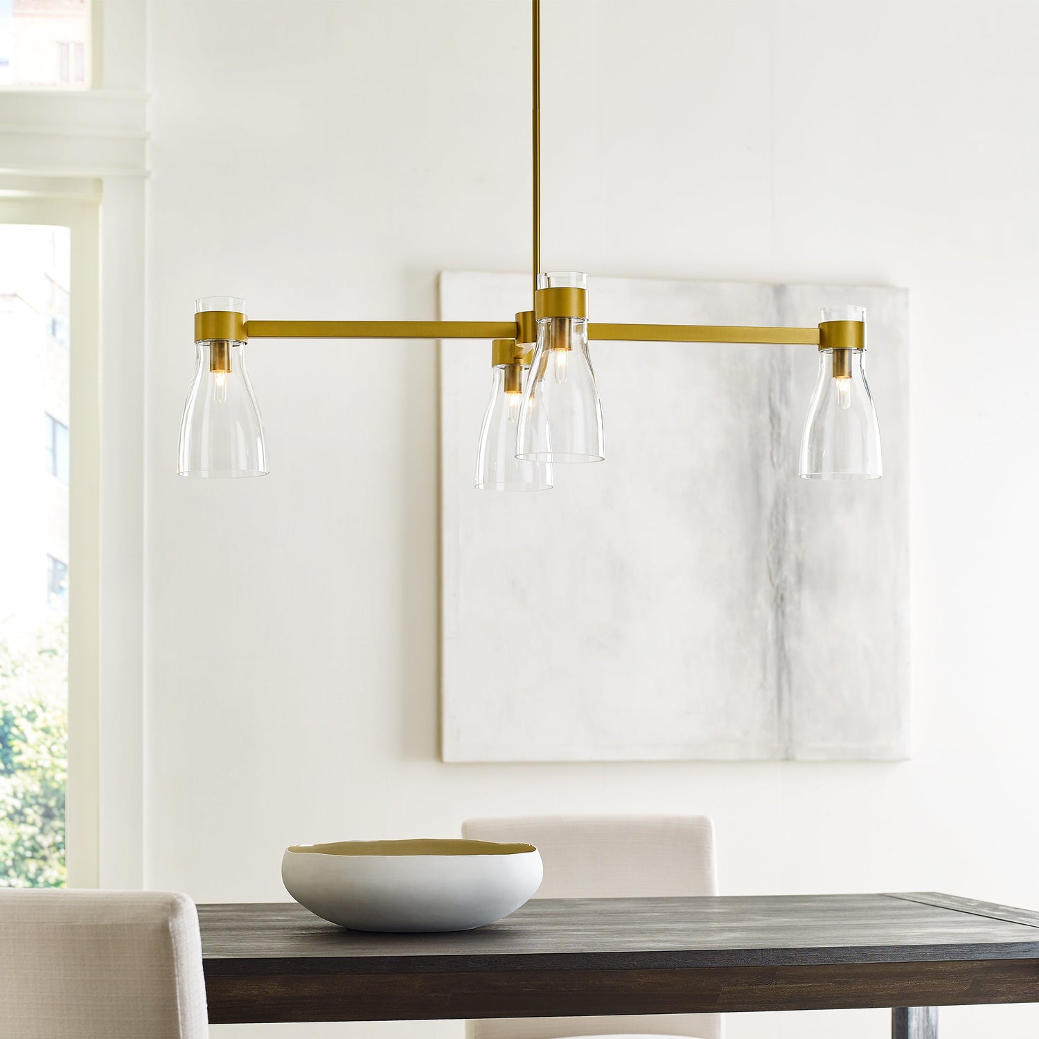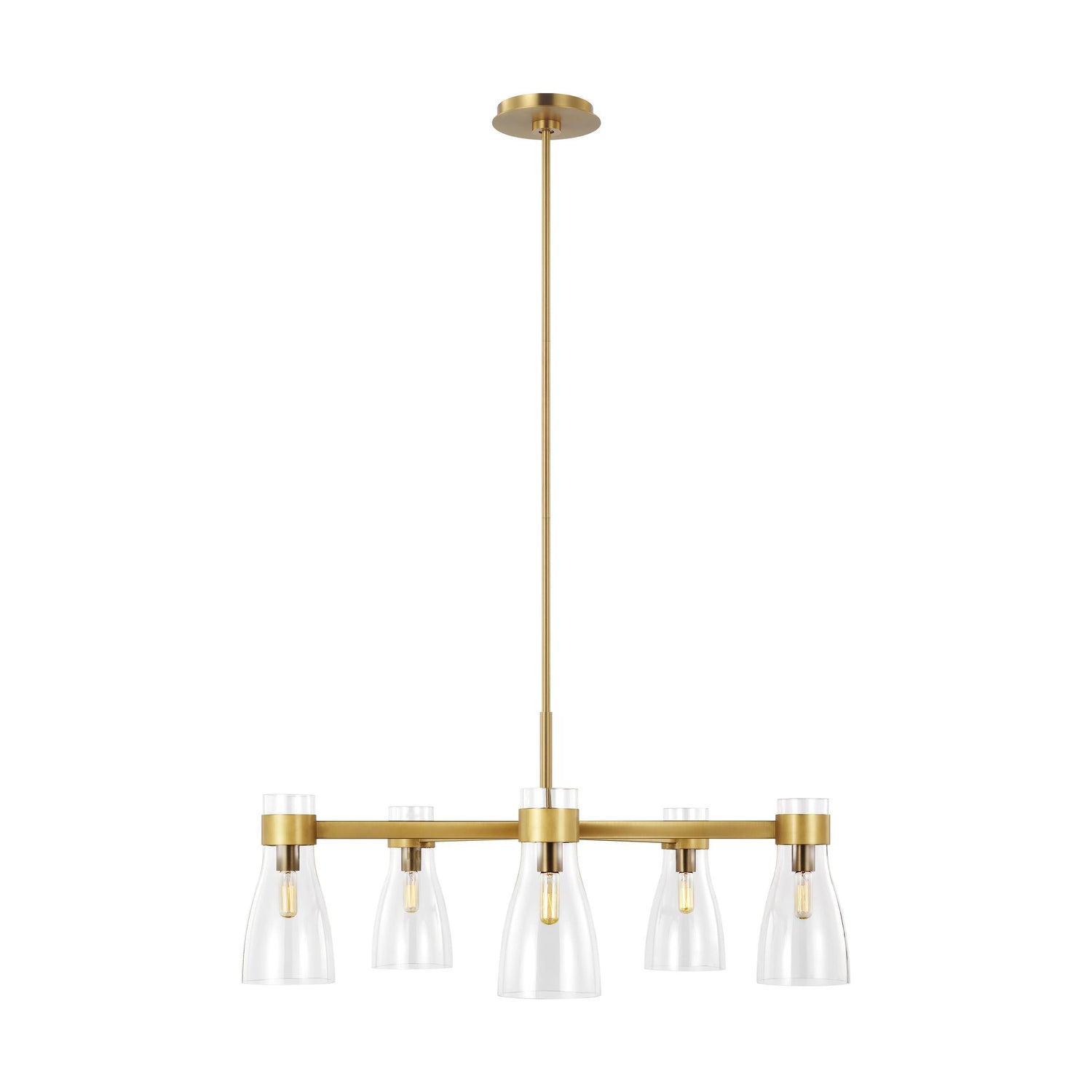 The Aerin Moritz chandelier is created around a linear frame that includes five glass shades originally inspired by the form of classic task lamps, giving it a contemporary twist. A beautiful focal point in living and dining rooms.