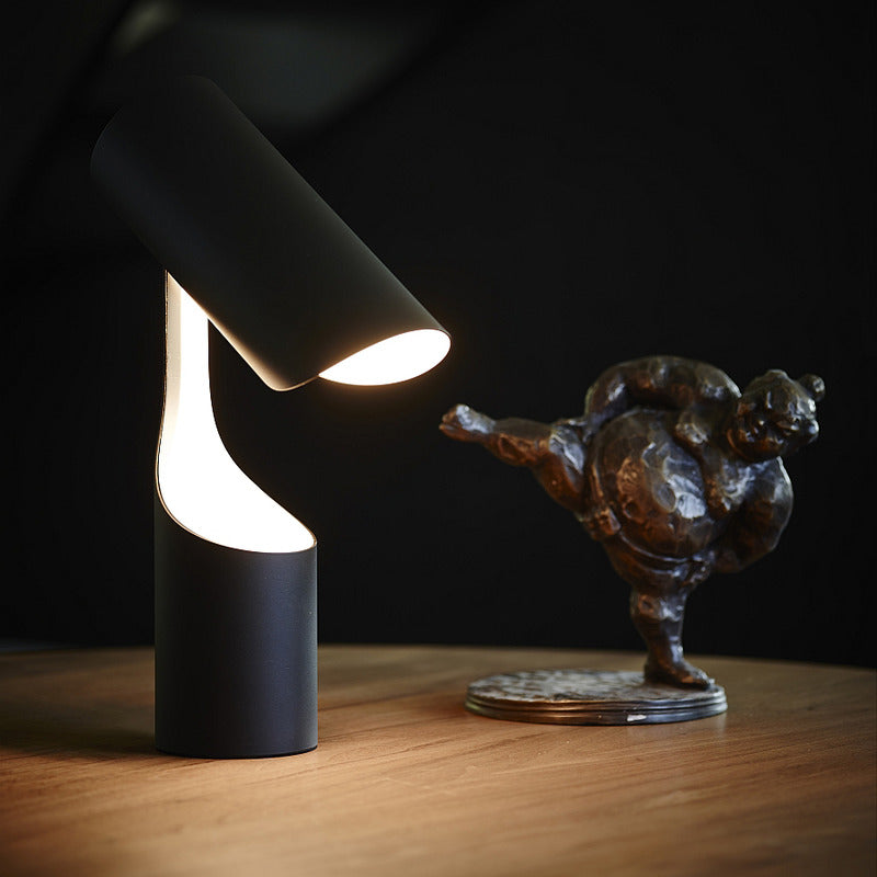 This latest design inspired by transformation and minimalistic geometry, discreetly has the on/off switch attached to the cord, allowing this beautiful matte black table lamp to stand freely in its cylinder form while engaging it's user into an experience when the black exterior is lifted to reveal light and a complimentary contrasting glossy white interior. Infinitely adjustable depending on where you want the light.