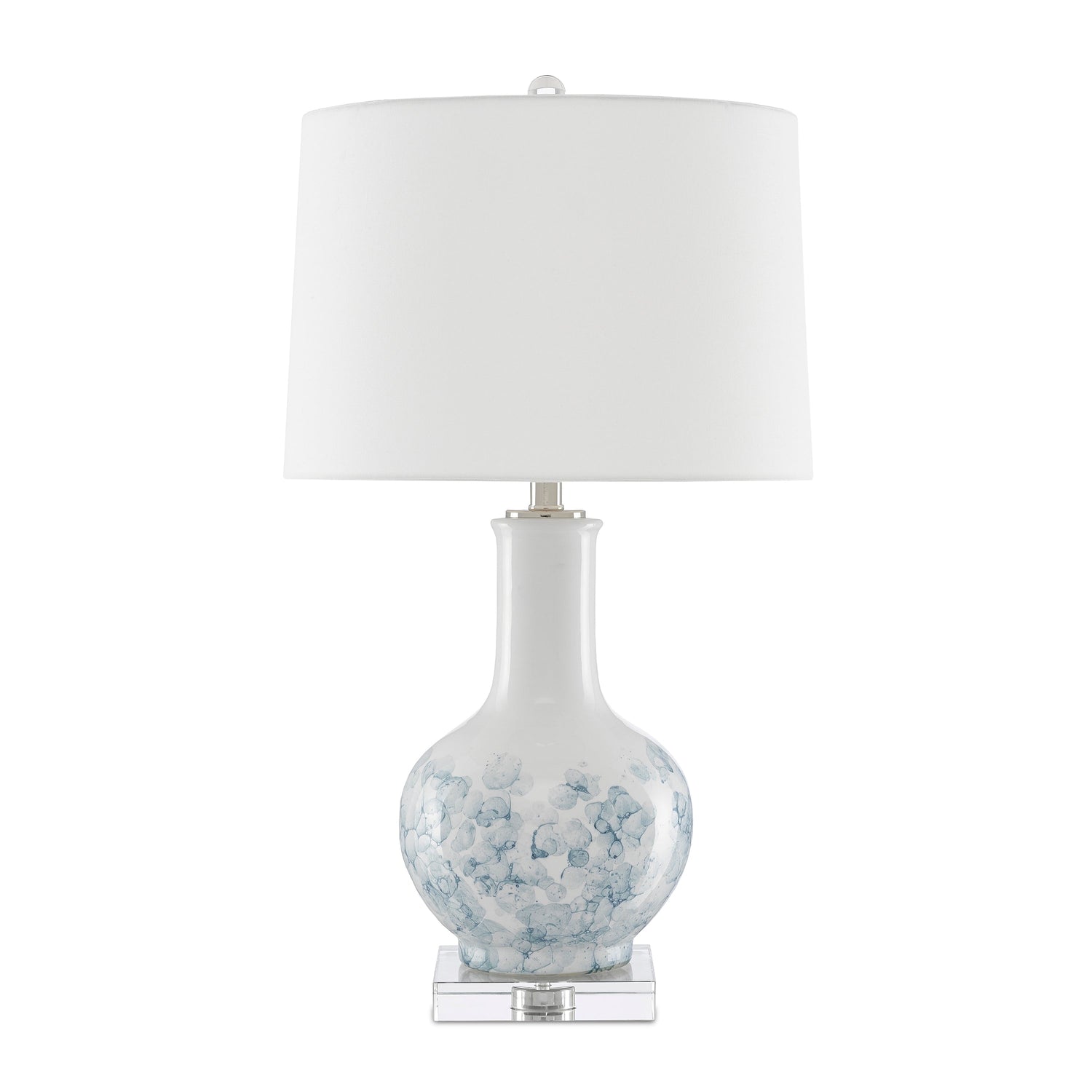 Like a resolute bouquet for a bedside table or a pretty den, the Myrtle Table Lamp is made of white and blue ceramic with whispery motifs that read as floral in nature. Sitting atop a clear optic crystal base, the white lamp has a decidedly feminine appeal. Metal hardware in a polished nickel finish and an optic crystal finial fasten the off-white linen drum shade to this lamp.
