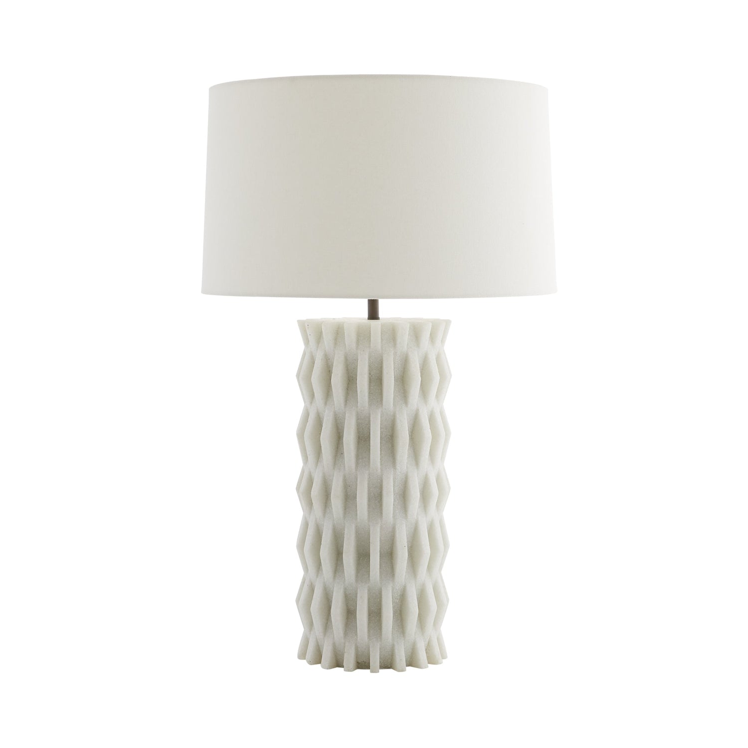 Inspired by modern Parisian architecture, the Nago's design is full of dimensional pattern and detail. The ivory rice stone construction features a deeply tactile, zig-zag design of layered rice stone shingles. Topped with an off-white linen drum shade with off-white cotton lining and a bronze sphere finial. Finish will vary.