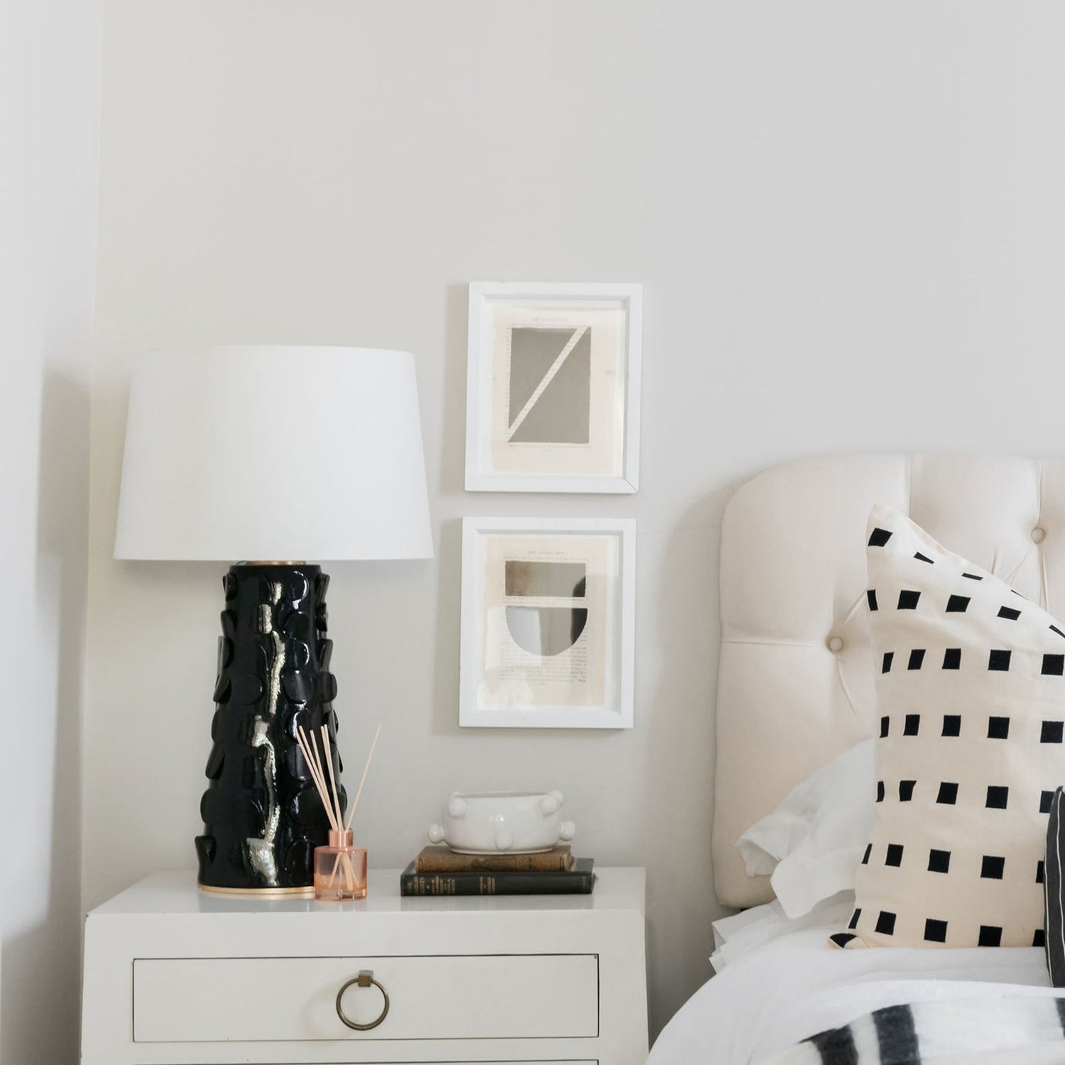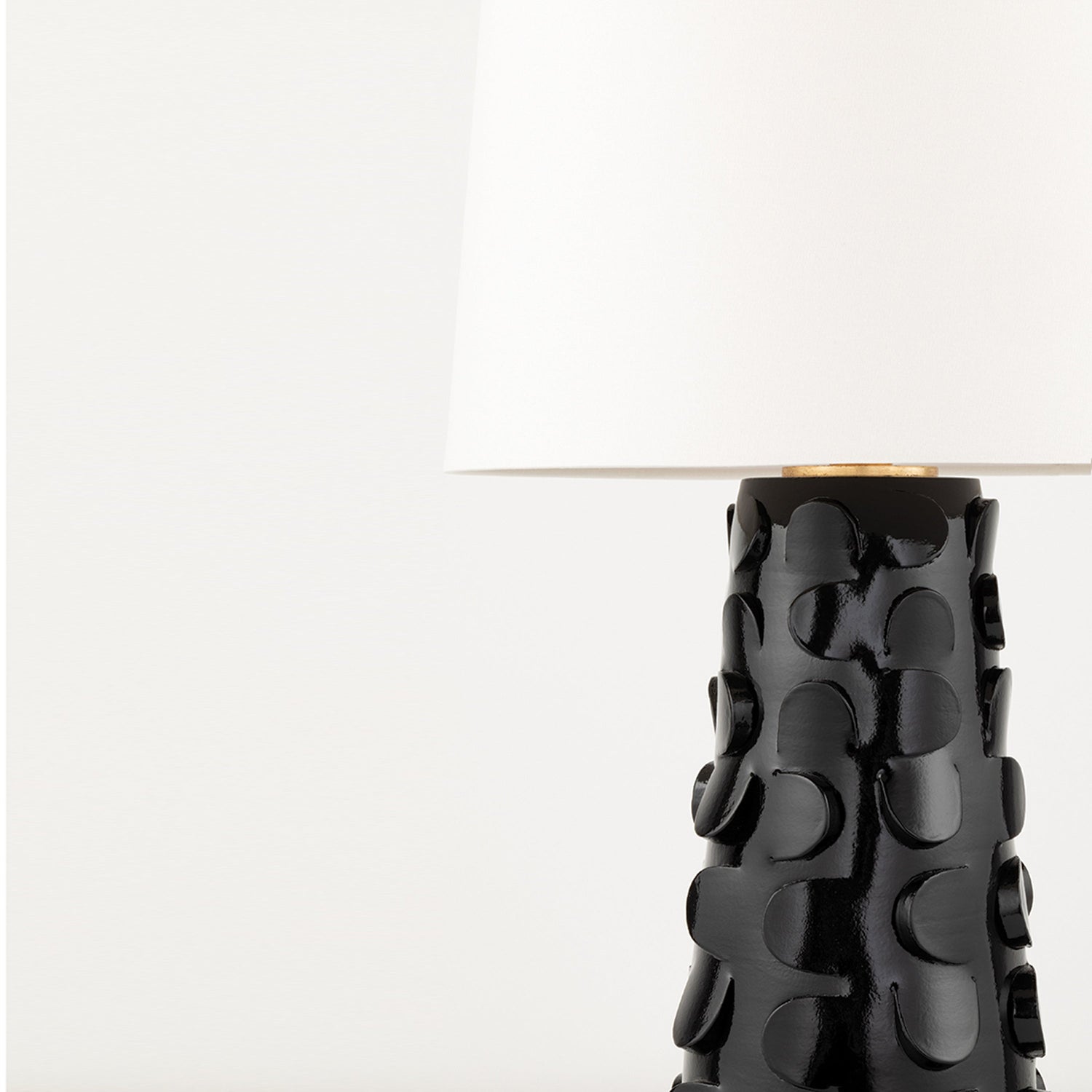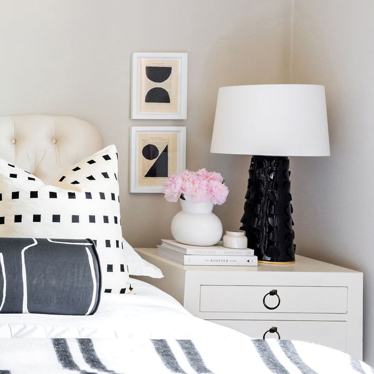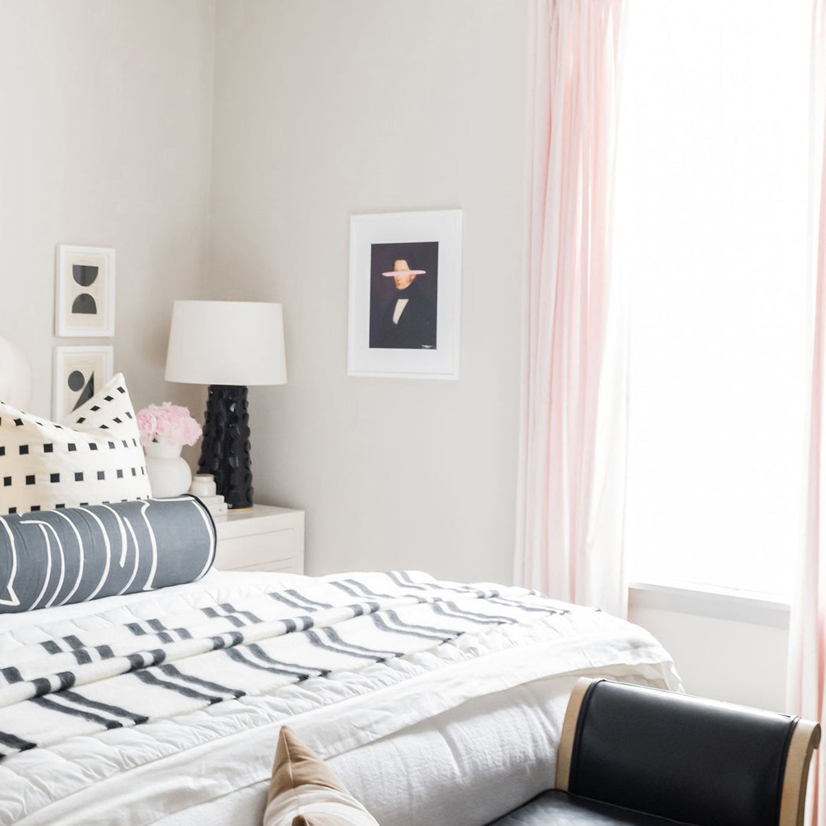 Chunky midcentury modern meets tongue-in-cheek post-modern design in Naomi. Very textural and a touch retro, the lamp's Belgian linen shade and two-tone finish give it a glam factor, too.