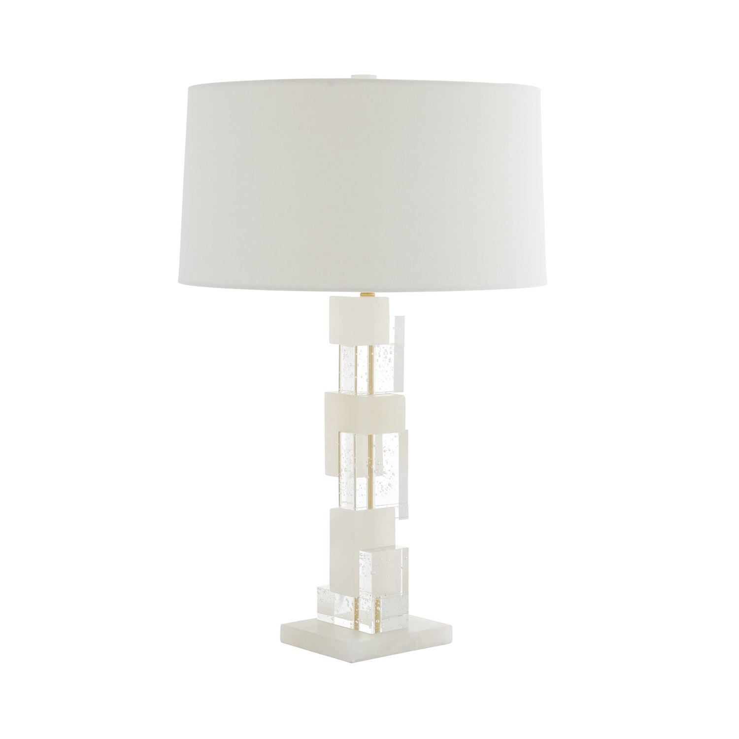 The architectural vision of theNicole focuses on the simplicity of geometric design. A combination of alternating white alabaster and clear seedy crystal blocks are stacked on a pale brass steel frame, in varying lengths and thickness. When illuminated, the light dances between the transparency of the crystal and the subtle opaqueness of alabaster. Topped with a white linen drum shade with a white cotton lining and a matching white alabaster square finial. Finish will vary.
