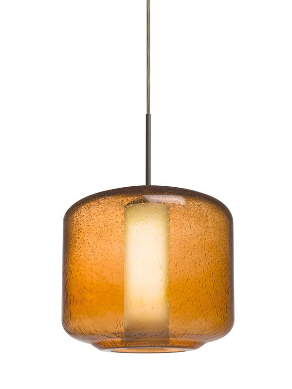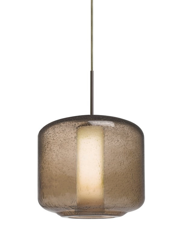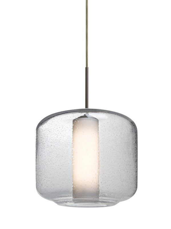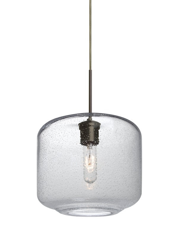 The Niles Pendant is composed of a broad transparent glass cylinder, with an interesting bubble pattern blown randomly throughout the glass and exposed light source. The pleasing play of light through the bubble accents make for a striking affect, along with the popular theme of this transitionally designed pendant. The cord pendant fixture is equipped with a 10 foot cordset and an low profile flat monopolist canopy. These stylish and functional luminaries are offered in a beautiful Satin Nickel or Bronze finish.