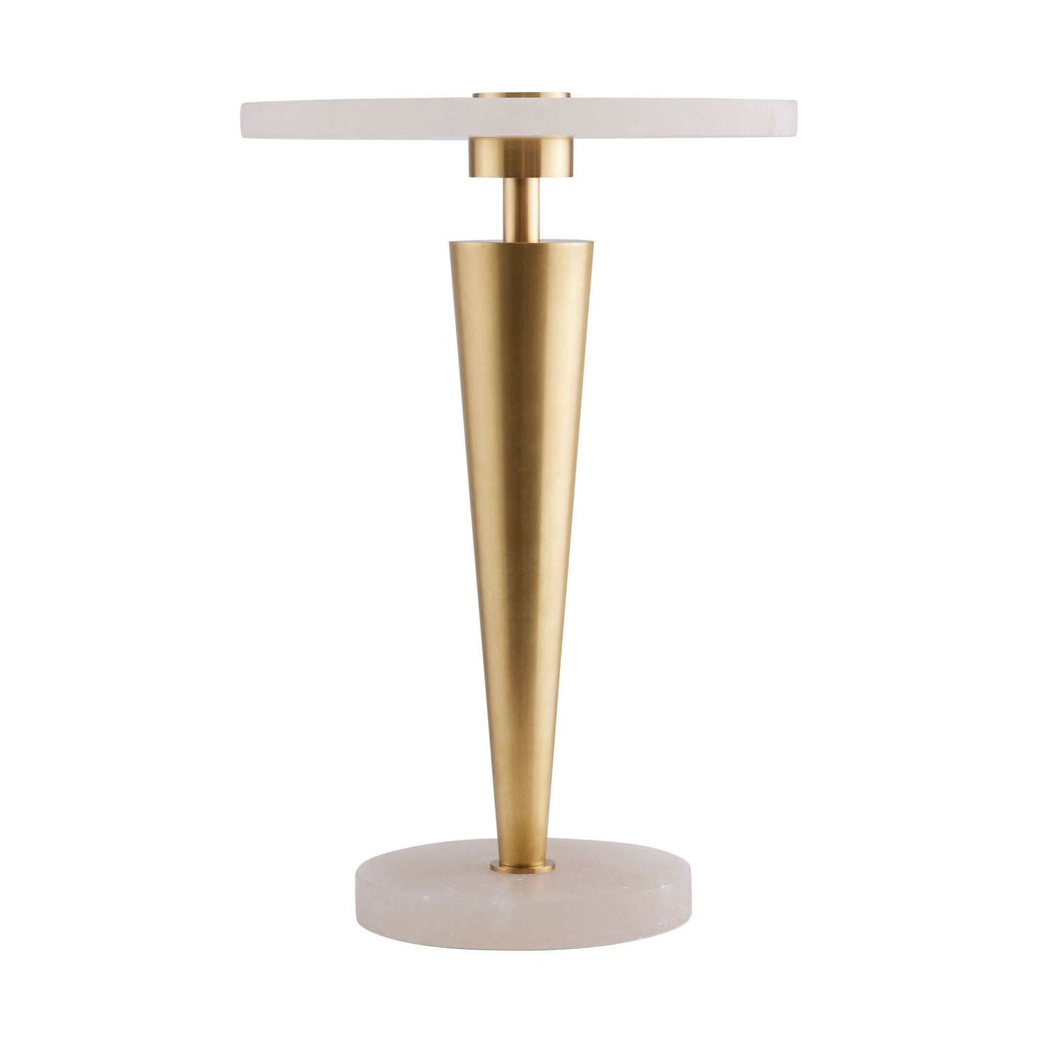 The low profile Art Deco-inspired silhouette of theNonnie provides a modern take on a classic style. A tapered antique brass iron frame on a white alabaster base showcases a matching alabaster ring top, which conceals an LED light for an ultra-modern aesthetic. Finish will vary.