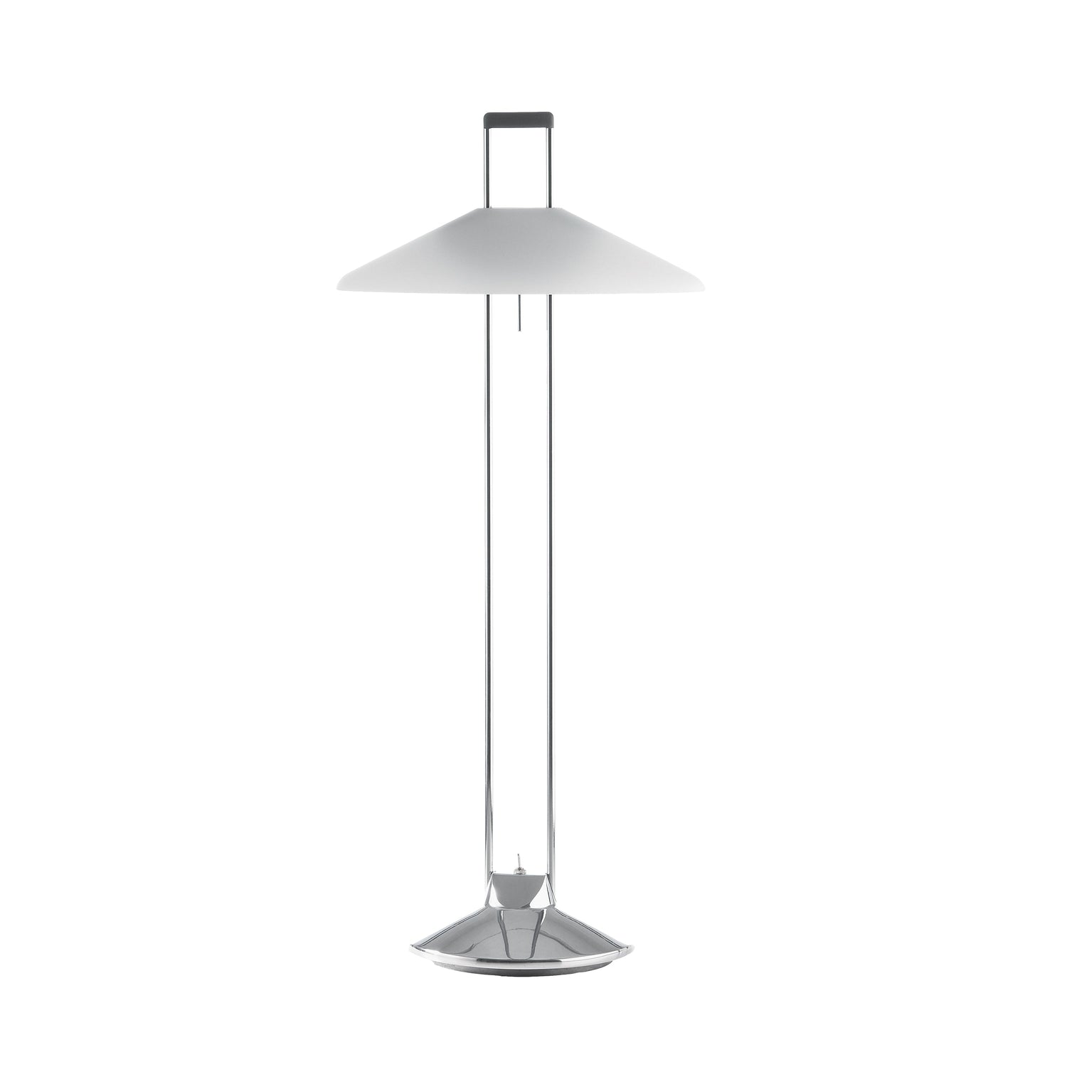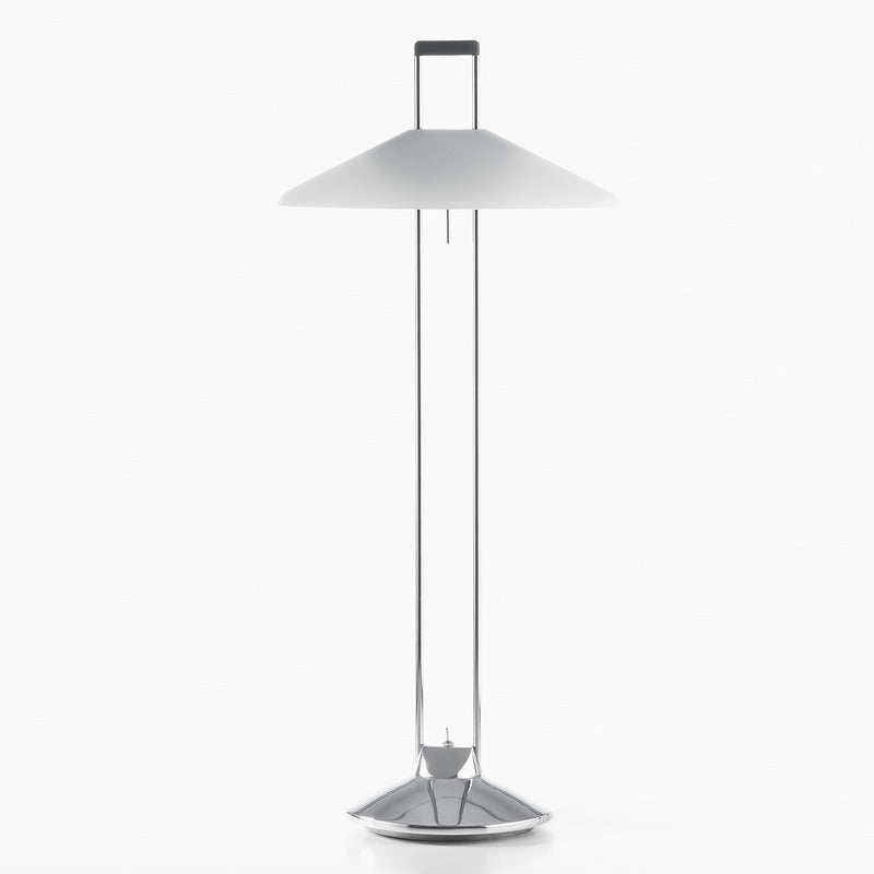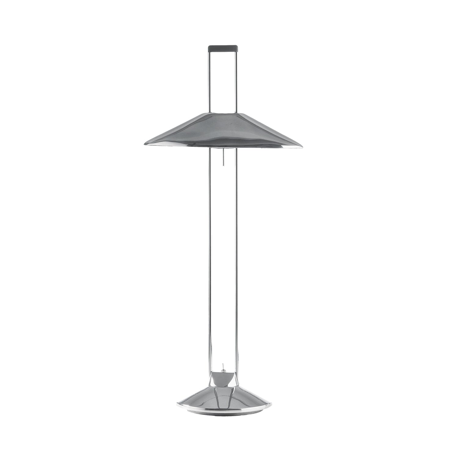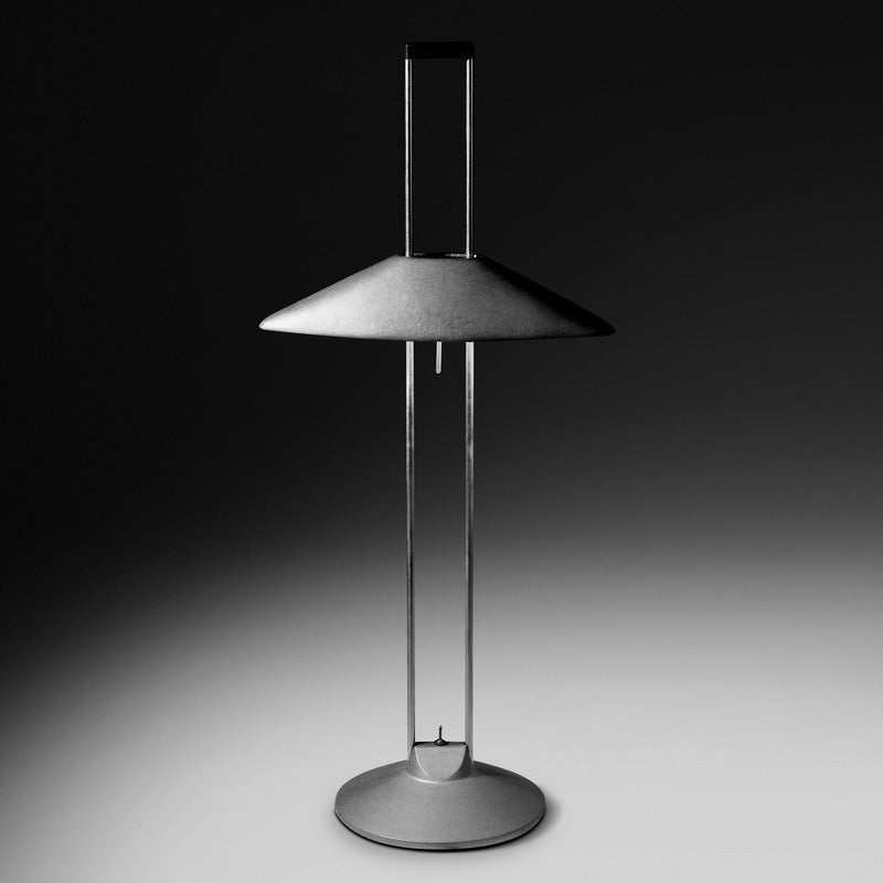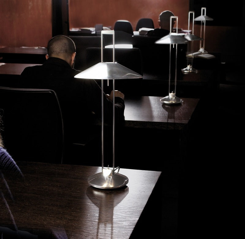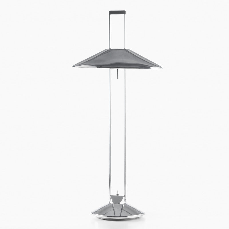 Indirect light table lamp crafted of die cast aluminum. Available in a raw finish, and also in gloss aluminum with shades in gloss aluminum or white glass.