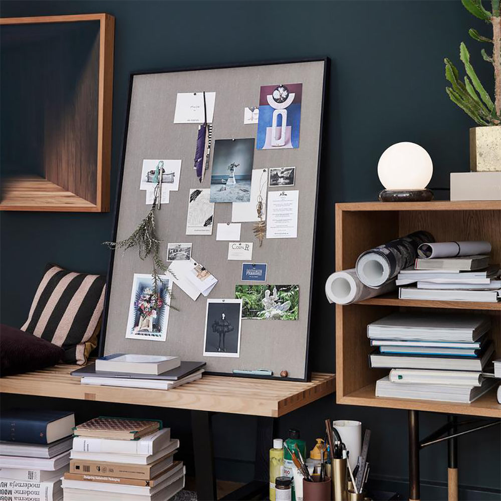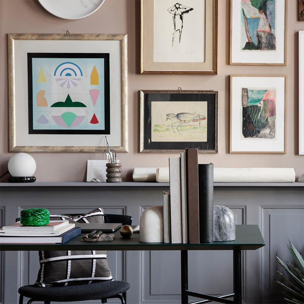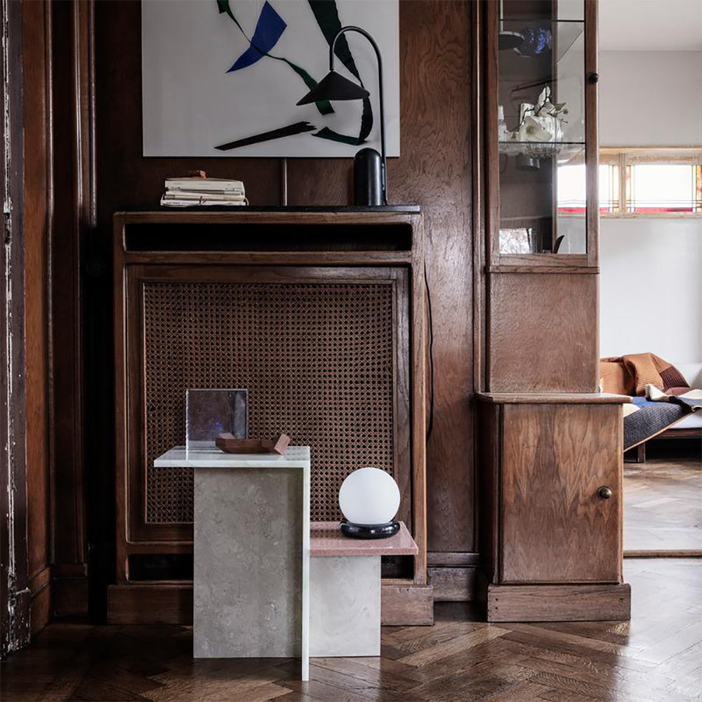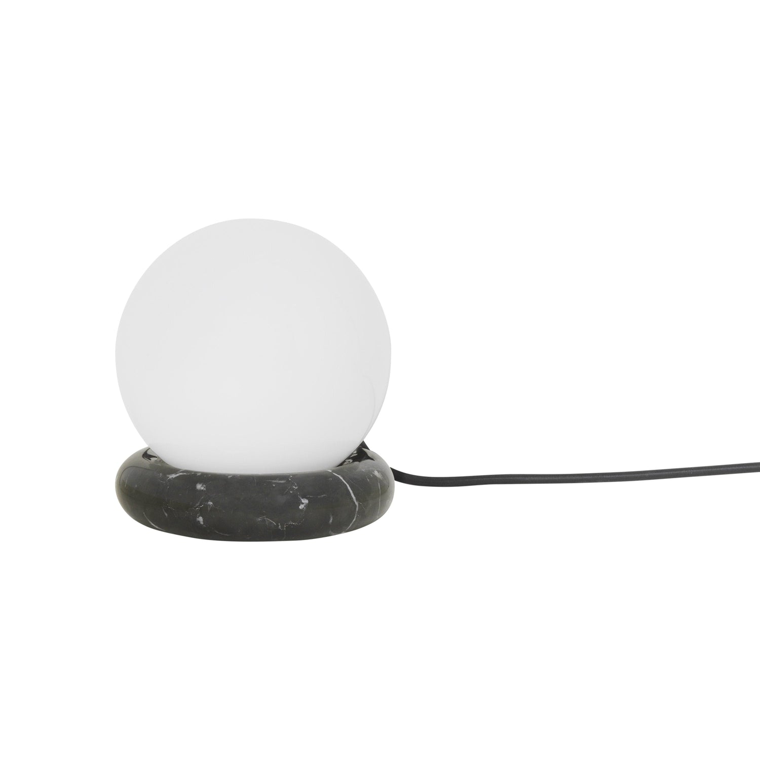Resting on a ring of natural, solid black marble, the mattee opal glass sphere makes a focal point in a room while brightening the space with its soft light. The socket is made of black powder coated metal, adding a raw finishing touch to the elegant lamp.