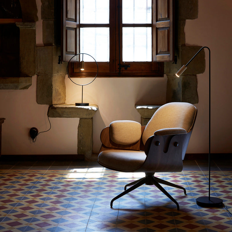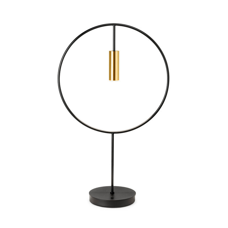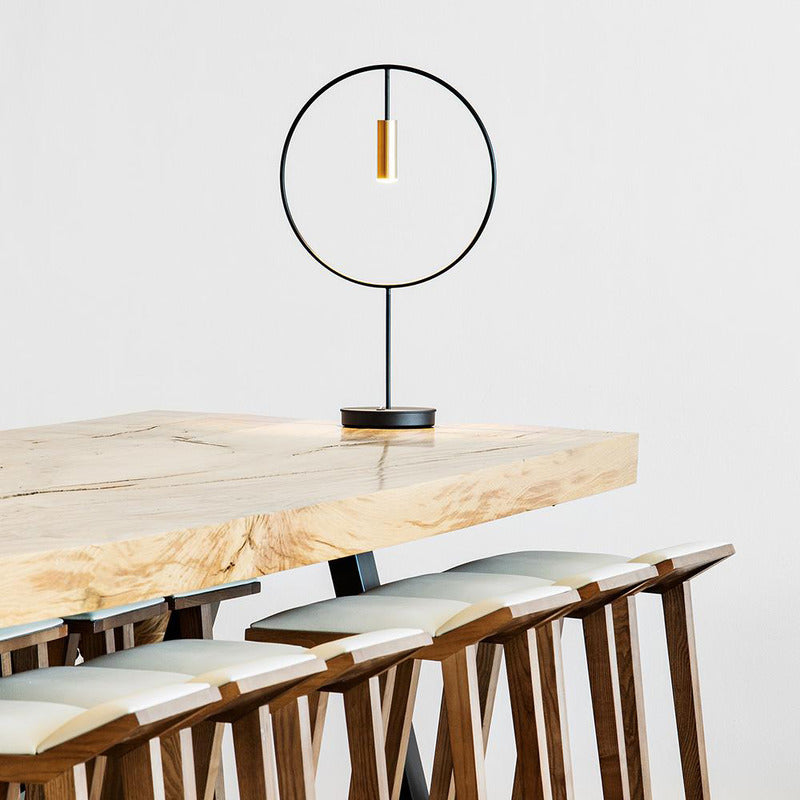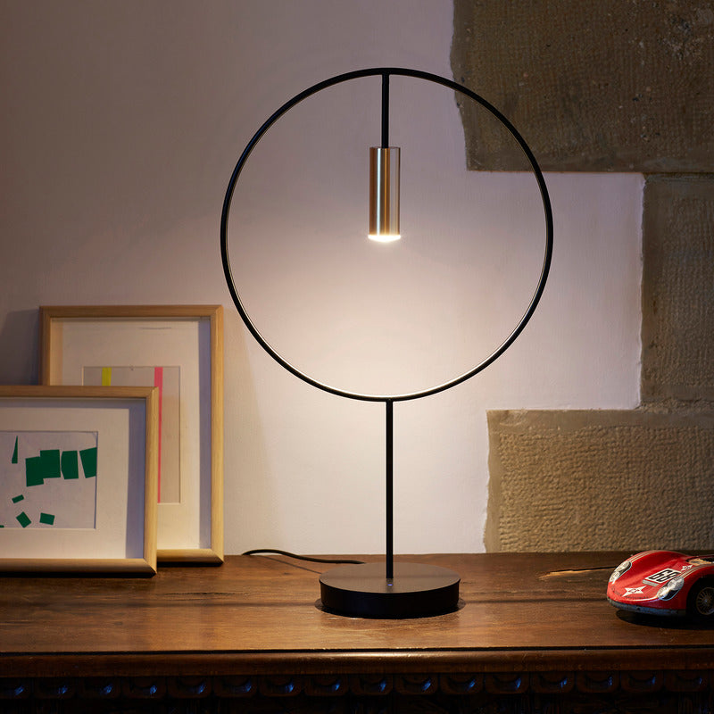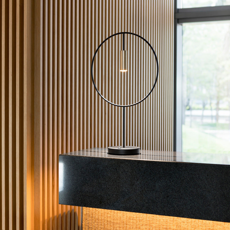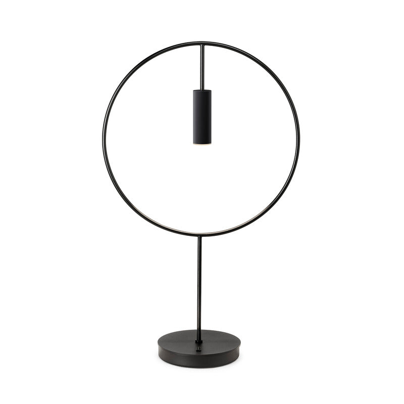 Table lamp with a circular body, cylindrical aluminum head and acrylic (PMMA) lens diffuser. 50 degrees angle acrylic optic lens conversion kit is optional.