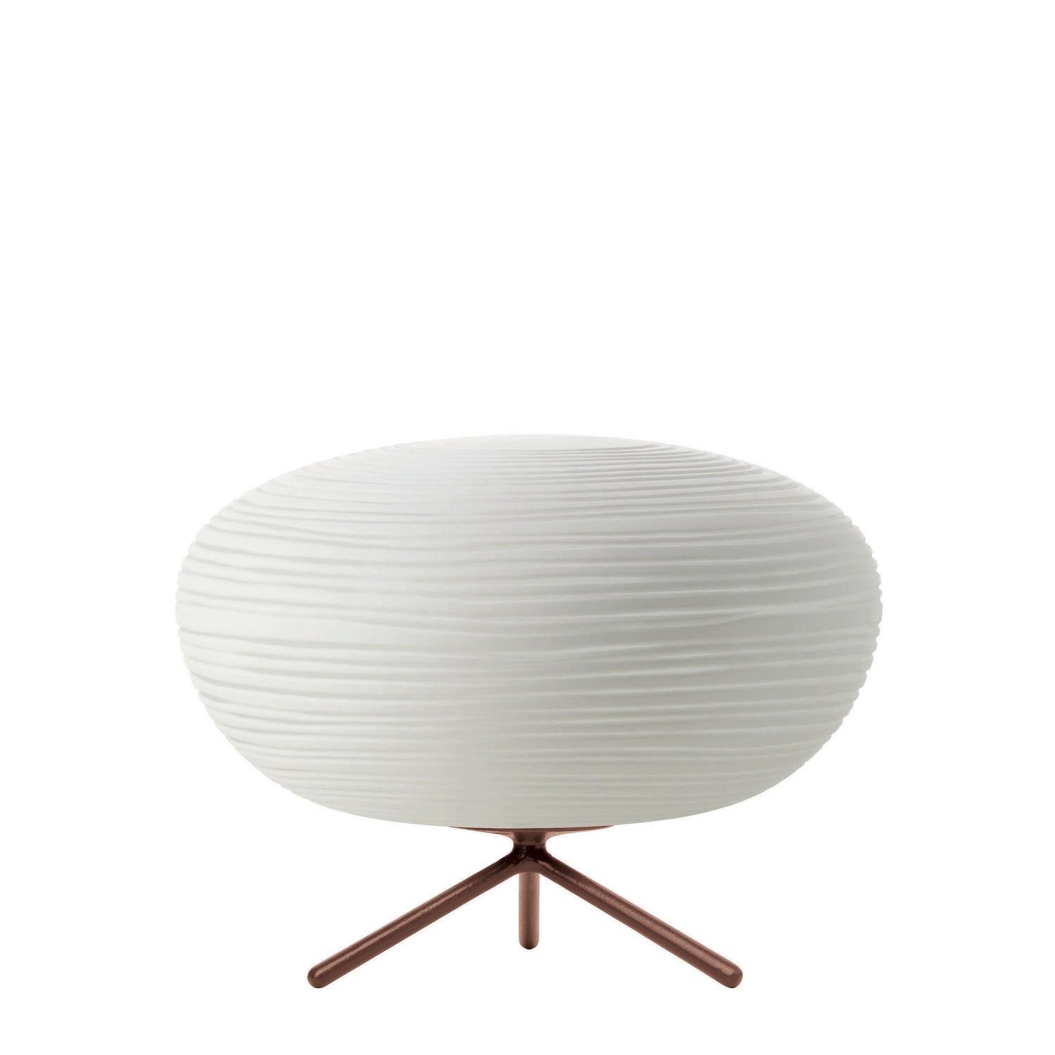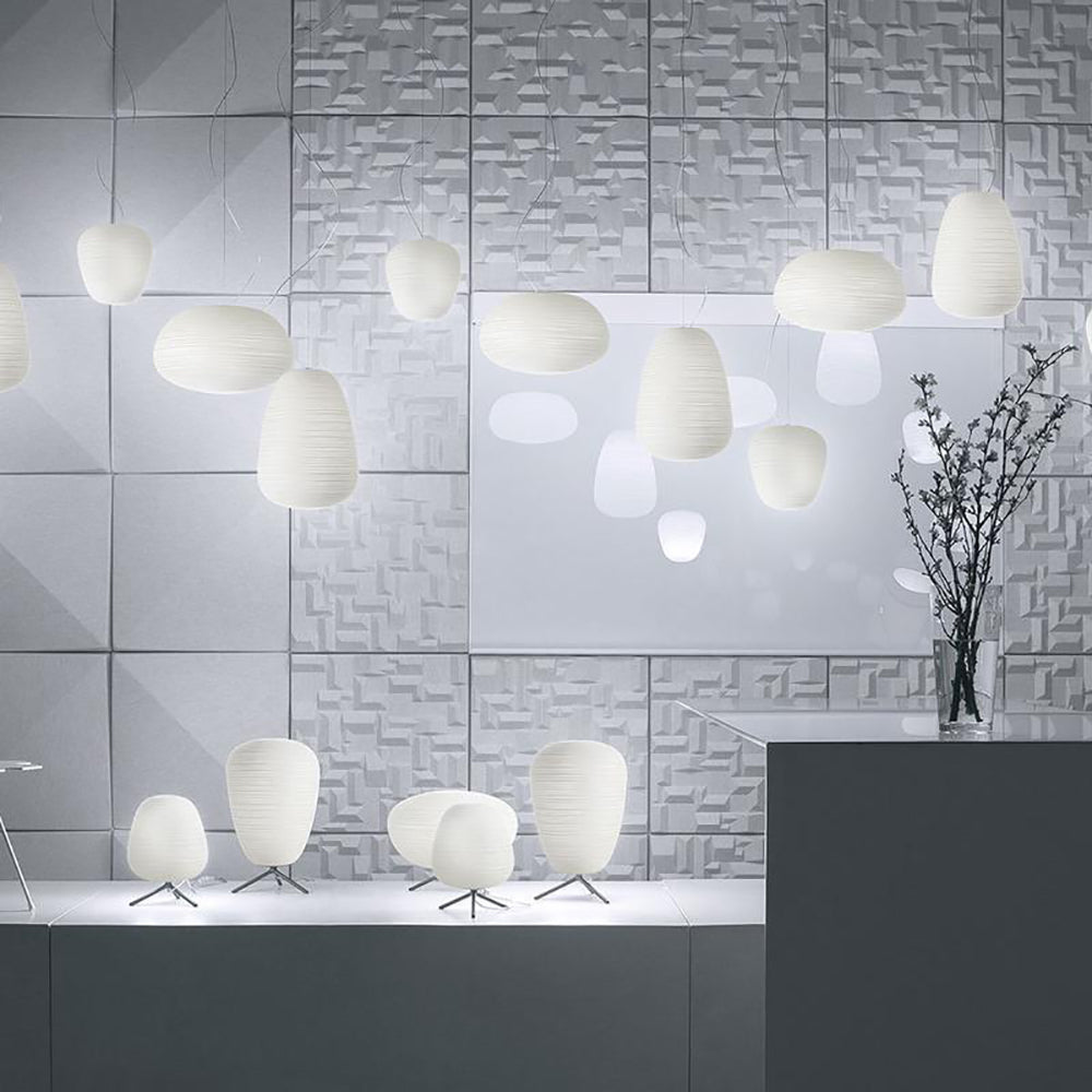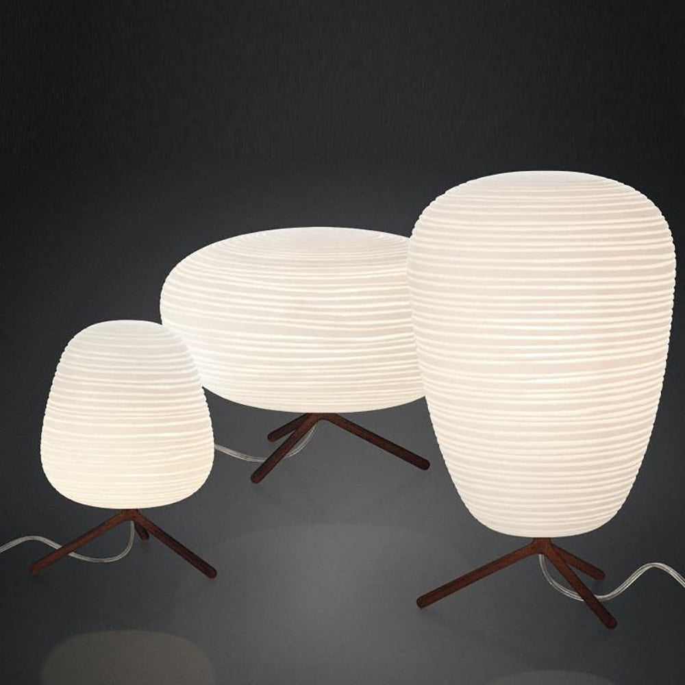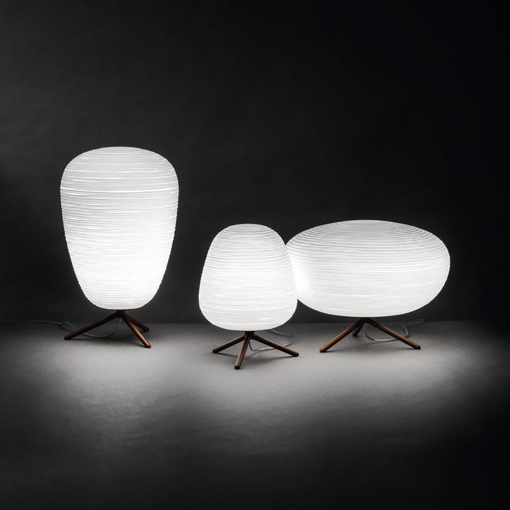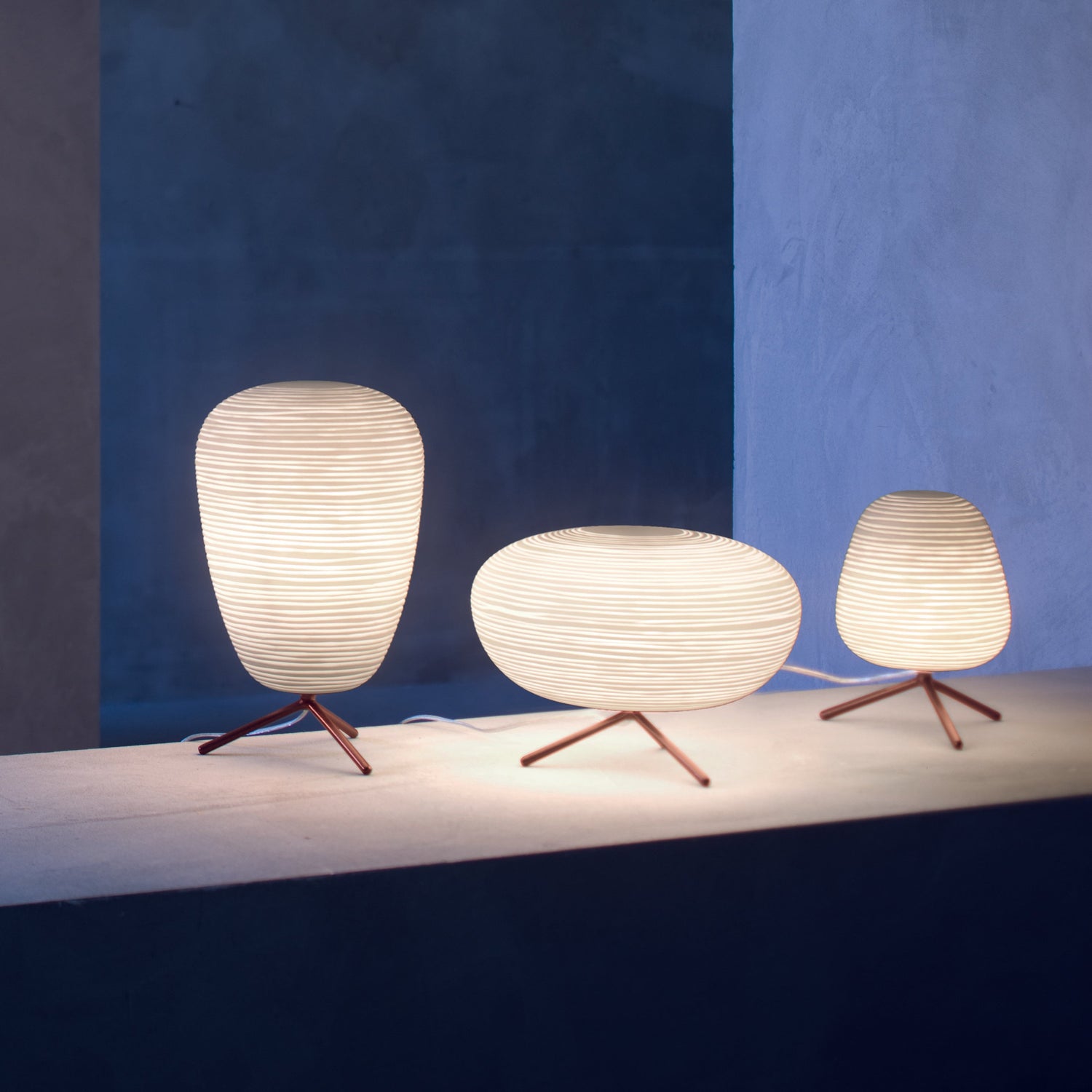 One, two, three lanterns that are lightweight yet brimming with seductive texture. Three different yet concurrently complementary shapes, balancing between the east and the west. A family of lamps that sheds its relaxing light in the most diverse settings, conveying the magic of rice paper or mulberry tree bark, the raw materials of traditional Japanese lanterns, in the precious physical appeal of blown and frosted glass. The horizontal lines which cut across the surface of the lamps give rise to a soft and charming d¨¦cor and at the same time contribute to filtering the intensity of the light source, diffusing a full, warm and soft light into the room. The blown glass body ¨C with its pleasantly plaster-like appearance ¨C is suspended on a base consisting of three metal feet: a highly distinguishing trait, on which the lamp appears to be floating mid-air. They are perfect for use alone or in a harmonious composition of shapes; on a bedside table, a console and a table or even on the floor: for an area dedicated to relaxation or as meditation lamps, wisely lighting both the space we live in as well as our interior world.