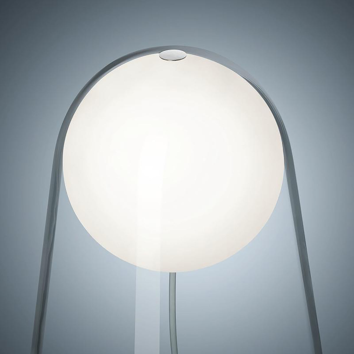 Table lamp with diffused and direct down light. The lamp consists of two hand-blown glass elements. The transparent glass cone makes up the frame, containing and supporting the glossy white blown glass globe which contains the LED light source. This lamp with built-in LED light source is available with the ON/OFF switch on the transparent cable or in the touch dimmer version.