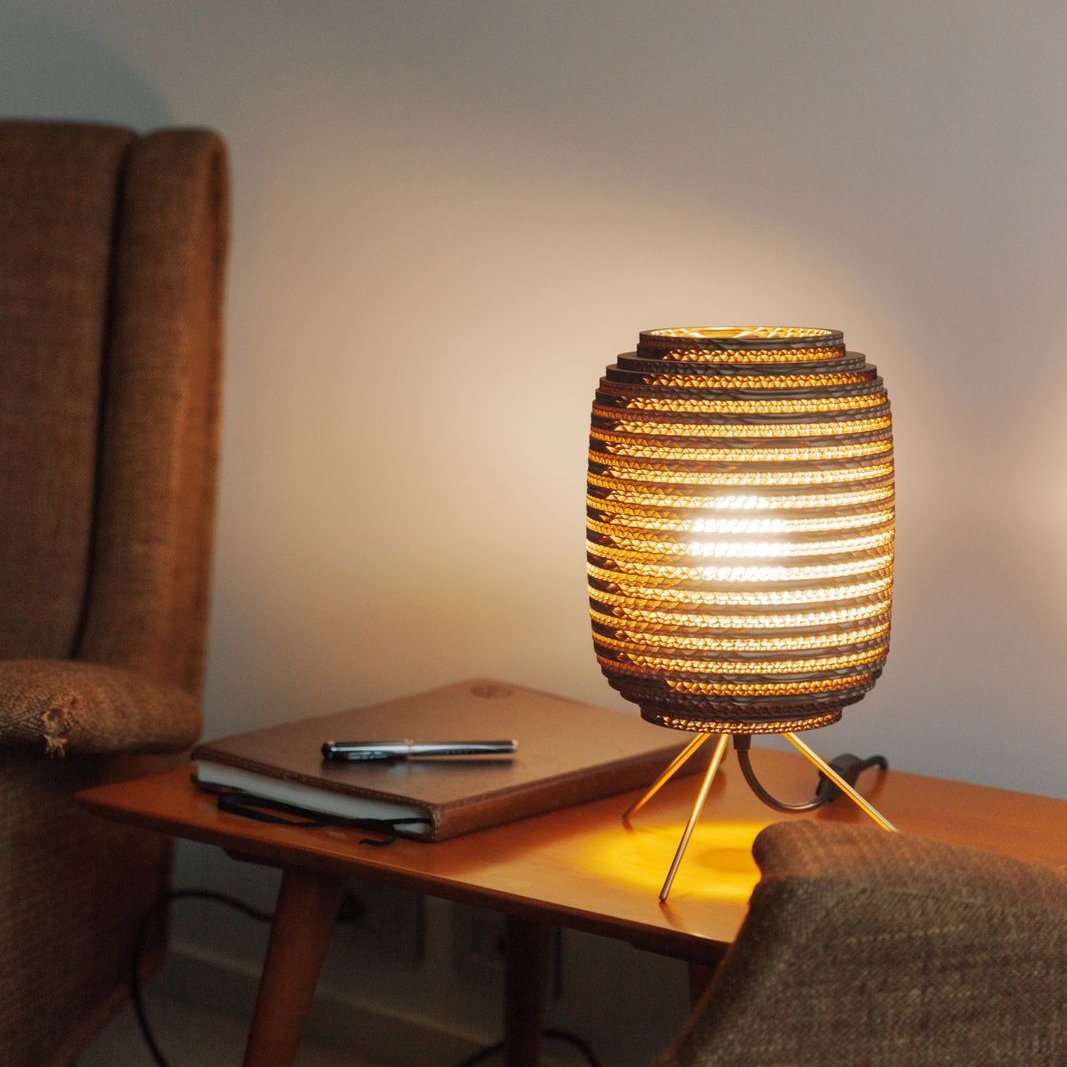Each table lamp features a sturdy brass frame, black cord, and durable rocker switch. Handcrafted from recycled cardboard, Graypants' flagship Scraplights provides warm, intimate, and functional lighting for any occasion or space. Shades are non-toxic, handmade, and manufactured using responsible practices.