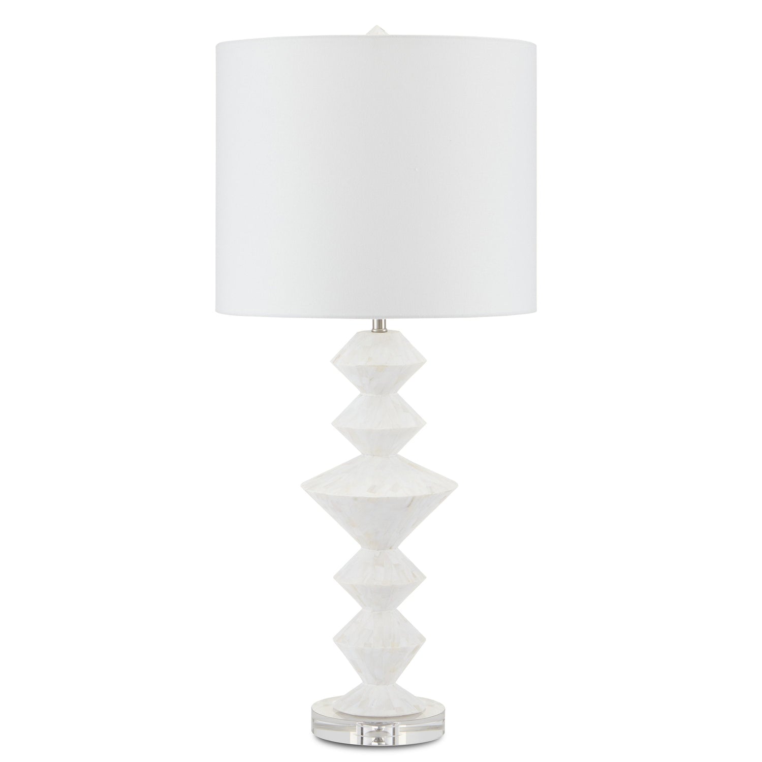 Designed by Tom Caldwell, the Sheba Table Lamp has a geometric-shaped body that has been covered with laminated mother-of-pearl shell. The white table lamp features a matt finish on the shell surface and is accentuated with an optic crystal base. The shade is a cylinder shape in perfect scale with the overall design, which is made of an off-white linen fabric.