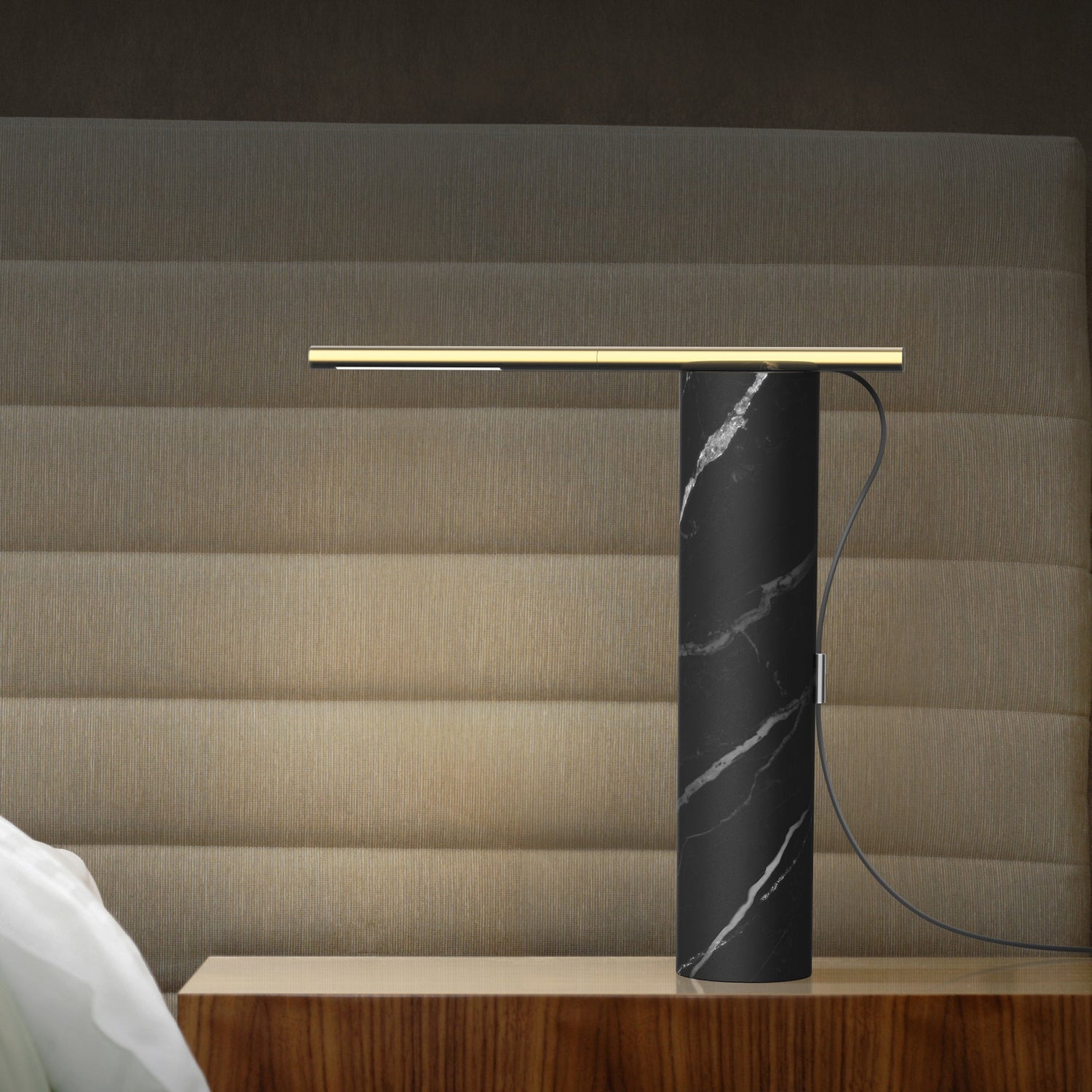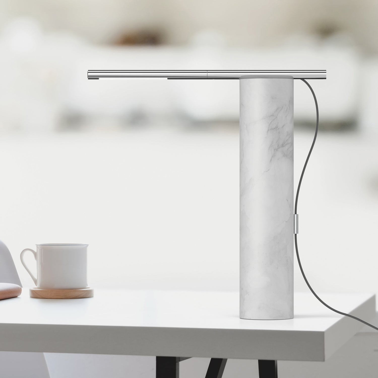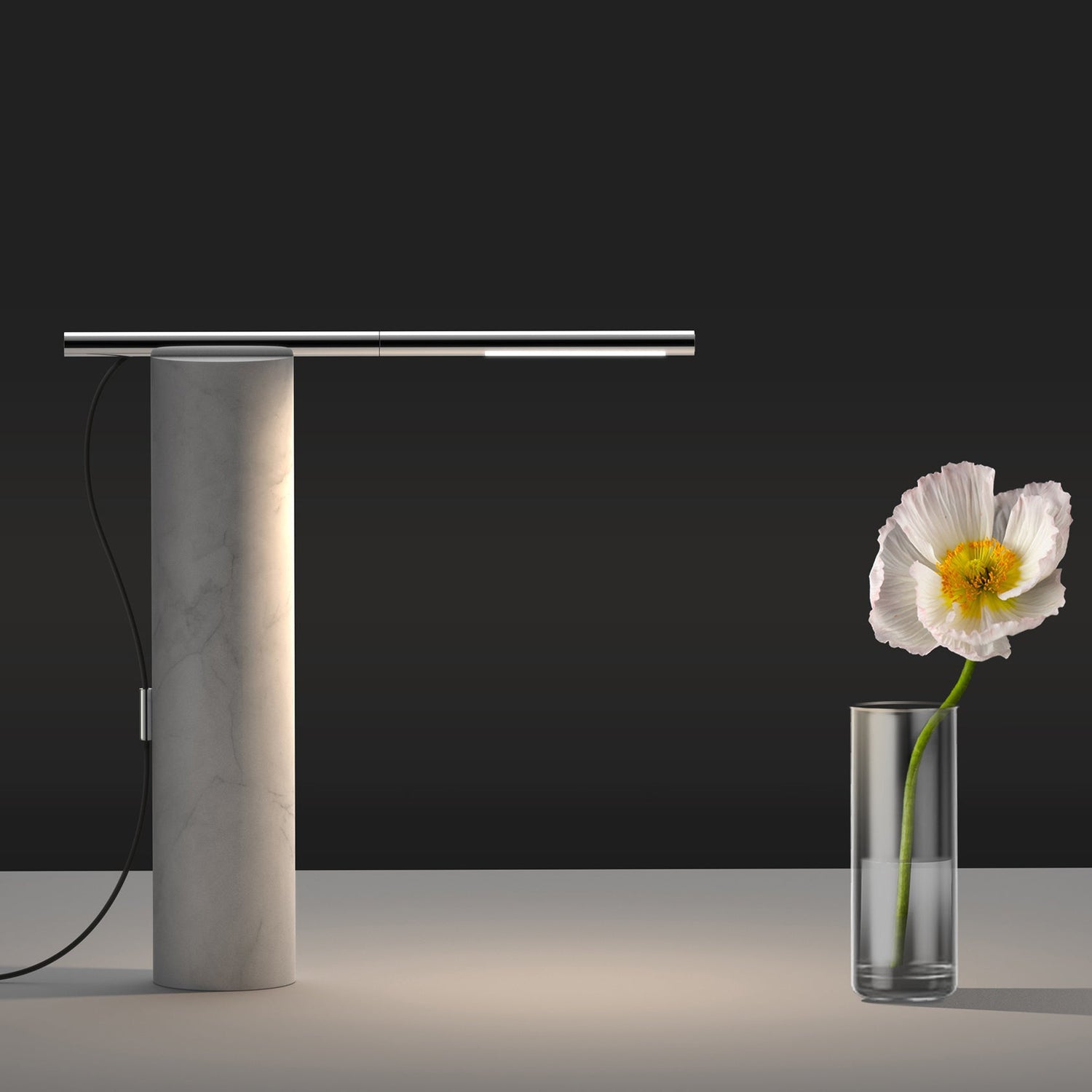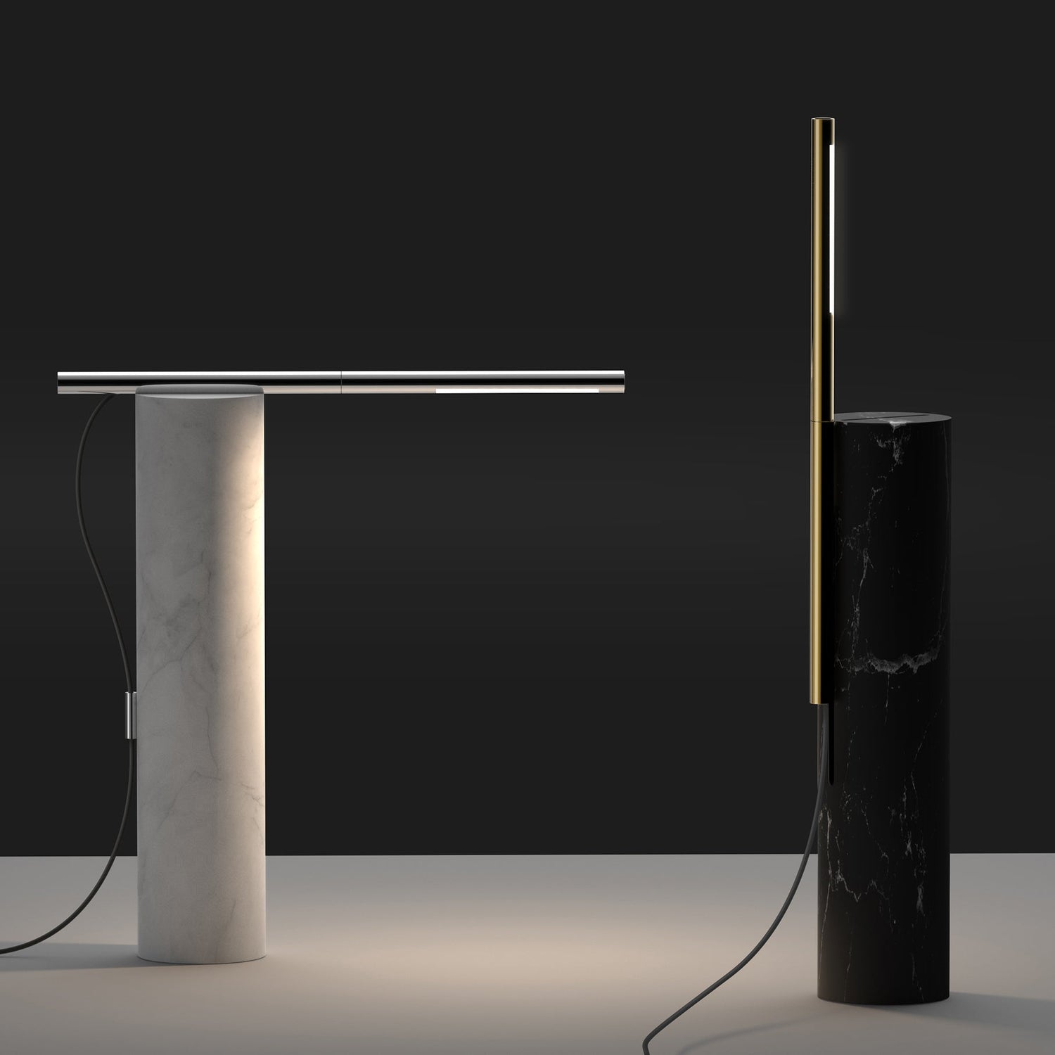 T.O celebrates and reinforces the importance of light as a pillar of our daily life. A monolithic column stands to support a horizontal and vertical line of light to provide precise light control in all directions. T.O embodies a harmonious dialogue between solidity and lightness offering unlimited contexts for use in residential and workplace environments, all within a minimal footprint. T.O features a fully dimmable LED light source with tactile push switch appropriately positioned at the end of arm. Featuring a magnetically attached light arm over a marble cylinder base while the light wand can be rotated up to 360 degrees to provide both direct and indirect light for task and ambient lighting needs alike. T.O is offered in 2 matte base finishes in Marquina black and Carrara white while the light arm is elegantly contrasted in polished surfaces in brass and chrome. T.O is a seamless integration of functional lighting and sculpture.