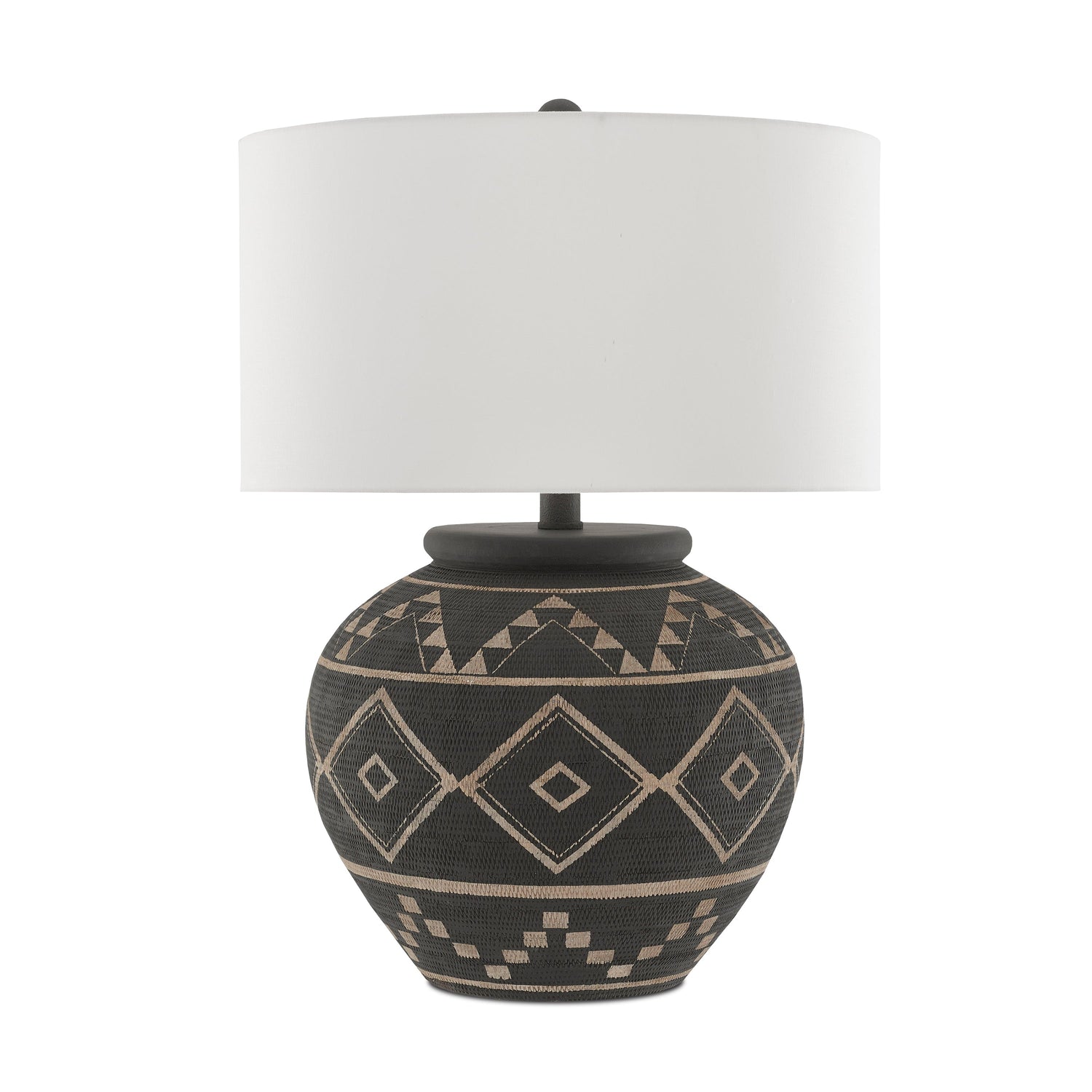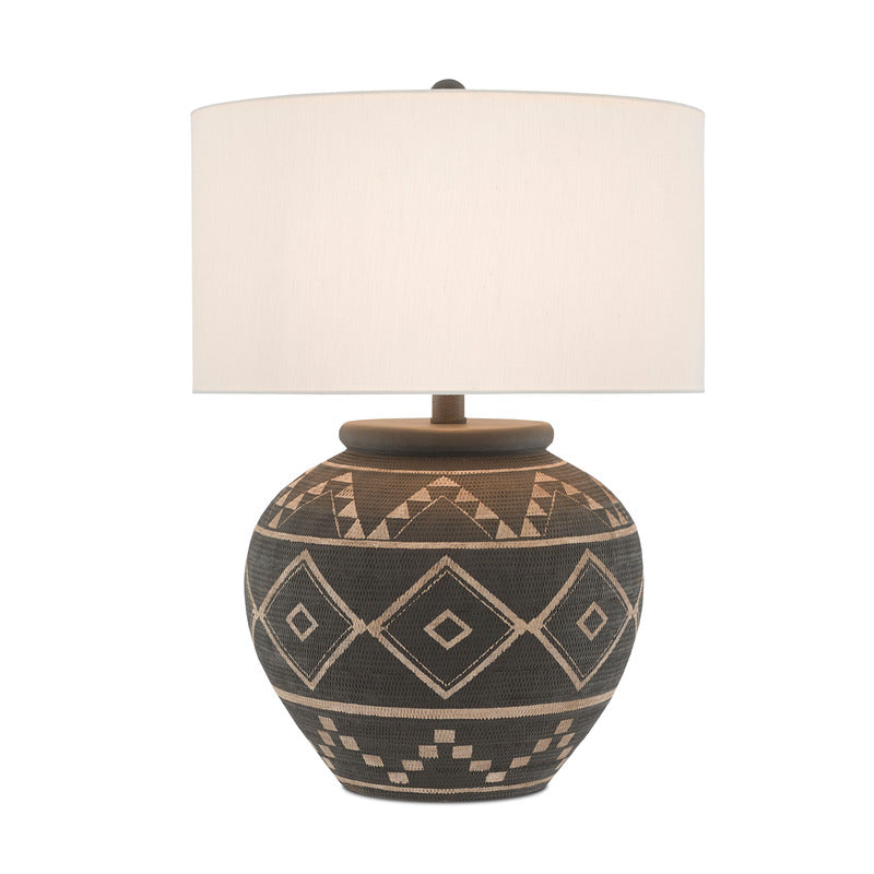 Though the eye could be influenced to believe the Tattoo Table Lamp has a surface covered in basket-weave, the pattern is scratched from the brewed latte finish on the surface of the terracotta body. The wrought iron hardware in a Mole Black finish fits perfectly with the tones on the dark gray lamp, which has a terracotta finial in a matching finish to fasten the off-white linen drum shade to the piece.