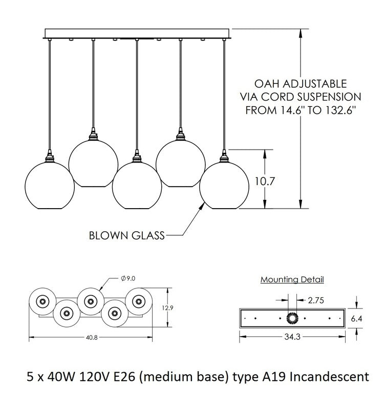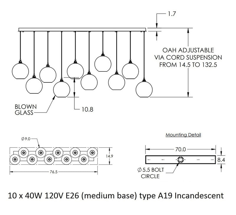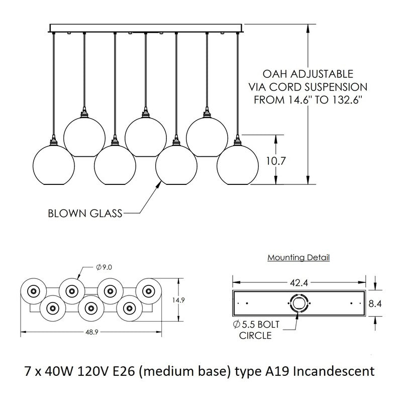 - Mounting: mounts directly to J-box (with Five Lights and Seven Lights) or mounts to building structure (with Nine Lights and 10 Lights)