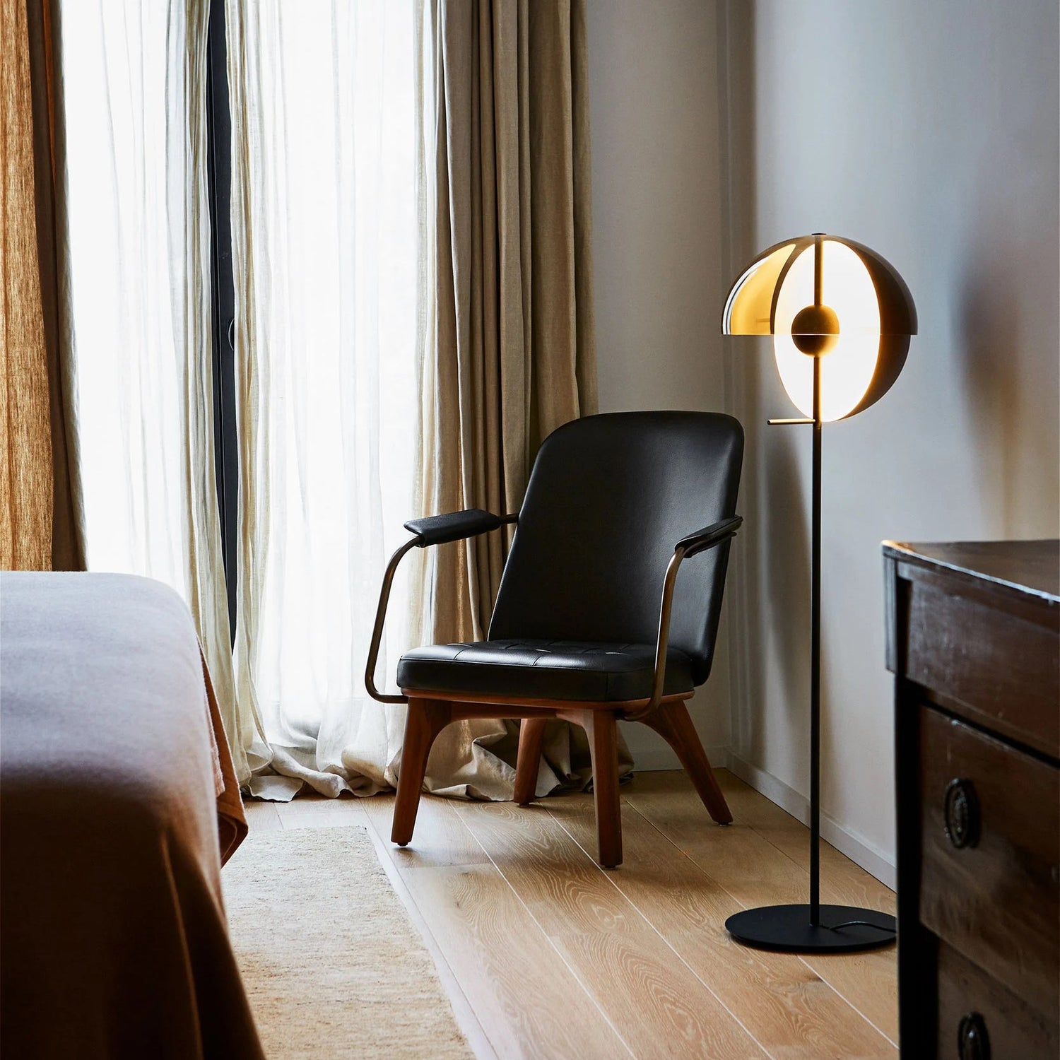 A formal modern lighting concept given a stylish and simple contemporary makeover. The Theia Floor Lamp by Marset is framed around an understated metal frame with a globe-like cap that highlights its showcase feature: a light element half obscured with a rounded back. This two-faced look gives the Theia a sense of personality that stands out among other contemporaneous looks.