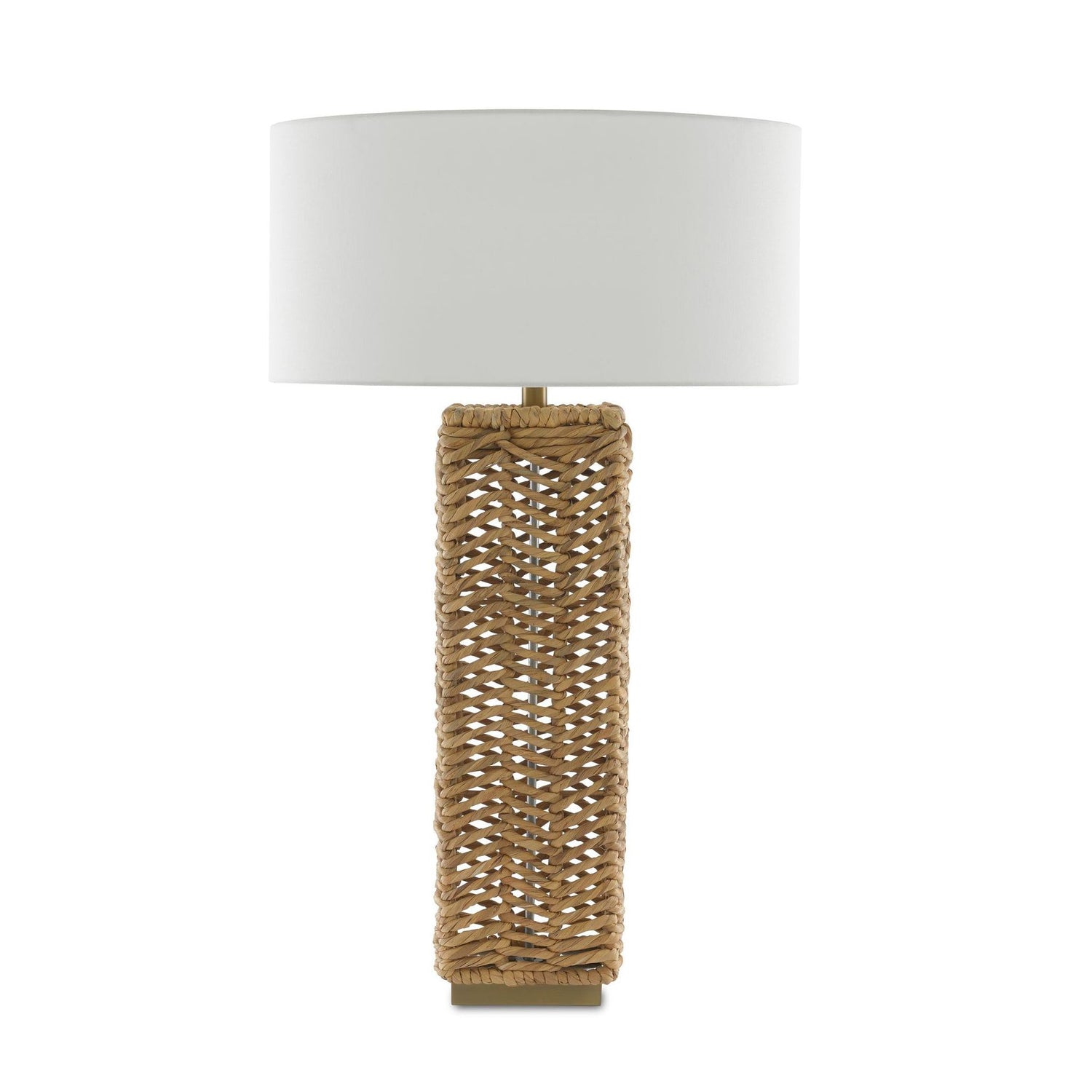 The Torquay Table Lamp is one of Currey & Company creations that illustrates the skill of their artisans who weave natural materials. The rope table lamp has a rectangular body that is woven from natural water hyacinth, the chevron pattern creating a earthy texture. They've topped the elemental table lamp with an off-white linen shade.