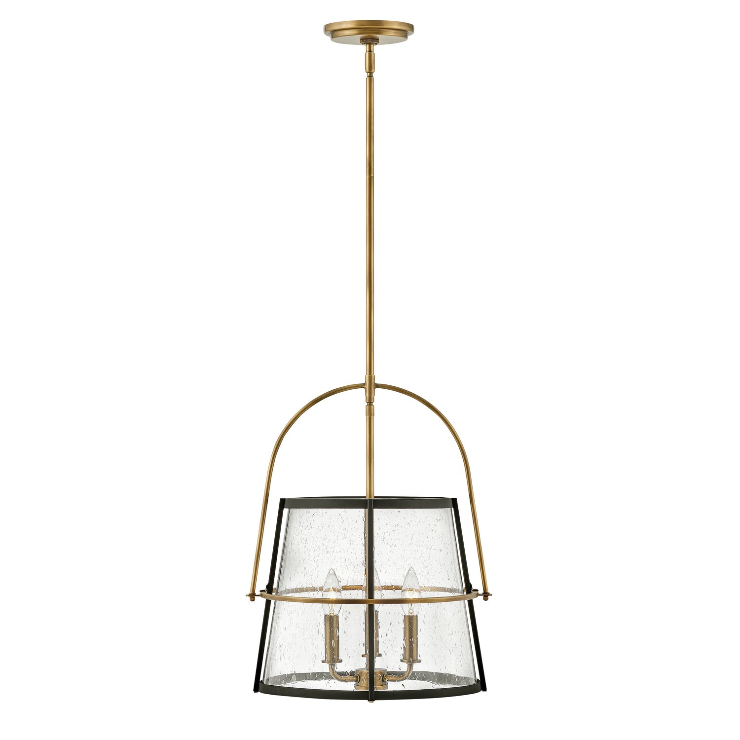 Tournon merges timeless appeal with contemporary functionality. The two-toned steel frame holds the clear seedy glass shade surrounding the lamps within. An oversized yoke completes the mid-century-modern design. It is available in a Heritage Brass or Brushed Nickel finish, each complemented by Black accents.