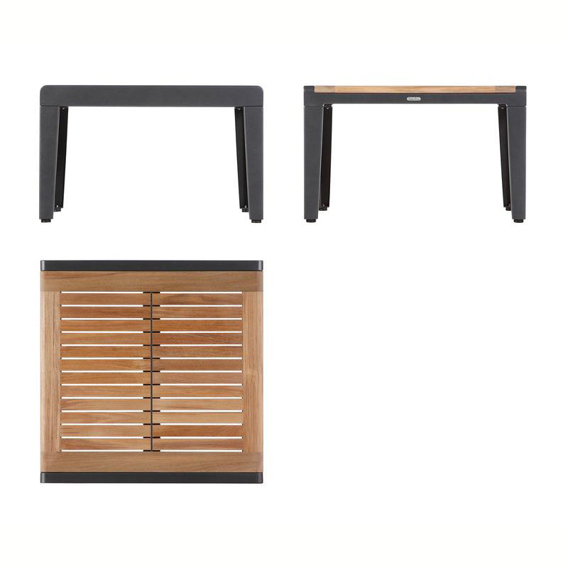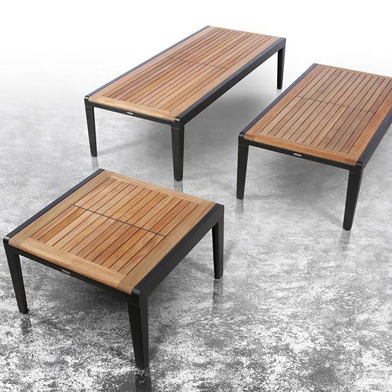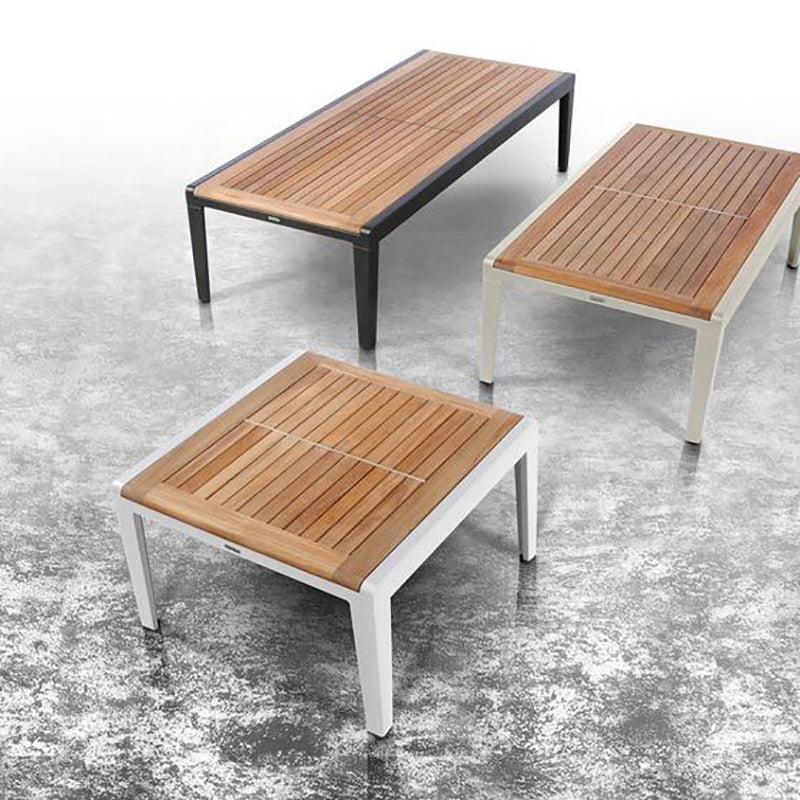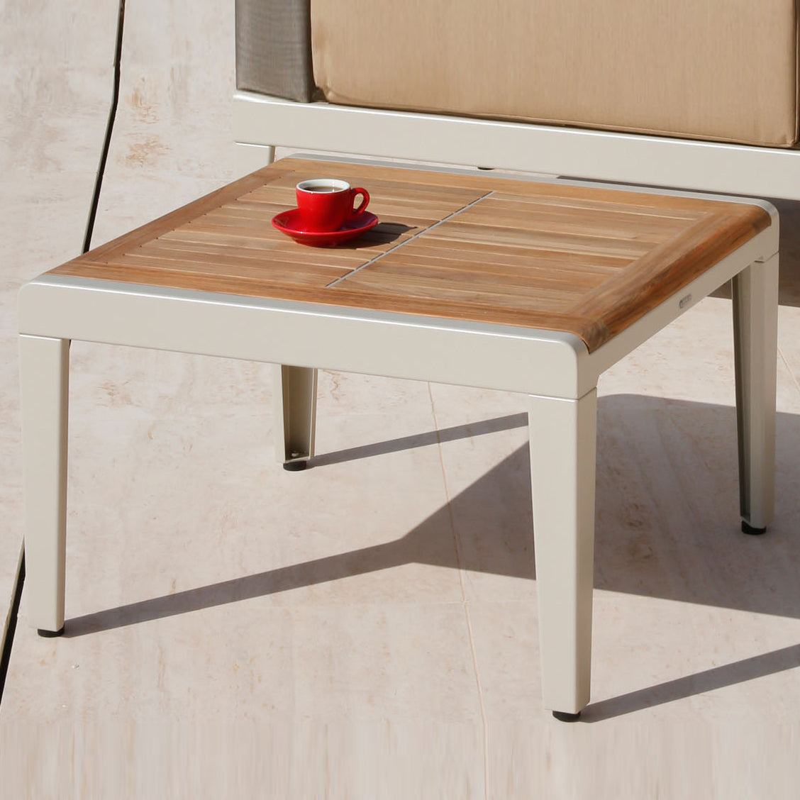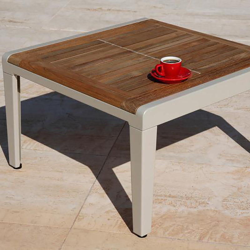 This modern design combines a powder coated aluminum frame in optional colors with a teak top that displays aluminum styling accents.