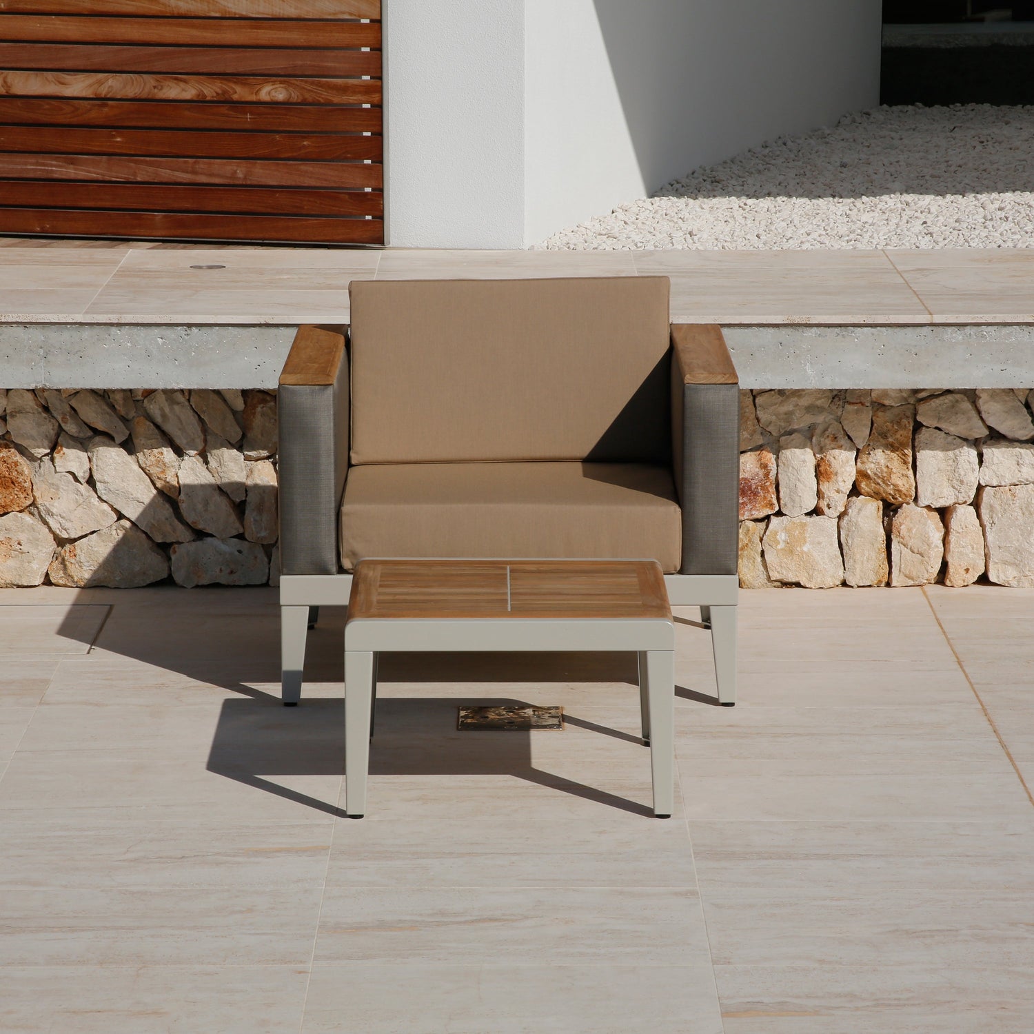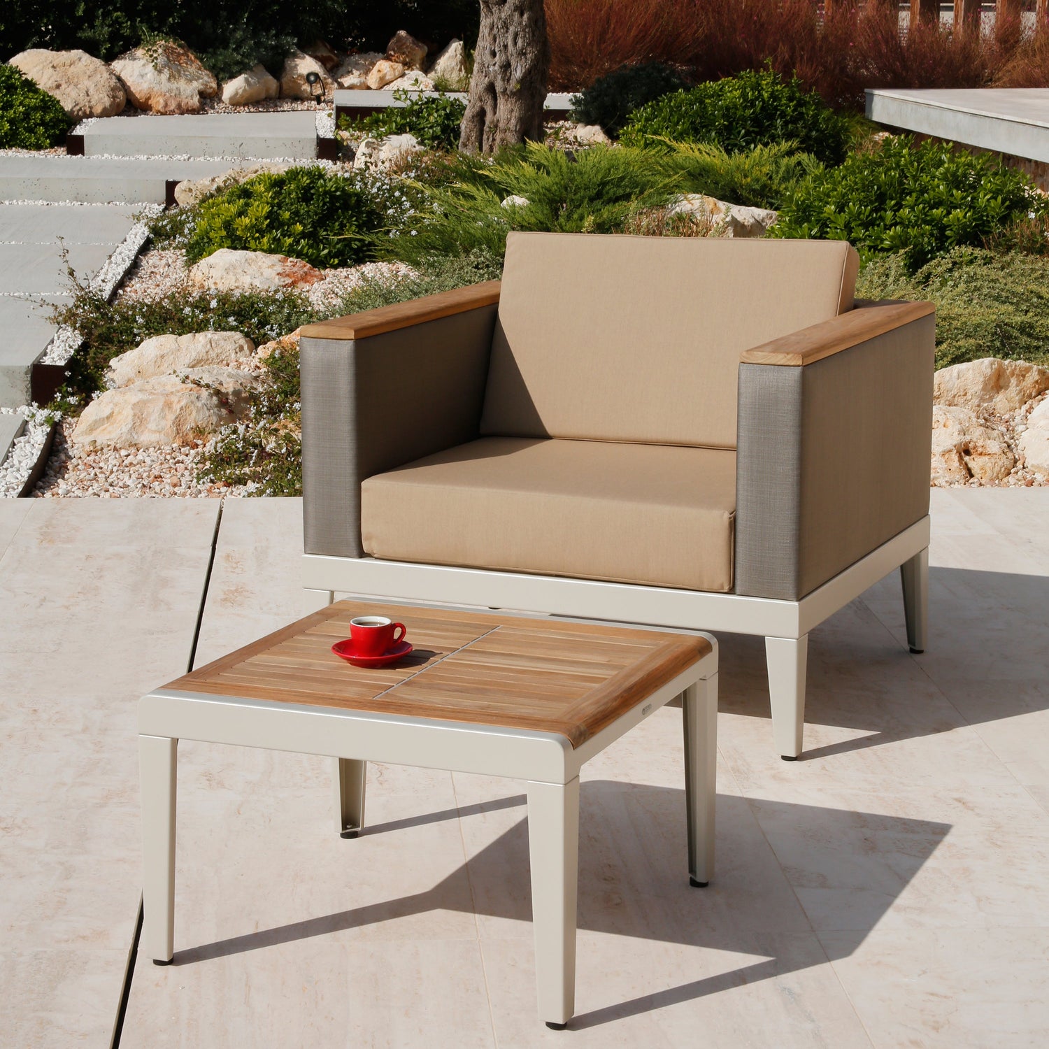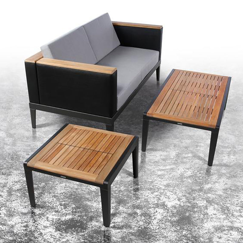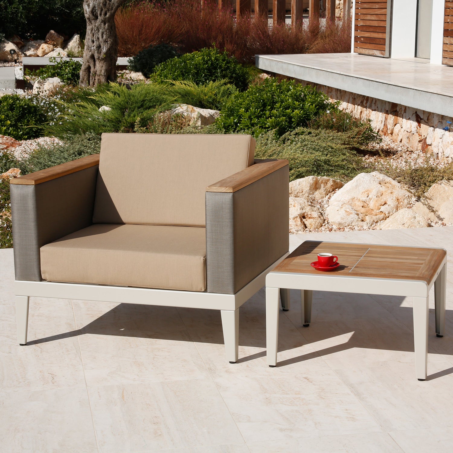 This modern design combines a powder coated aluminum frame in optional colors with a teak top that displays aluminum styling accents.