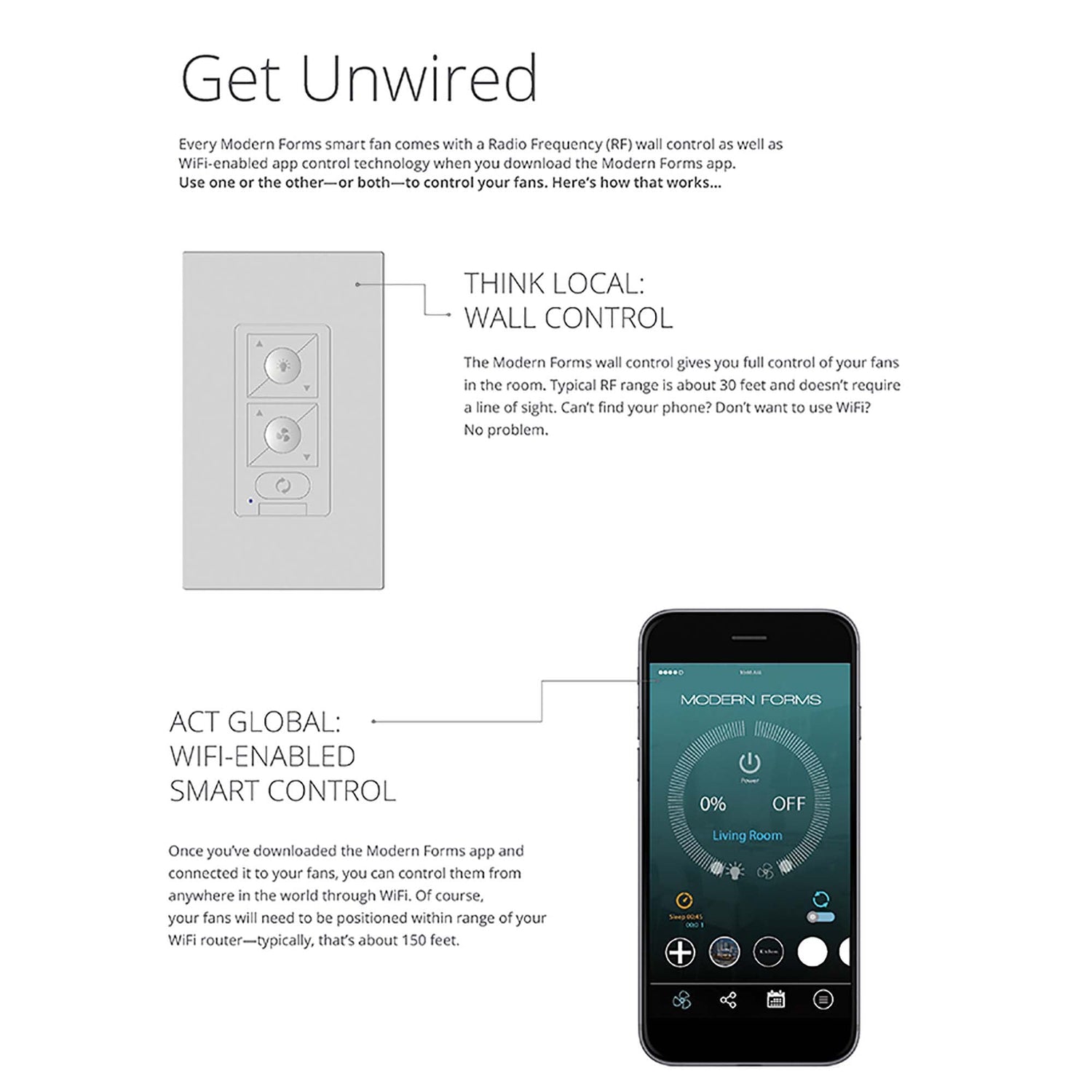 - Free app download: Sync with our exclusive Modern Forms app to control fan speed, use smart features like breeze mode, adaptive learning, create groups, and reduce energy costs. New: Bluetooth compatible for improved range and an unlimited amount of fans can be controlled with remote or wall control within range