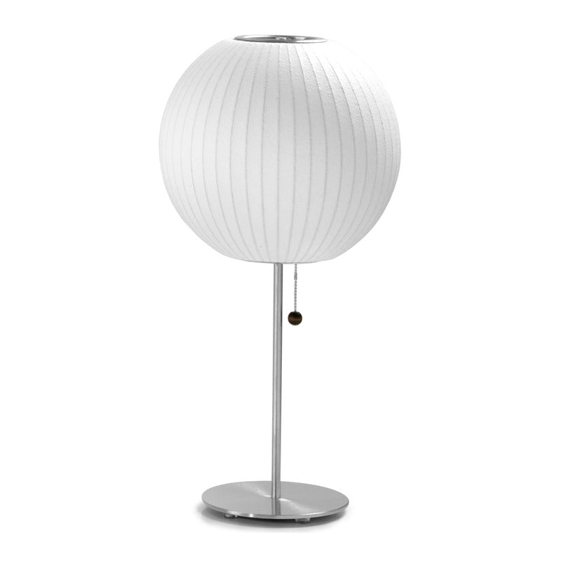 The Nelson Ball Lotus Table Lamp is part of the Nelson Bubble Lamp series. Mounted on a steel base, with or without walnut cover, the charming sphere fills interiors with a warm, diffused light. George Nelson, inspired by a set of silk-covered Swedish hanging lamps, originally designed the Bubble Lamp series in 1952.