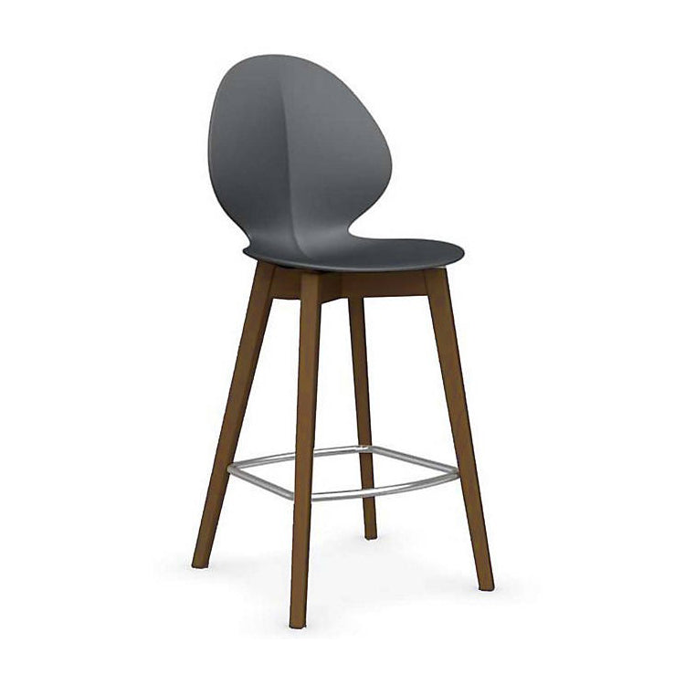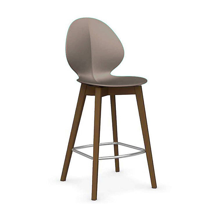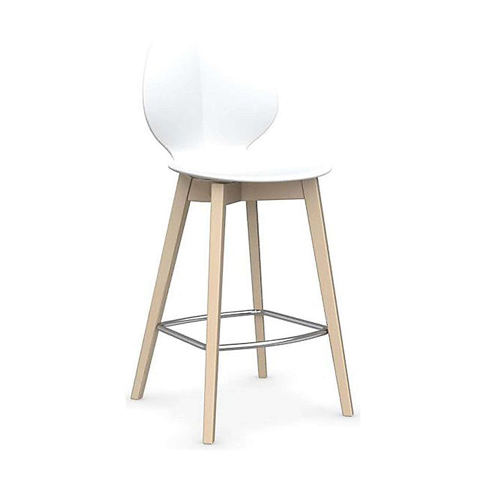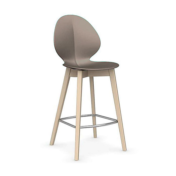 Basil W stool in mixed materials: seat in polypropylene with a leaf-shaped design and frame in solid wood.