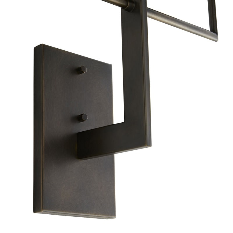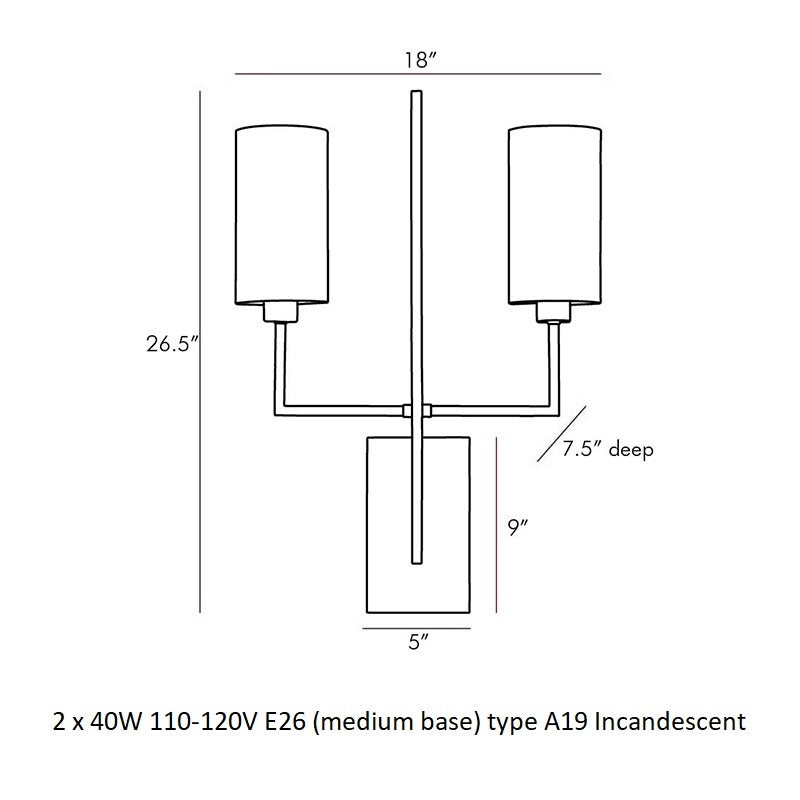 Reach out your arms and grab the glory, this sconce stretches wide with two steel dowels supporting cylindrical white linen shades. The dowels are supported off an elegant central steel blade. The scale of this fixture provides architectural interest while amplifying the light in any entry hall, corridor or room. Finished in aged bronze.