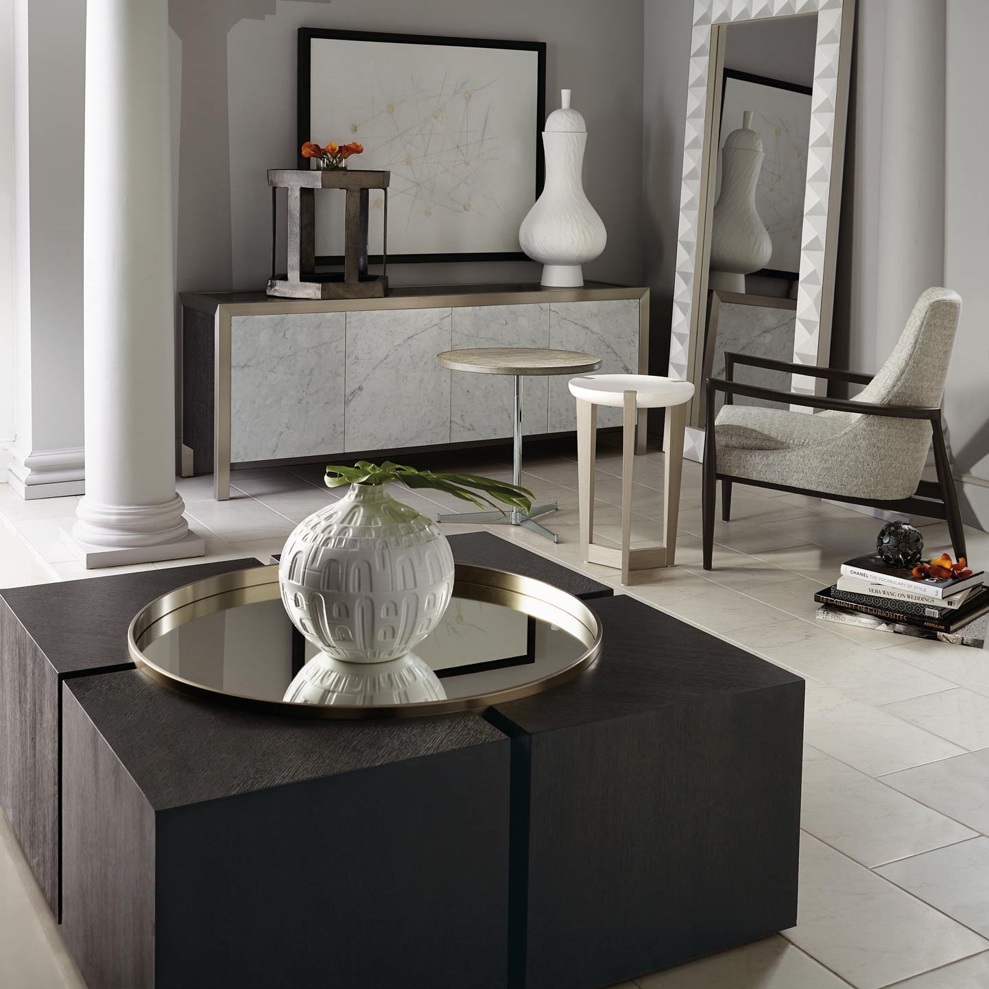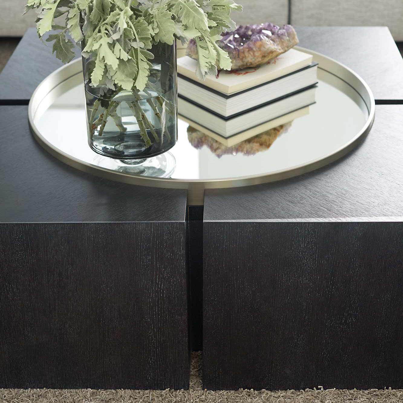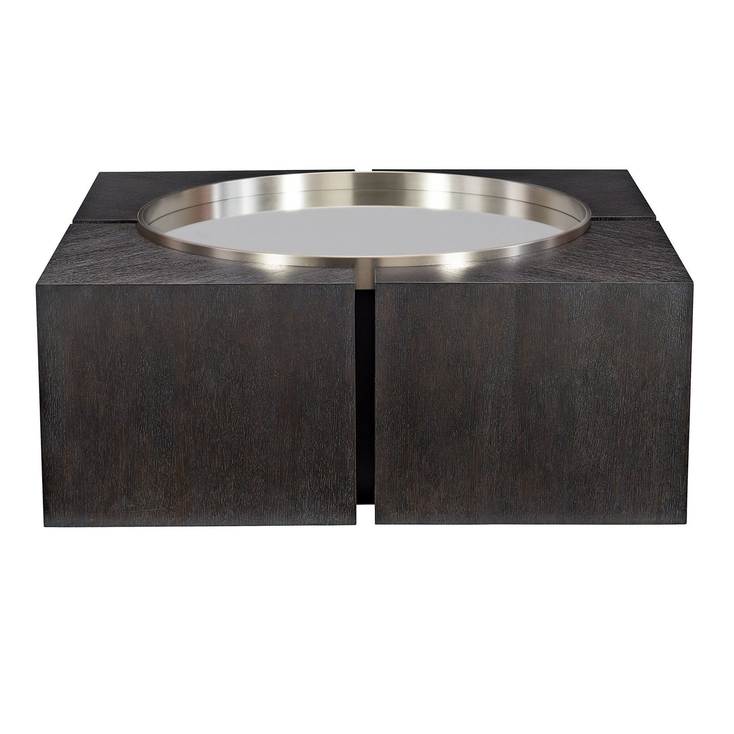 Dramatic and modernist, this contemporary cocktail table is constructed of cleverly interconnected geometric shapes. A round mirrored glass is inset into four ash solids and white oak veneers. This table adds a unique and artistic accent to any living room.