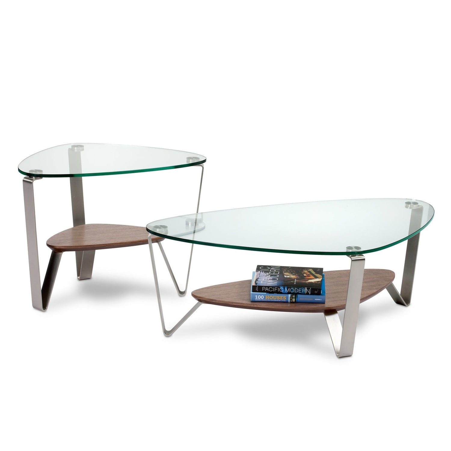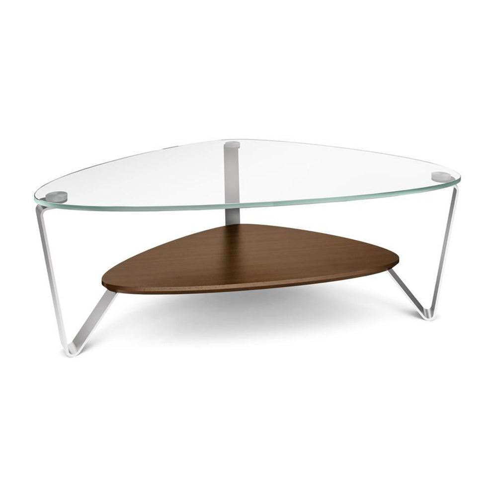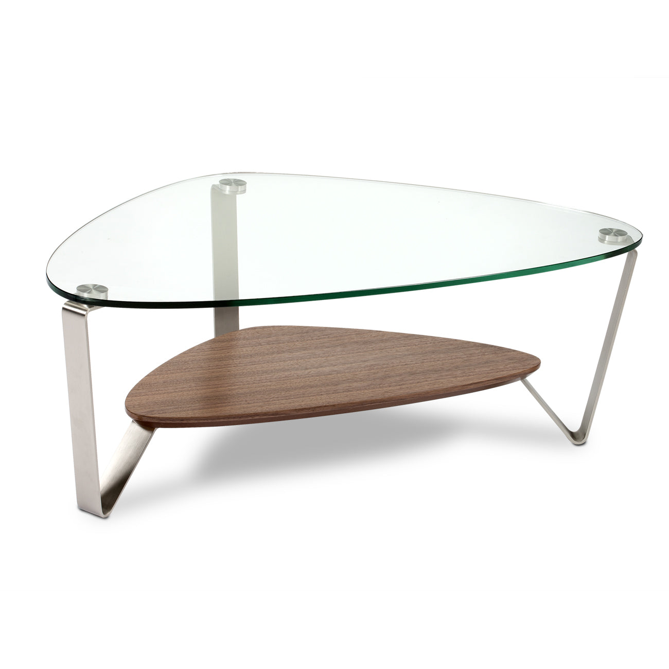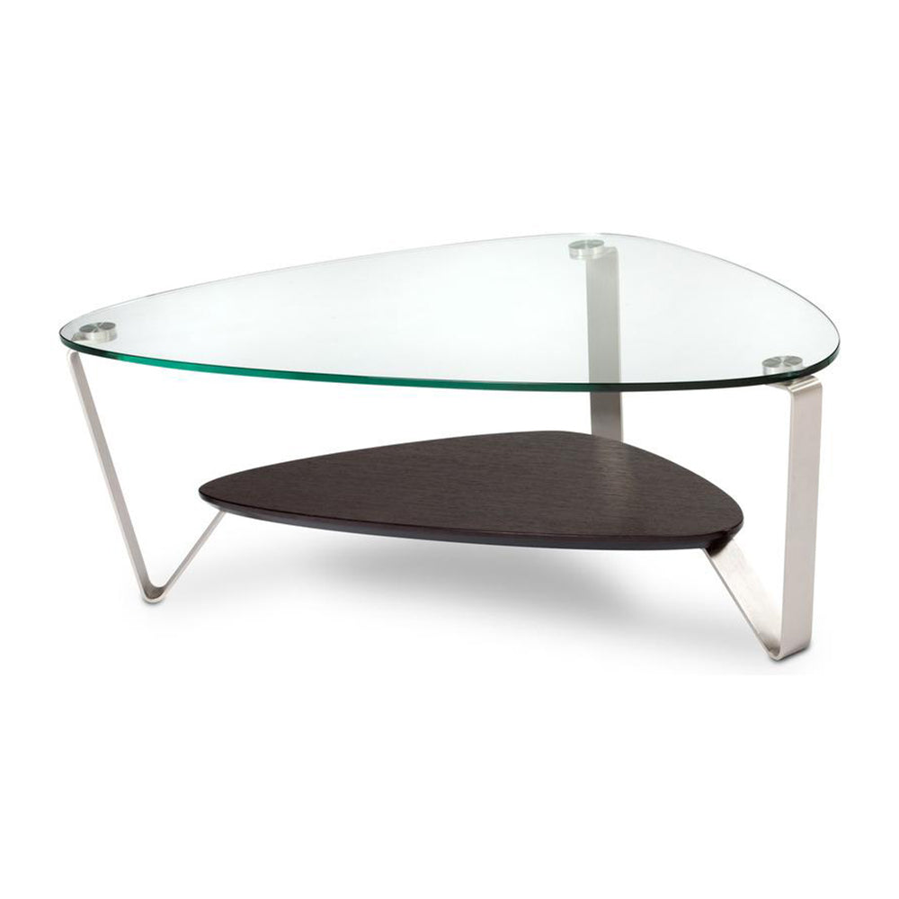 A classic BDI design, the soft, triangular shape of the Dino tables makes them a versatile choice for a variety of settings and perfect for use with a sectional sofa. The tempered glass top and beveled lower shelf are securely attached to beautifully finished satin-nickel steel legs. Available in two coffee table sizes and an end table.