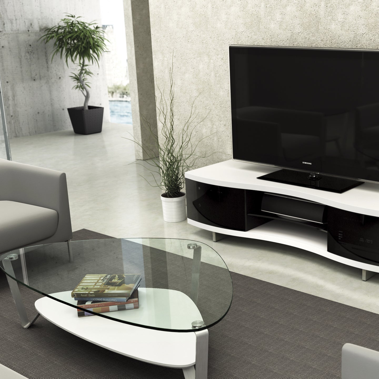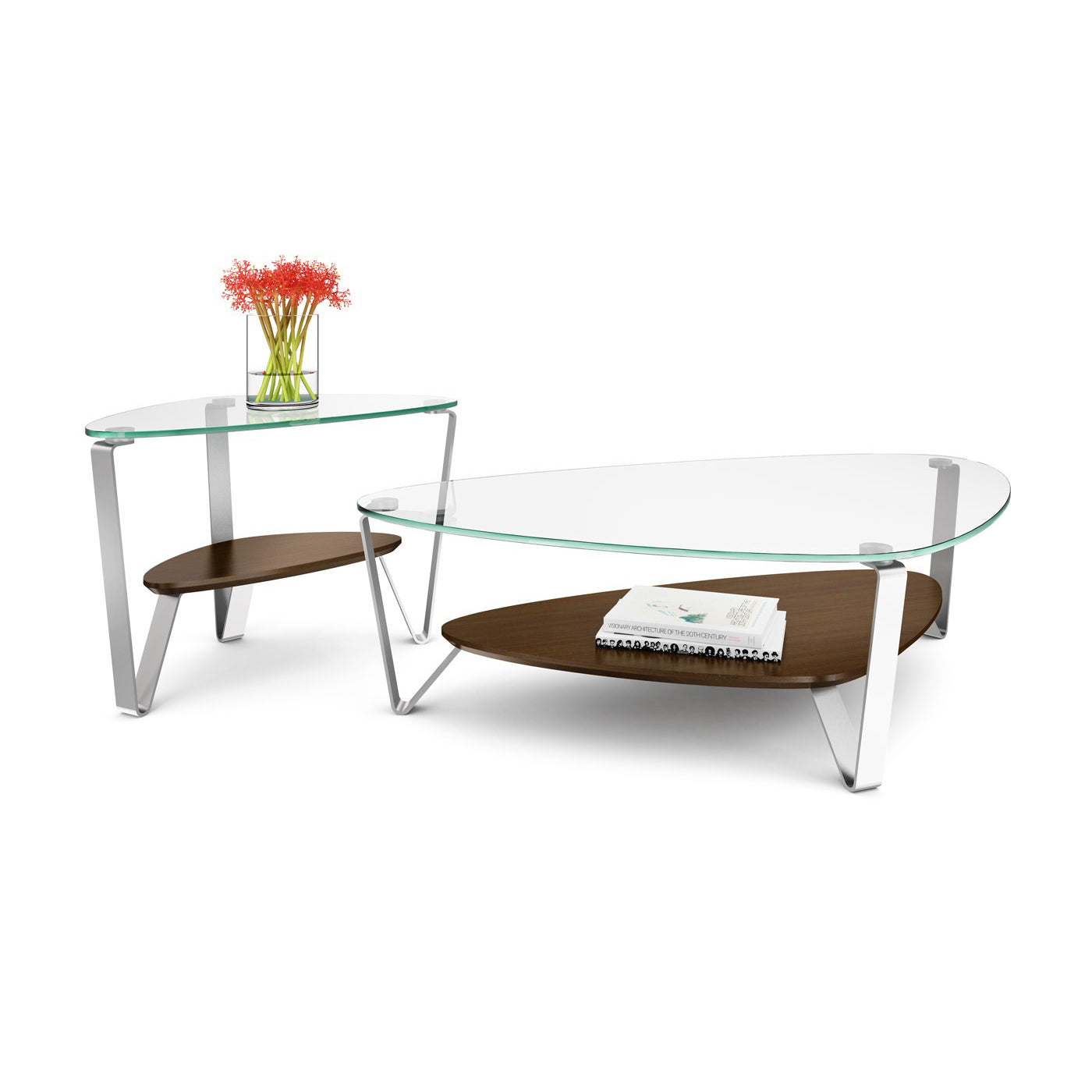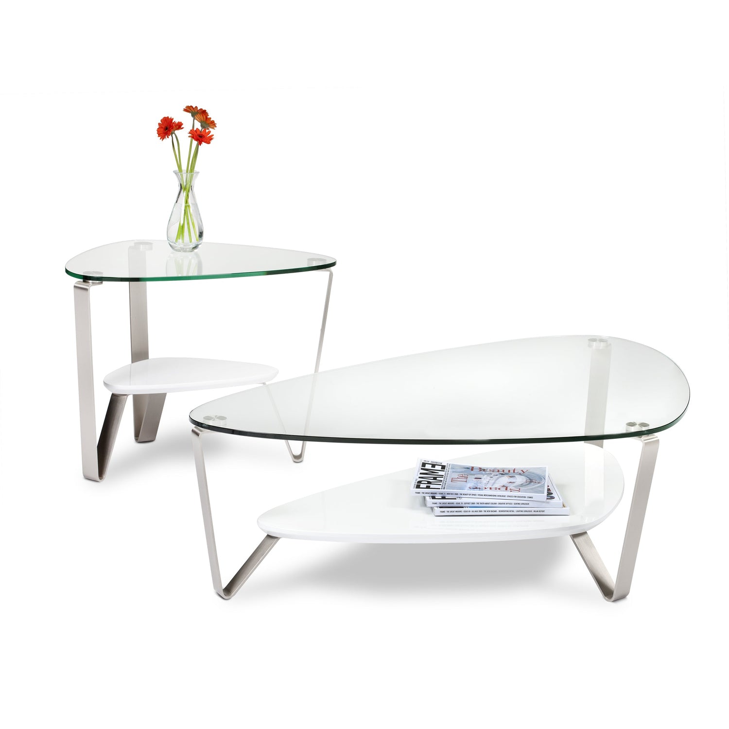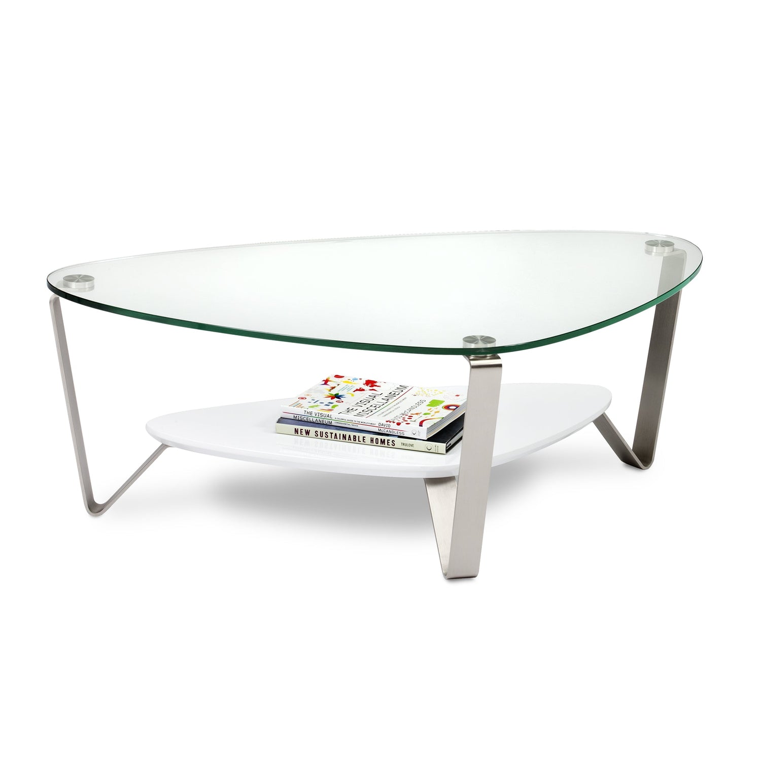 A classic BDI design, the soft, triangular shape of the Dino tables makes them a versatile choice for a variety of settings and perfect for use with a sectional sofa. The tempered glass top and beveled lower shelf are securely attached to beautifully finished satin-nickel steel legs. Available in two coffee table sizes and an end table.