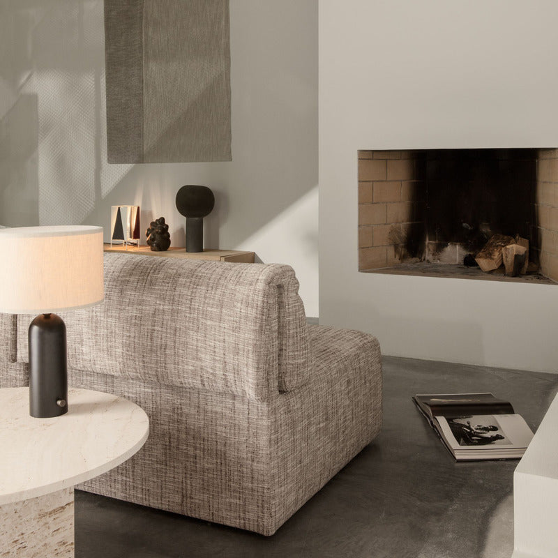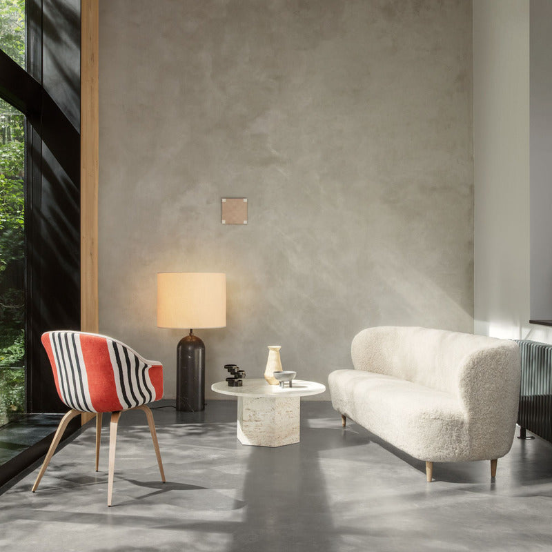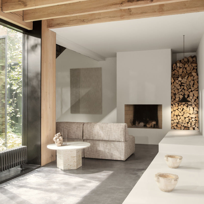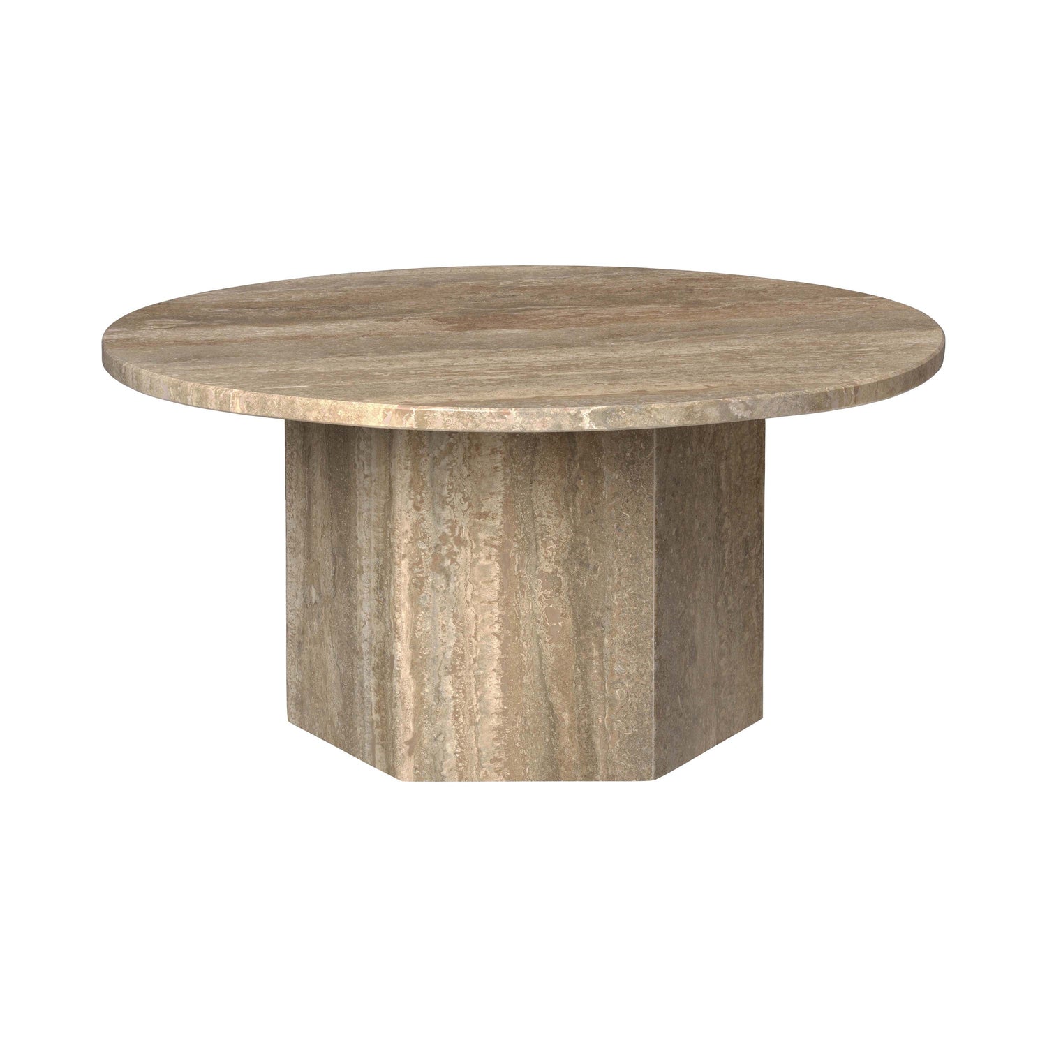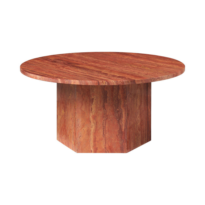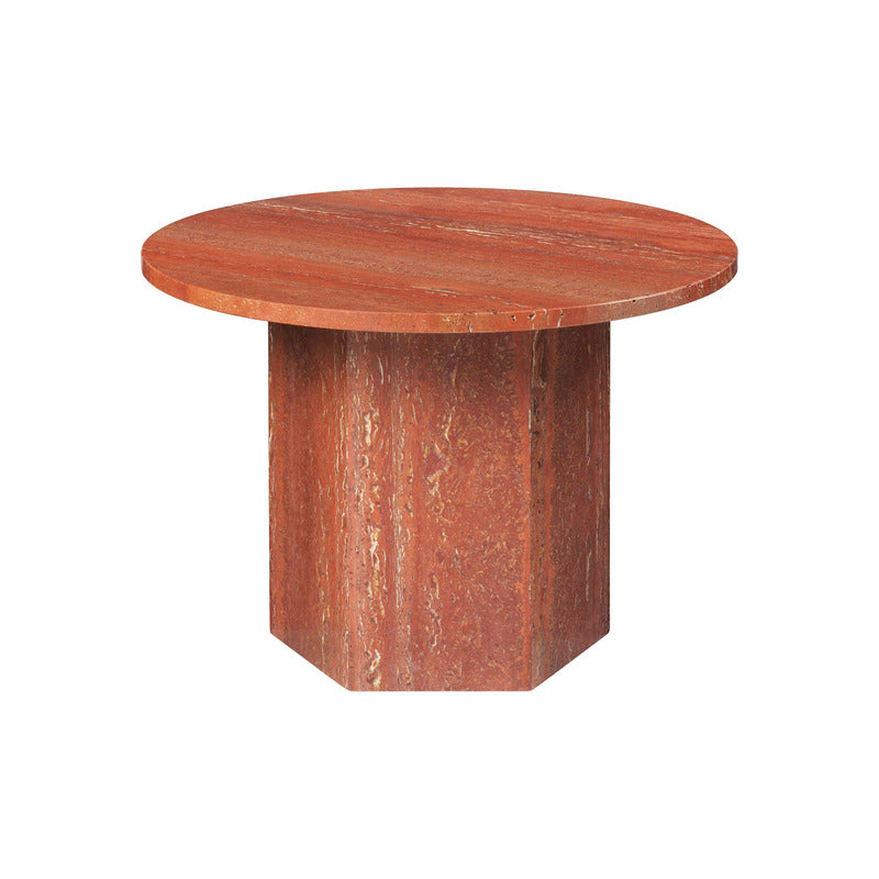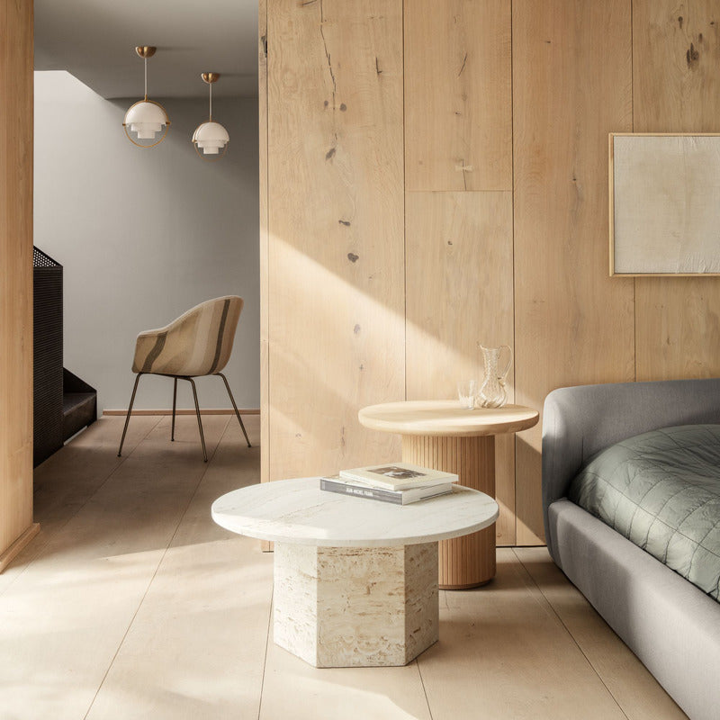 GamFratesi designed the Epic Coffee Table for GUBI as a sculptural piece of furniture inspired by Greek columns and Roman architecture and named after the epic poems of ancient times.Made from travertine stone, the monolithic form emphasizes the materiality of the stone, the natural beauty of its veins, and the vibrant texture of its unique patina ¨C in which a new detail can be discovered with every use.