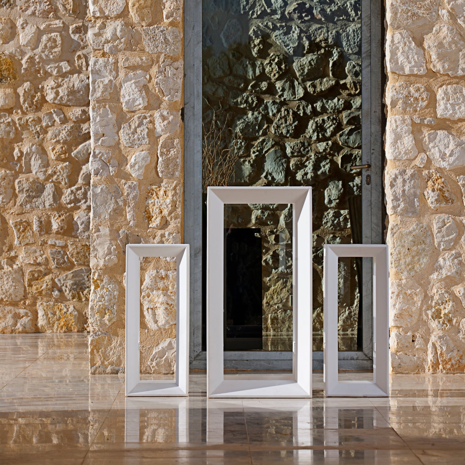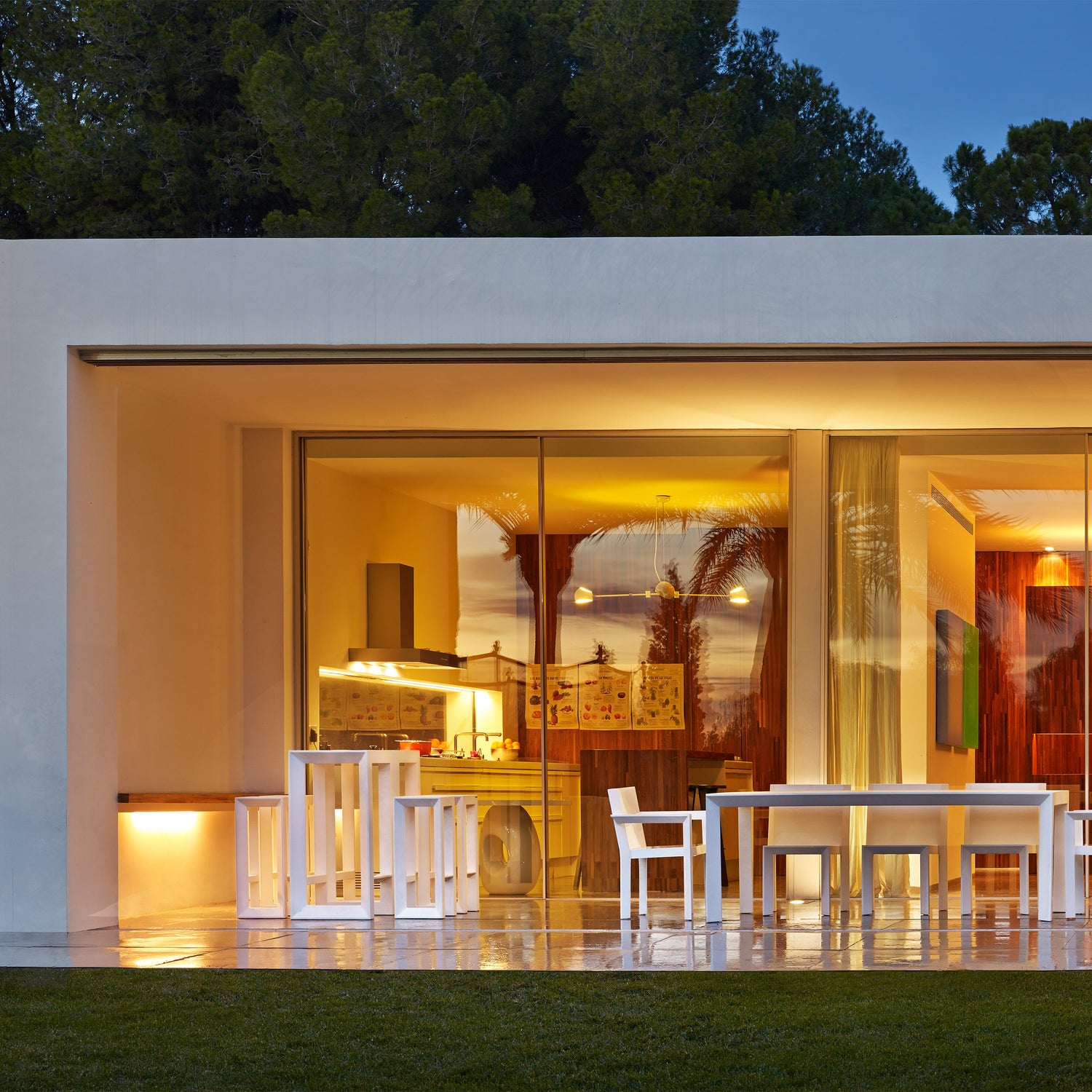 FRAME Collection comes from generating serene and timeless shapes using the framework as elementary geometry. The endless possibilities offered by the material using advanced technology, was the motivation to explore the limits. The FRAME section is flared creating pieces of visual lightness while still categorical and resistant. FRAME meets a wide range of needs in any outdoor space thanks to its variety of pieces. The collection consists of high and low stools, benches, chairs, modular sofa, tables of various sizes, chairs and chaiselongue. The lightness of the pieces such as the armchair and chair are stackable. The chaiselongue has a reclining backrest and wheels built in the framework for a better displacement.