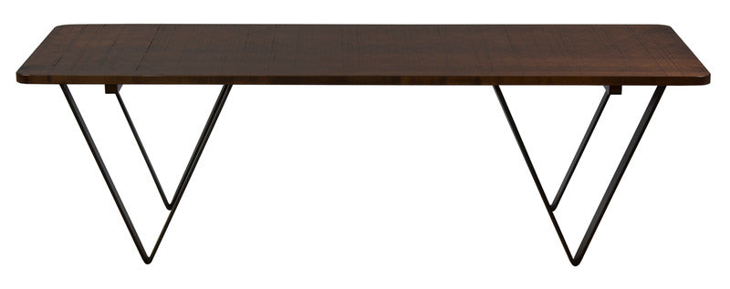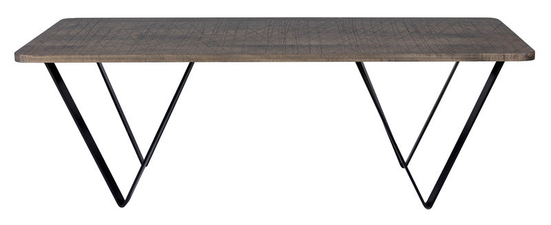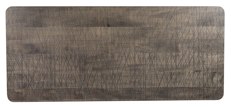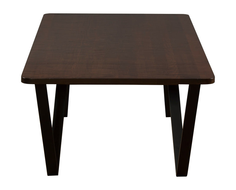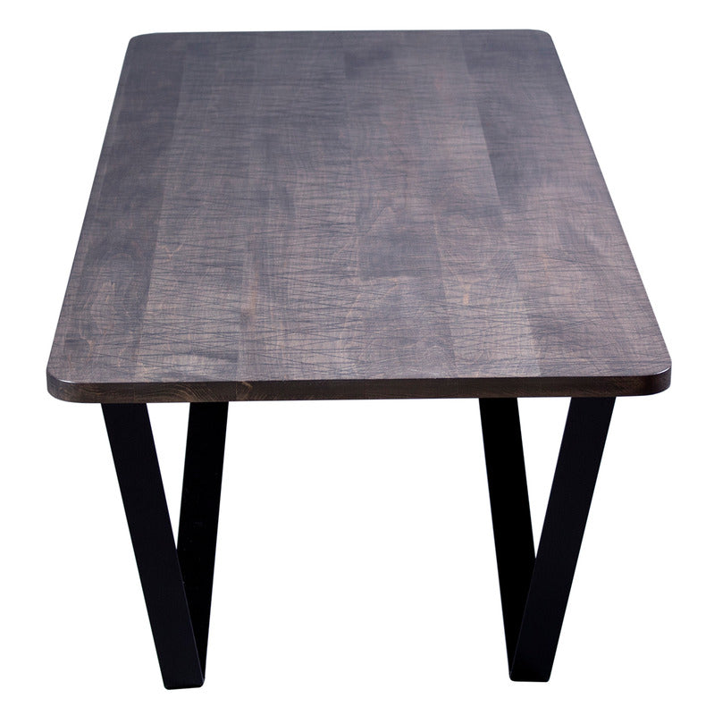A modern kinetic texture. The Etched top was inspired by our 100 -year-old factory floor which bares the scars of a century of dragging equipment around. The cross-hatched carving contrasts with the smooth grain of the solid maple top. Bent steel v-legs with a subtle twist create a modern, minimal base. Each table is designed, crafted, and finished in the USA.