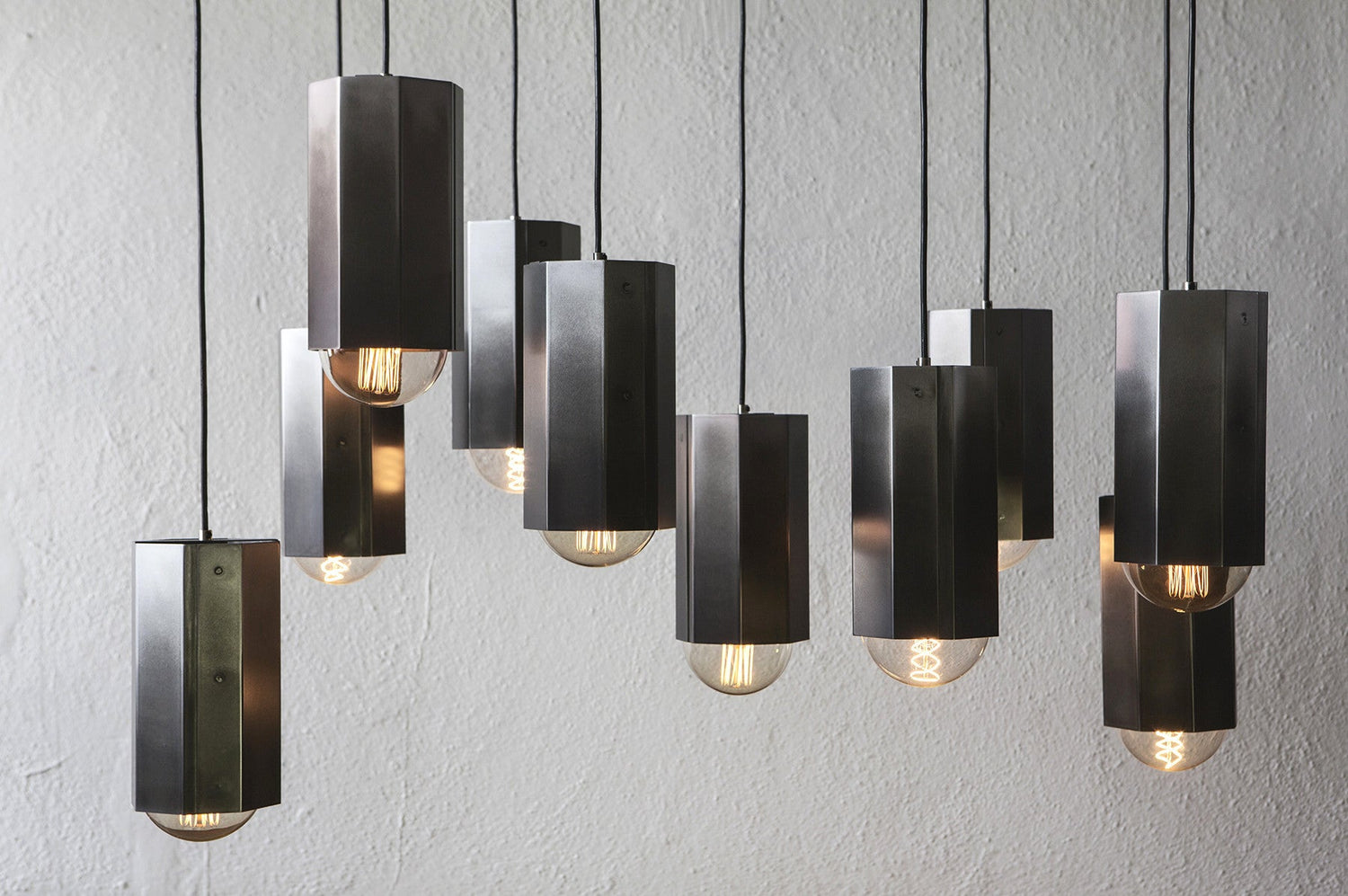 Hexes and Globes. The all new Hex Light One. Constructed of steel, then cleaned, stained and buffed by hand to create a truly unique one-off Ombre finish. The bulb position can be adjusted to be hidden inside or lowered and exposed as shown. Includes a 40W globe lamp that is a killer 4.5inches in diameter. Cluster these beauties for a great look!