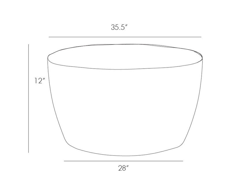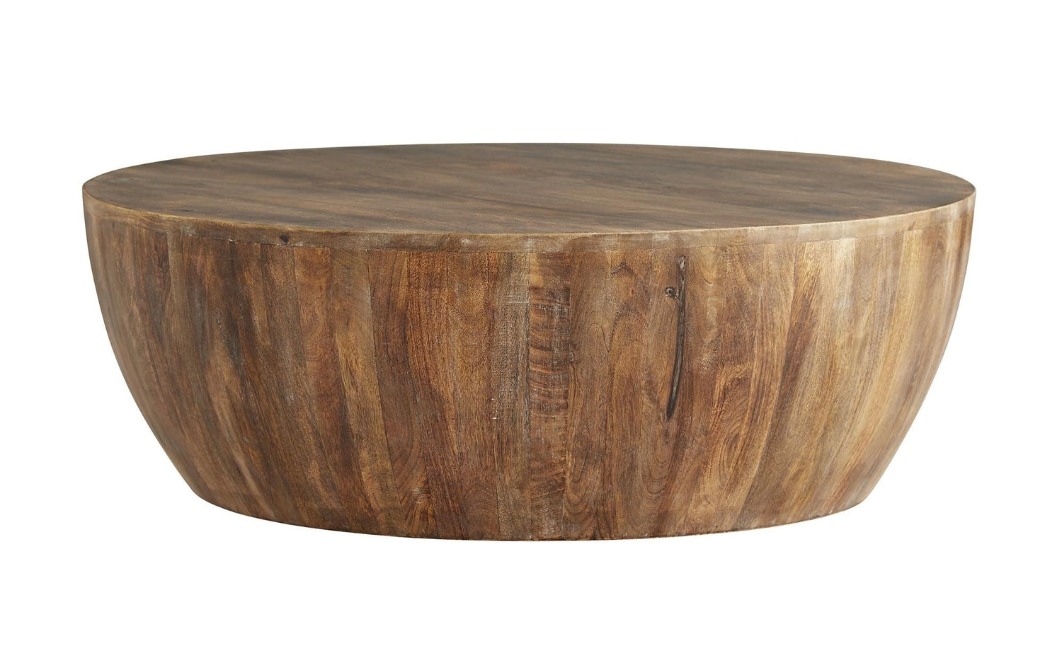 Narrow wood slats wrap up the sides of this gently curved round cocktail table. The top is solid wood and the entire table is finished in a new tobacco wash we developed specifically for this season.