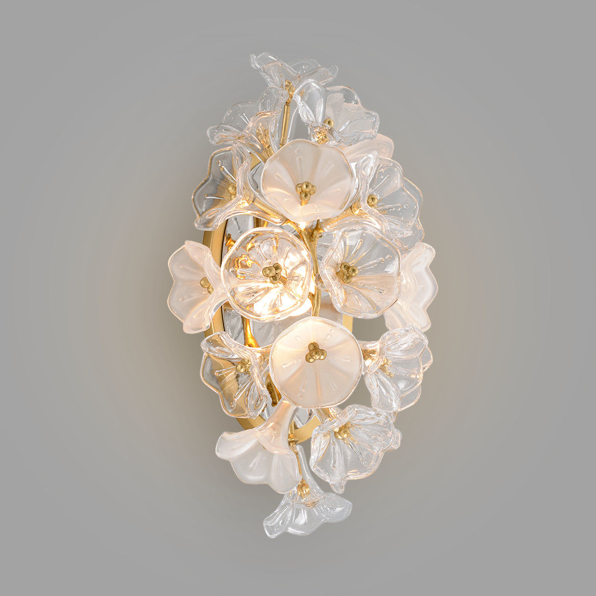 An elegant branch of metal reaches down, stemming out to support exquisite handcrafted flowers of glass, alternately translucent and frosted. Bulbs hide behind this vine in the sconces and flush mount version, shining through the glass in stunning ways. In its pendant form, this branch is suspended upside-down through a ring, lined with LED illumination along its interior. Old-world artistry and clean-lined modernism combine, in silver or gold leaf finish, for gorgeous contrast.