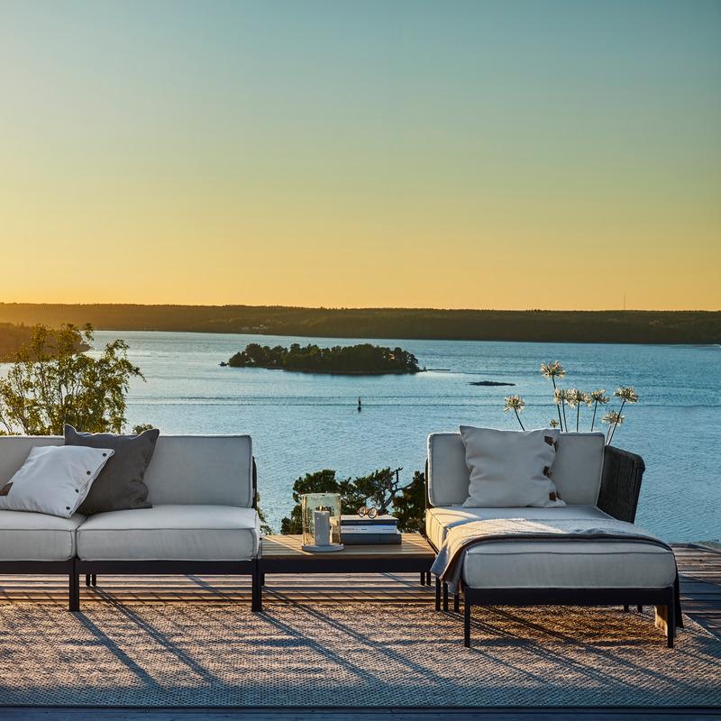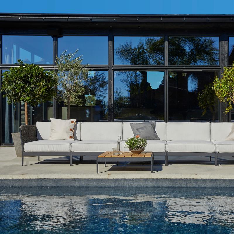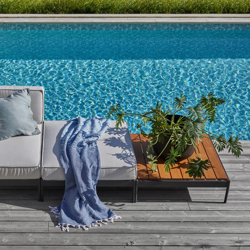 Lido Table made in aluminum, with teak top. It offers great comfort and looks as good in a garden as on a large city terrace.