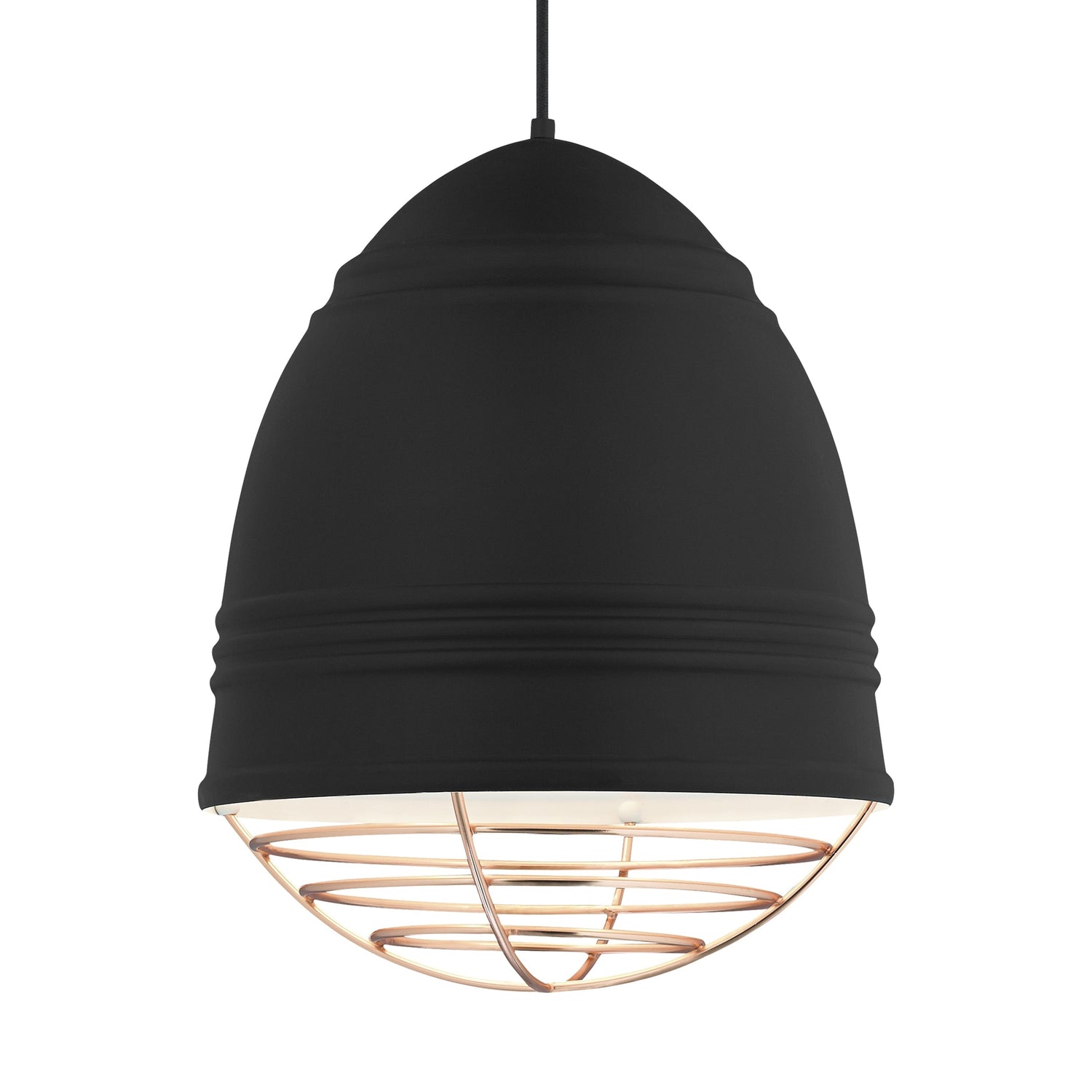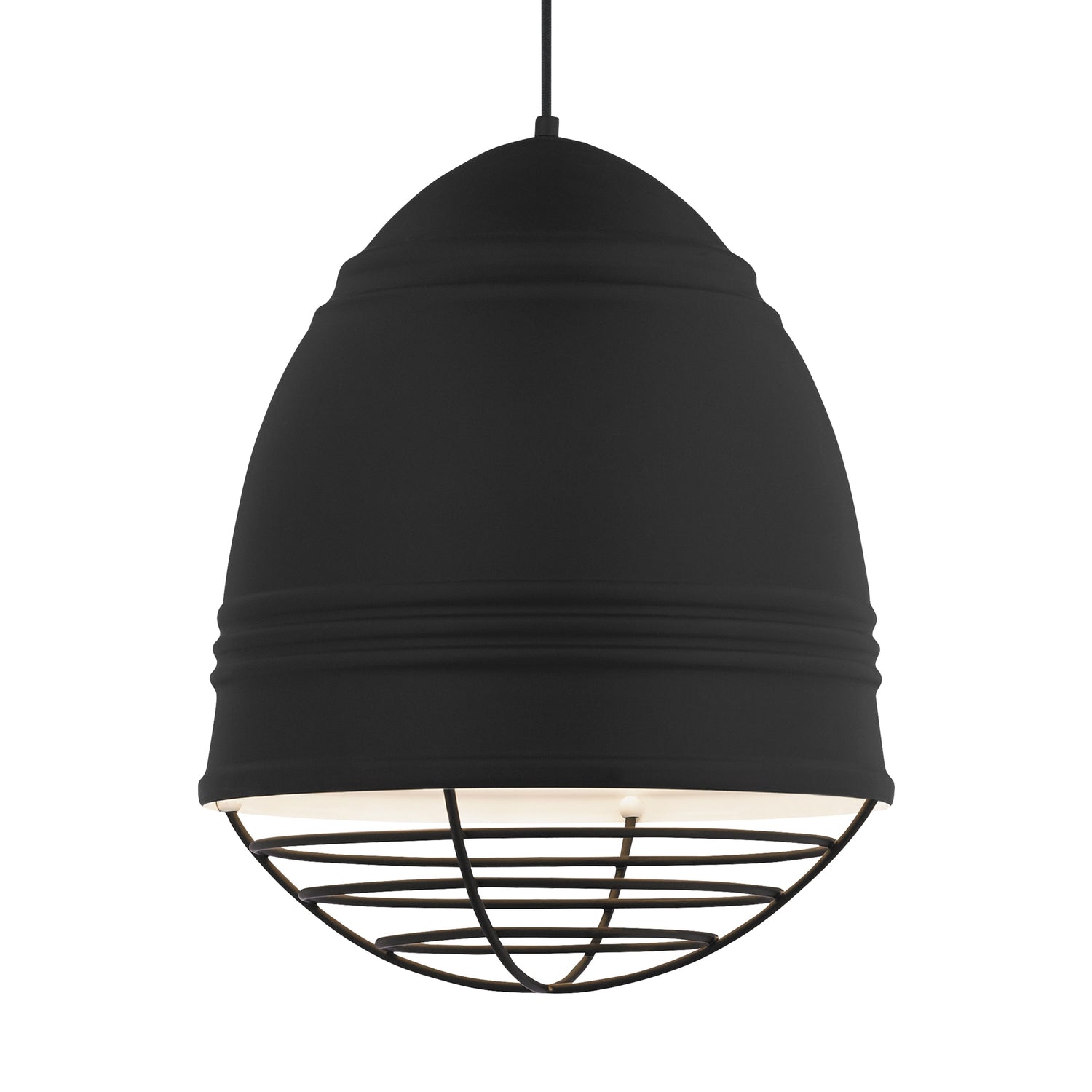 A characteristic ribbed metal shade and metallic cage combine in this stylized and elevated interpretation of industrial high bay lighting to create an amazing large-scale statement pendant light. Rubberized paint on the spun-metal shade provides a smooth, mattee finish while a choice of metallic plated cage adds a custom look with the Loft Grande pendant light from LBL Lighting.