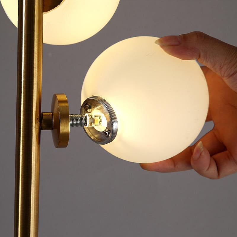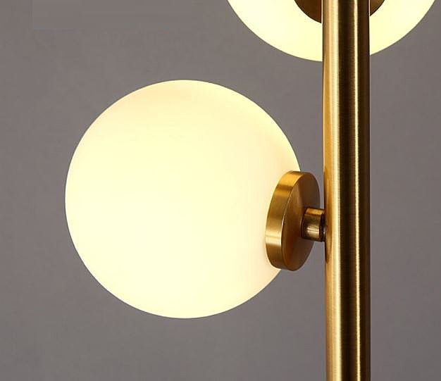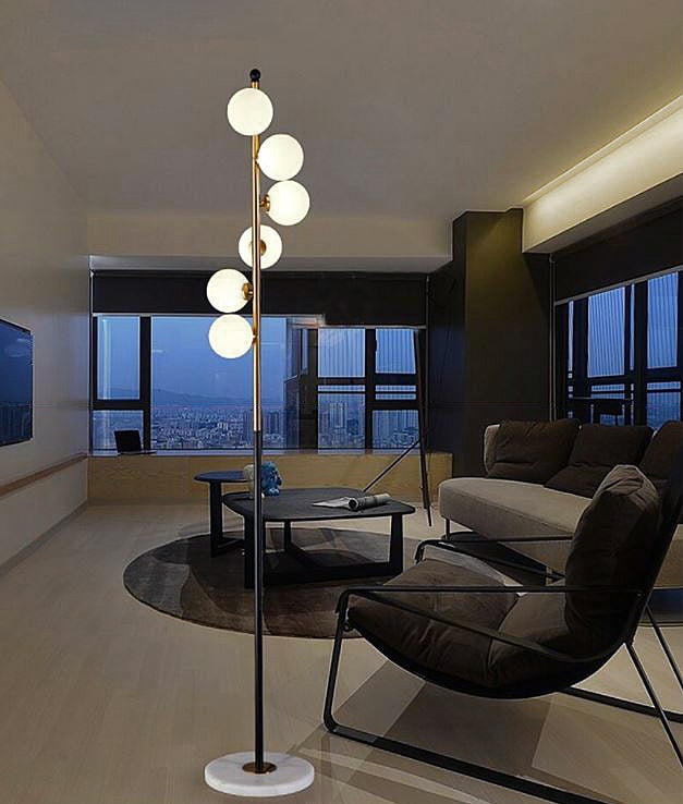 Pure modern. Wrap Orb Floor Lamp keeps you hitched with an array of artistic dimensions from top to bottom. Creating interest using six orbs that are wrapped around a long metallic column. Each of these orbs lit by LED, diffuse warm light that tranquilizes any living room, bedroom, or family space. The patterned marble base adds character while supporting the entire unit.